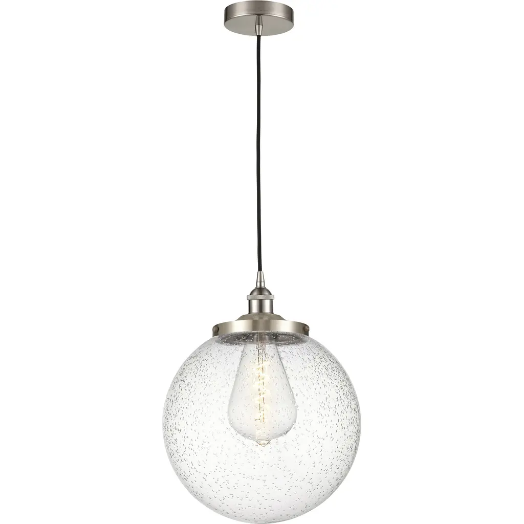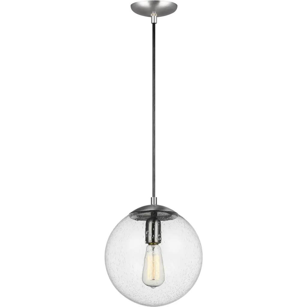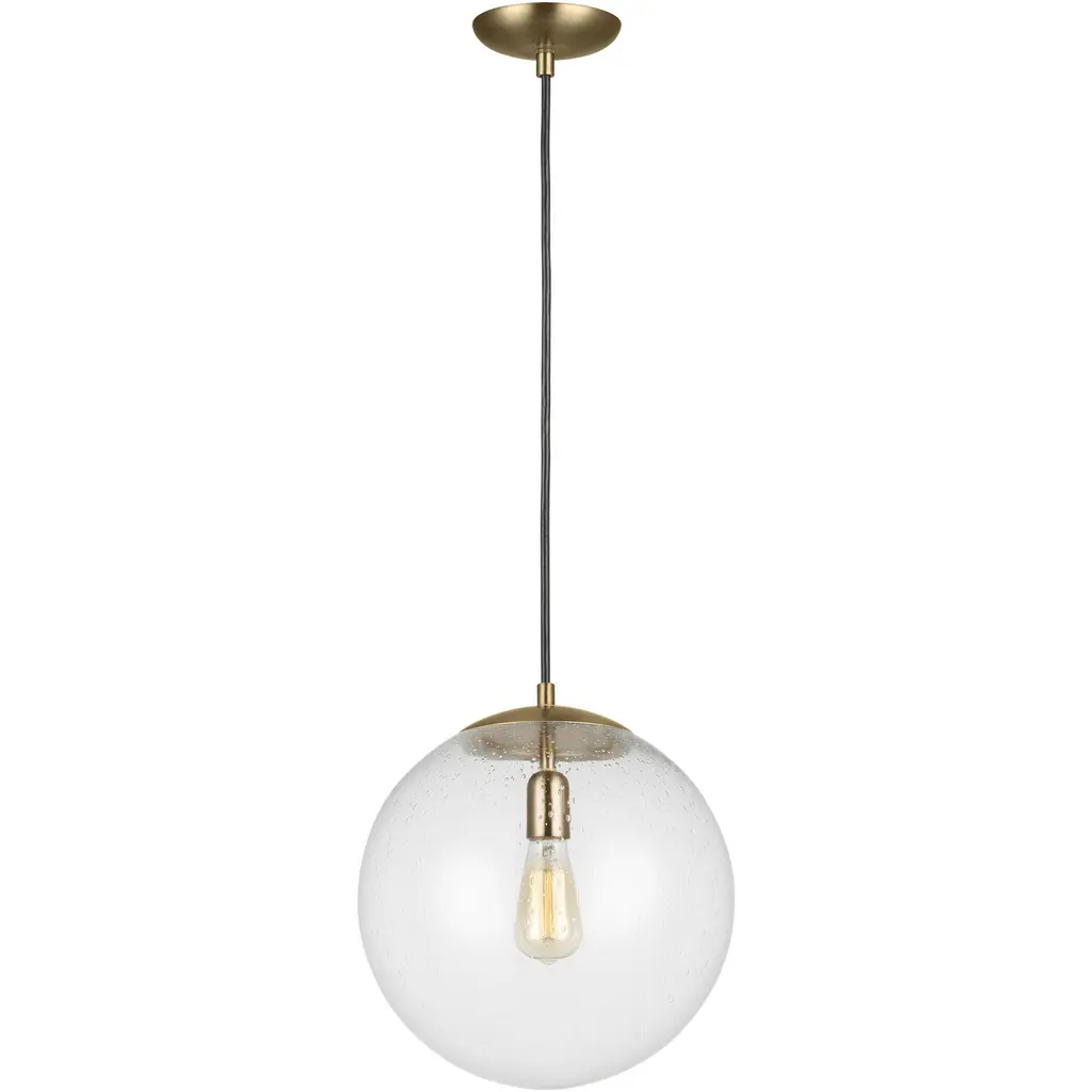 The Leo - Hanging Globe one light indoor pendant in satin aluminum is an ENERGY STAR½ qualified lighting fixture that uses LED bulbs to save you both time and money. While hanging globes are one of lighting's hottest trends, Sea Gull's timeless Leo Collection has been around for 50 years! Constantly evolving with the times, these classic pendants are now offered with NEW Clear Seeded glass and in Satin Aluminum finish. Adjustable cloth cords allow for unlimited variations of hanging heights. All glass softly diffuse the light, each fixture comes with 54?¦? of cuttable cord to customize the installation exactly to your needs. Easily convert every piece in the collection to LED by purchasing LED replacement lamps sold separately. All fixtures are qualified and California Title 24 compliant and damp rated for use in sheltered, damp environments like bathrooms, covered patios or porches.