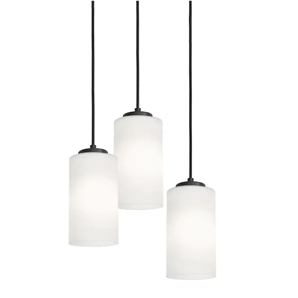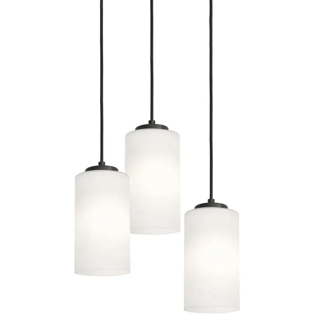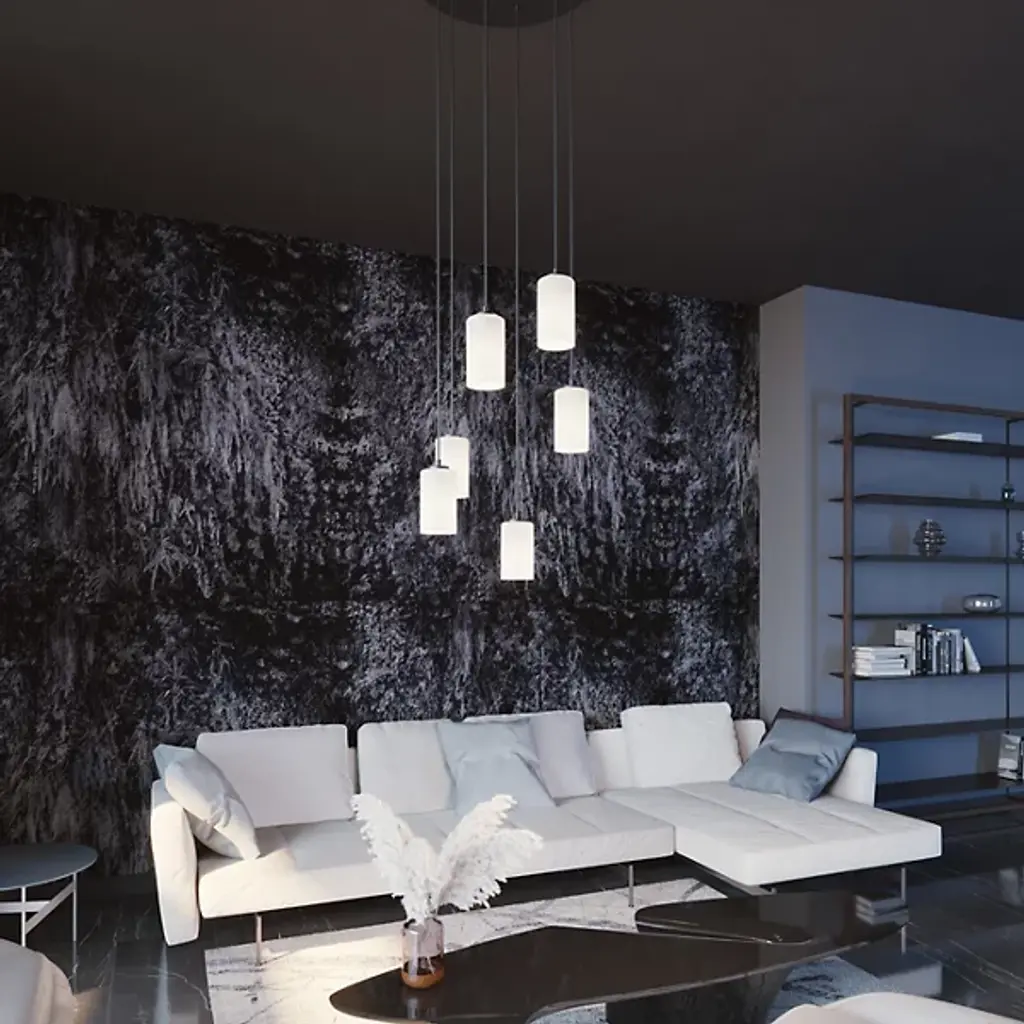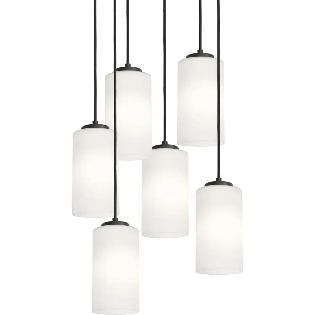 A contemporary cluster for modern spaces. The Leo Round Multi-Light Pendant by AFX Lighting has several cylindrical Glass shades suspended from a single round Steel canopy. Each shade provides a clean profile around the light bulb within, and it helps to diffuse even ambience all around a space. Adjust the suspension cords to create the staggered look you desire over a round dining table or hanging in a tall entryway or stairwell.
