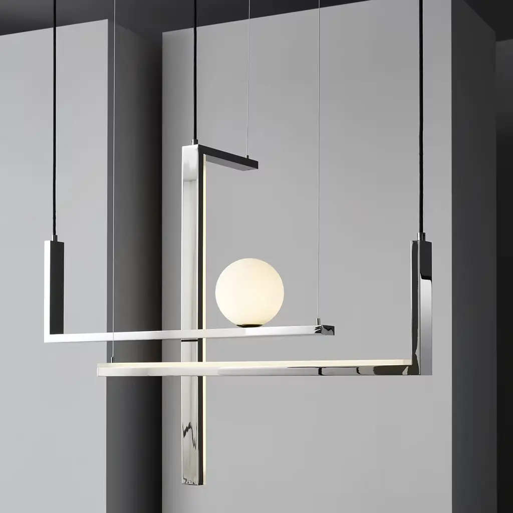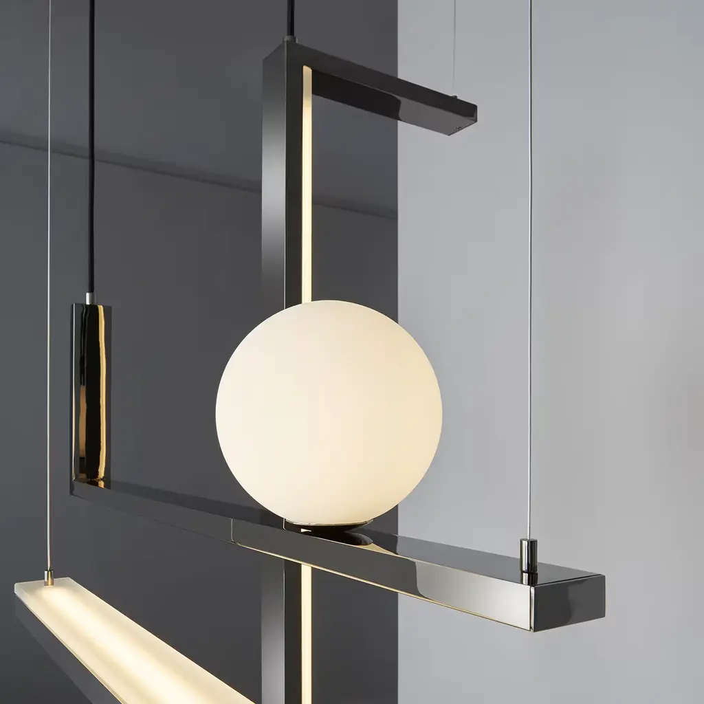 A clean and sculptural design characterizes this superb pendant lamp. Suspended from self-supporting fabric cords and steel cables (rapid fixing system), three L-shaped brass structures with a polished black nickel finish form the intriguing silhouette that will enliven any interior. The diffused light is emitted by LED strips and diffused by glass spherical shade supporting each LED light bulb (not included) max 12W with 24V and 1250lm. Contract and commercial certifications available upon request.