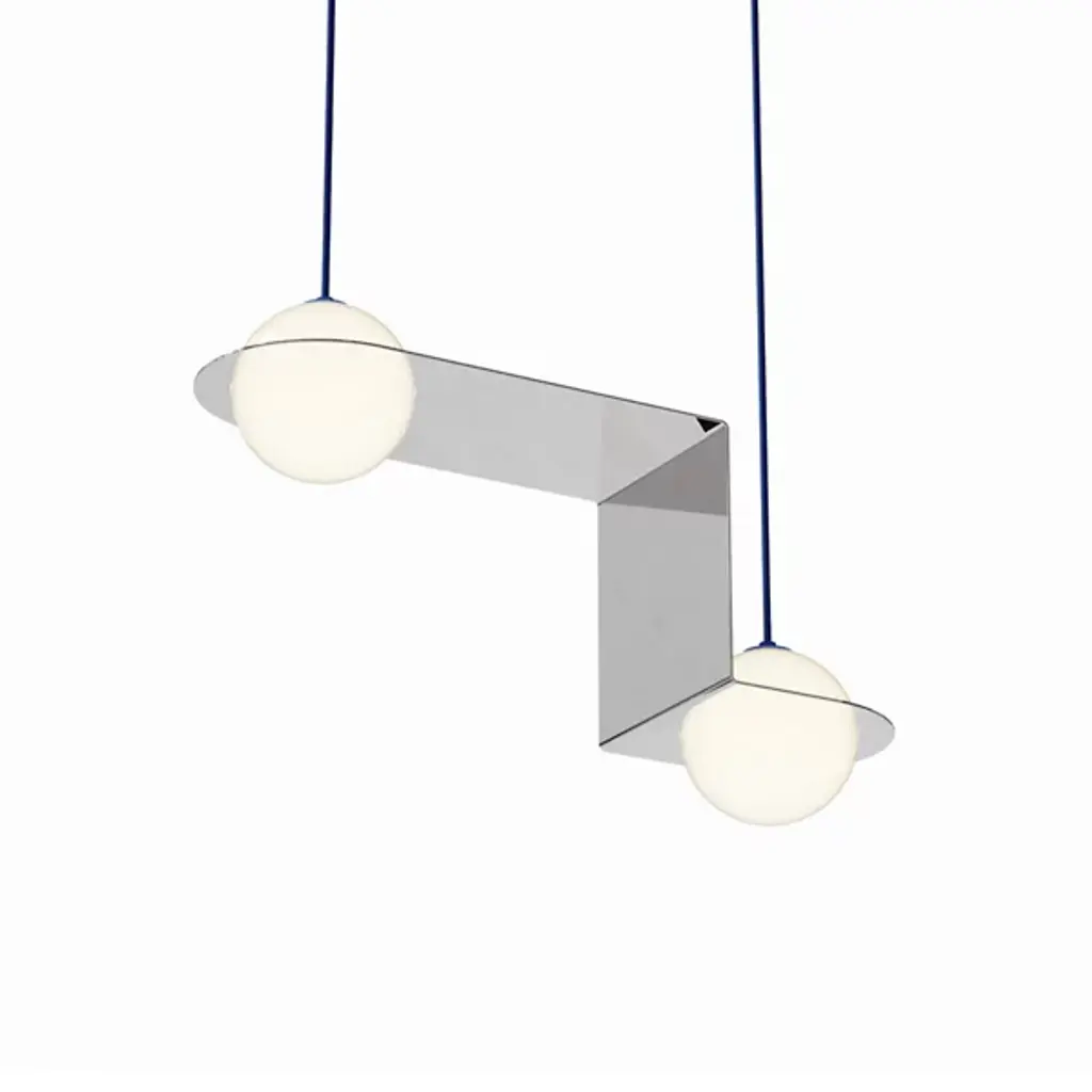 This pendant lamp is an exercise in shapes and balance, comprising three elements interacting in a striking composition suspended on self-supporting black fabric cords and steel cables with a rapid fixing system. This modern piece is enriched with two satin-blown glass spherical shades, emitting a diffused light, and supporting LED bulbs (not included) G9 max 5W of 350lm and 2700°K, while the LED strip is of max 12W, 24V with 1250lm and 2700°K. Boasting a burnished natural brass finish, this piece is also available in matte black nickel and polished black nickel, please ask the Concierge for details.