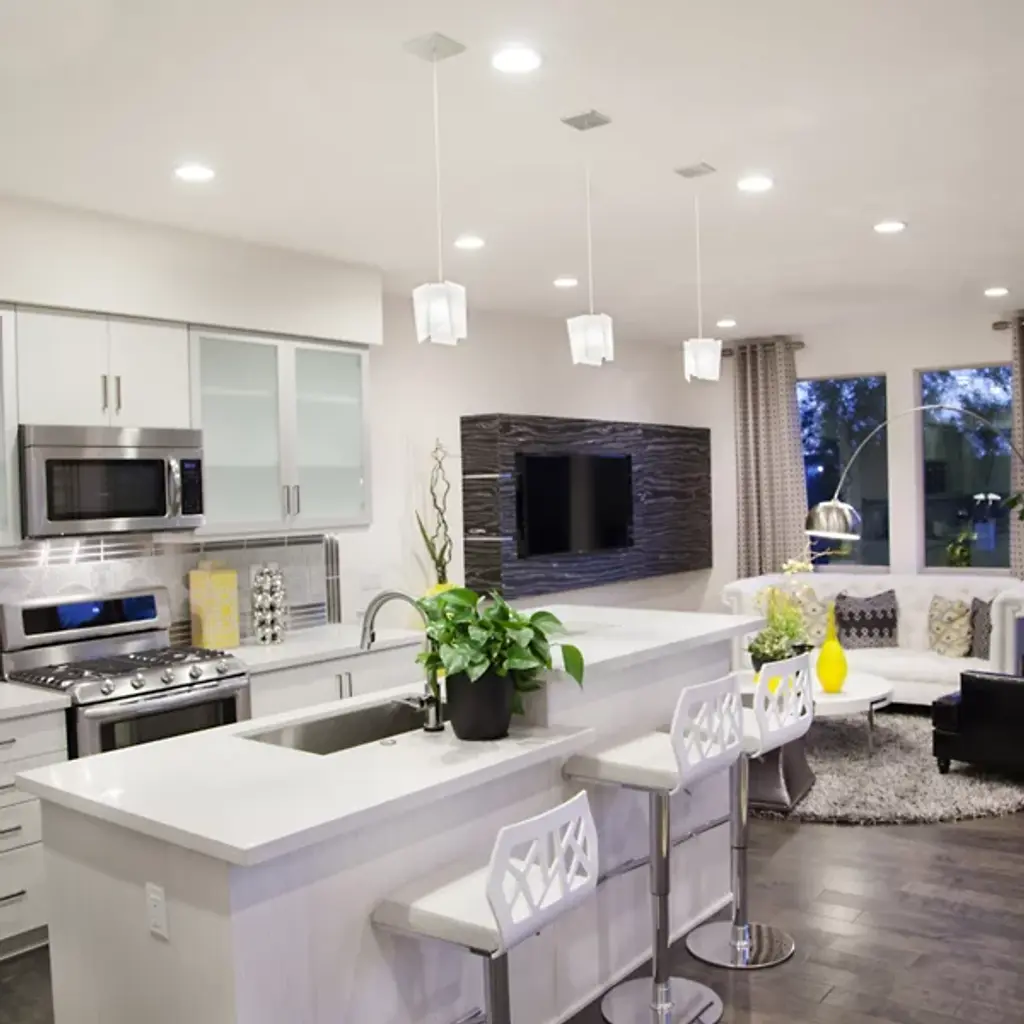 The Cerno Levis LED Mini Pendant features a distinctive, fractal shade composed of several individual polymer panels that contribute a stunning geometry for modern spaces. In addition to having a sharp, sculptural presence, these panels create a unique play of light, with the warm or cool LED light source peeking through the openings while also providing down light. The two canopy options provide flexibility when installing the Levis—both requiring space for the included LED driver. Use the extended canopy option when adequate junction box space is not available. The low canopy option still requires space in the junction box for the included LED driver, but is a more standard, slimmer option.