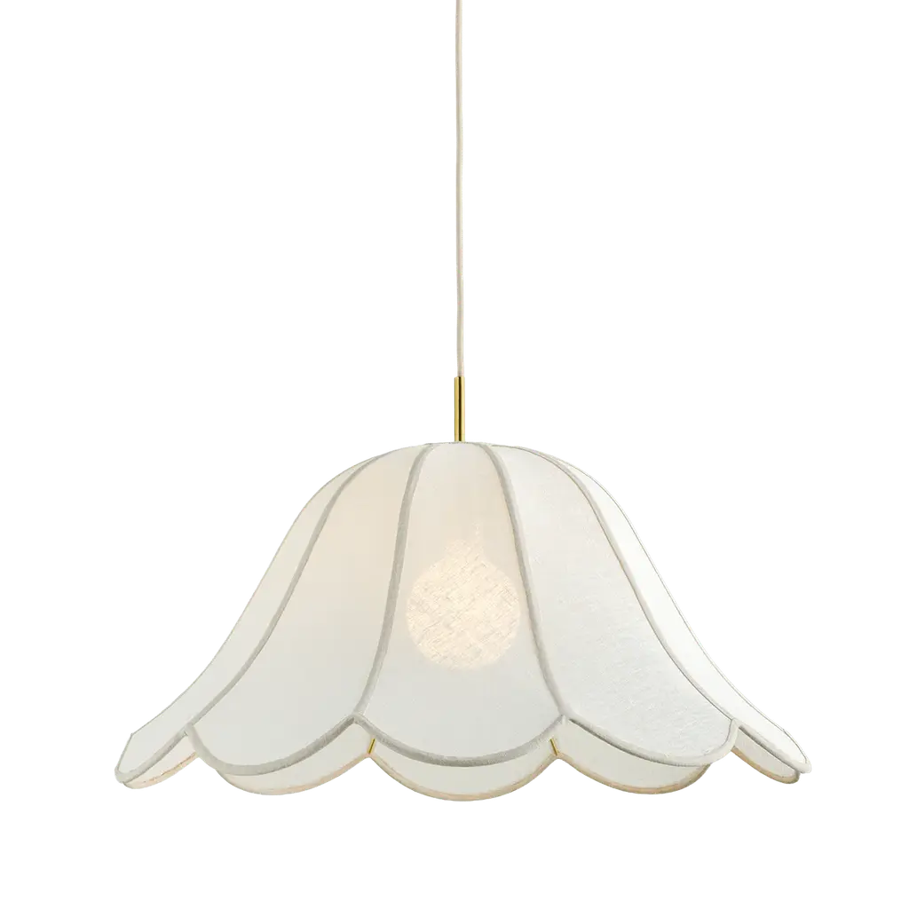 Layers of ivory faux silk shades appear suspended in mid-flutter, shaping our graceful pendant light. Lightly pleated with countless slender folds that add to the dynamic look, the shade calls to mind a blooming flower or the swirling skirts of a dancer. Light filters softly through the pendant's layered shades, highlighting the gleam of the pendant's burnished brass hardware. With an ivory cloth cord that completes the airy, ethereal look, Lia floats beautifully above a dining table or in a living room or bedroom.
