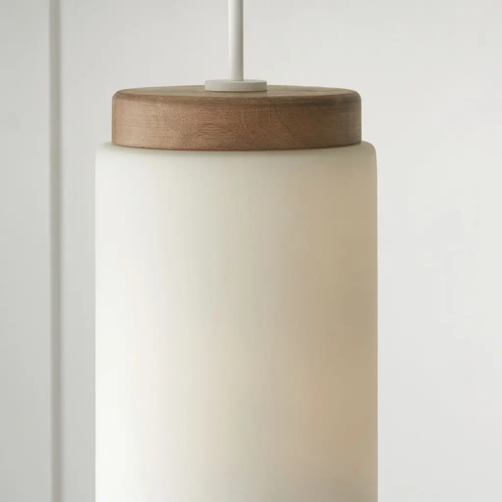 Mango wood and modern design form the Liam Cylinder Pendant. The Cylindrical Soft White glass shade combined with the Matte White finish make a sophisticated combo, while the Light Wood details create a visual balance for natural Scandinavian style.
