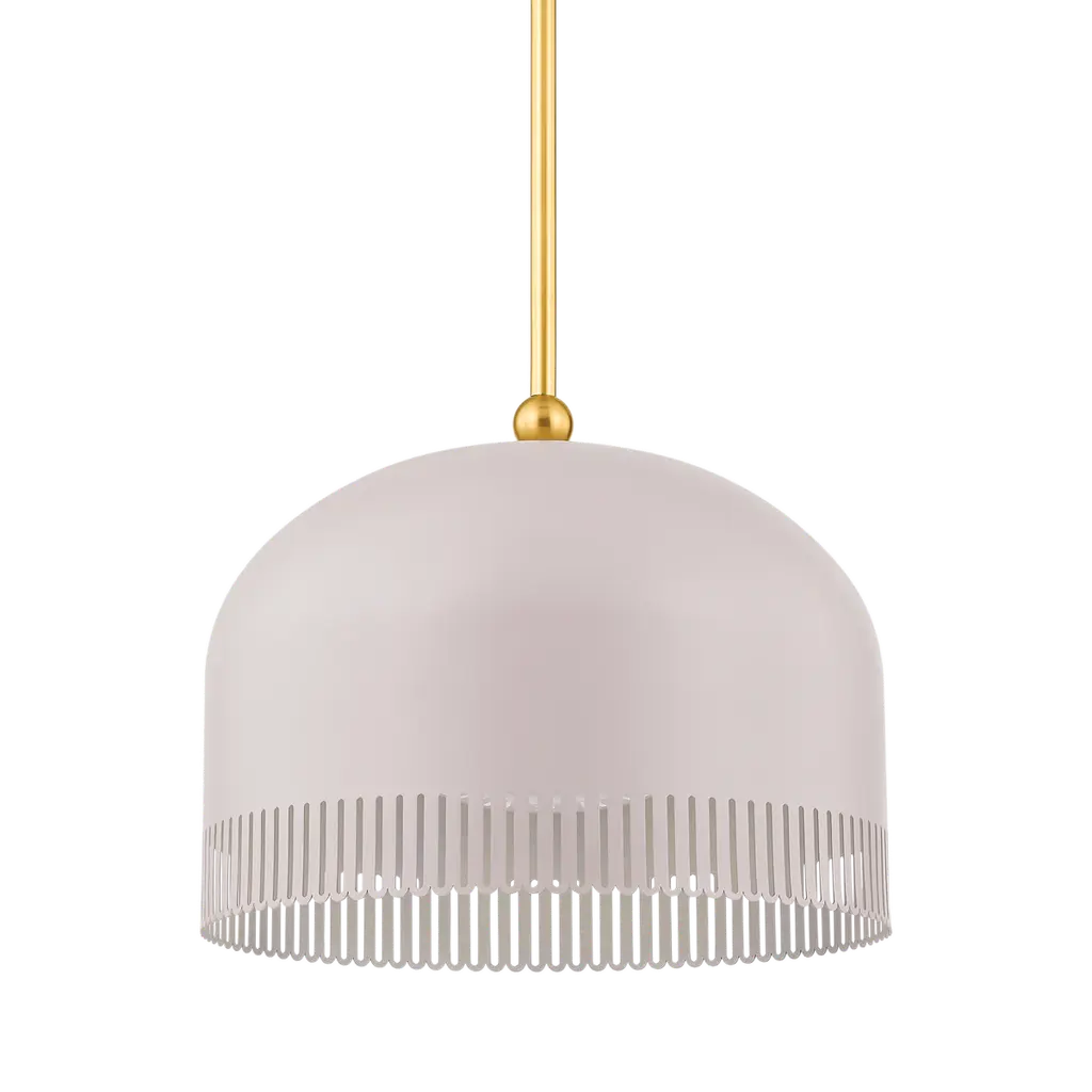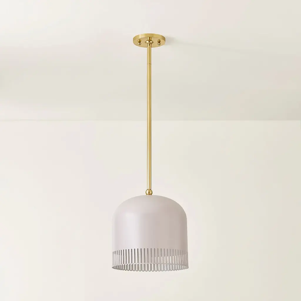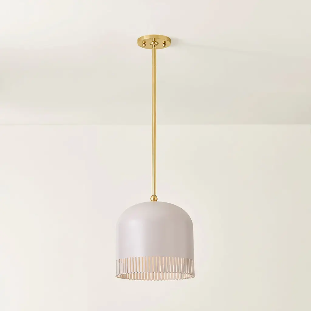 A visual treat, Liba features classic forms updated with eye-catching details. Known for her color sensibility, Zoe Feldman has added a playful touch to this fixture with its unique hue. The warm neutral has a hint of pink that creates a calming, inviting presence which is complemented by the Aged Brass framework. The slender scalloped edges of the fixture allow light to shine through while adding a whimsical note. Available as a 1 or 2-light sconce and a pendant in two sizes, Liba is a thing of beauty. Part of our Zoe Feldman collection.