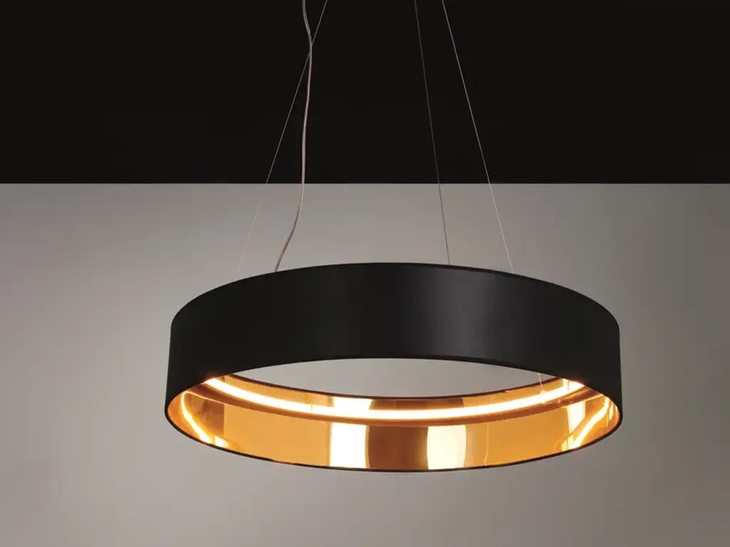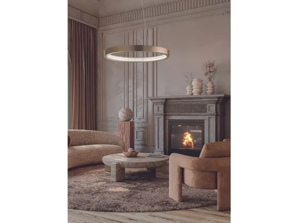 Libe Round S140 is a LED suspension lamp.Electrical characteristicsLEDX144W CRI>90 3000K 13536LMLEDX144W CRI>90 2700K 12850LMDIMMABLE 1-10VCE LEDETL LEDCCC LEDCB SCHEME LEDLamp in burnished brass. The diffusion of light is amplified by opaque crystal lozenges. Chromed metal base.