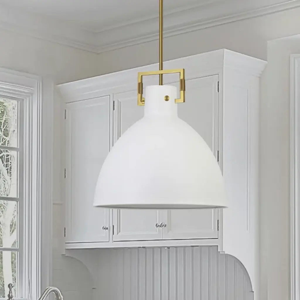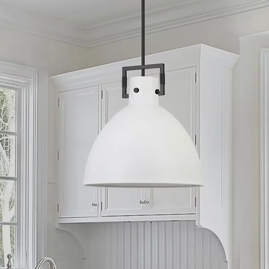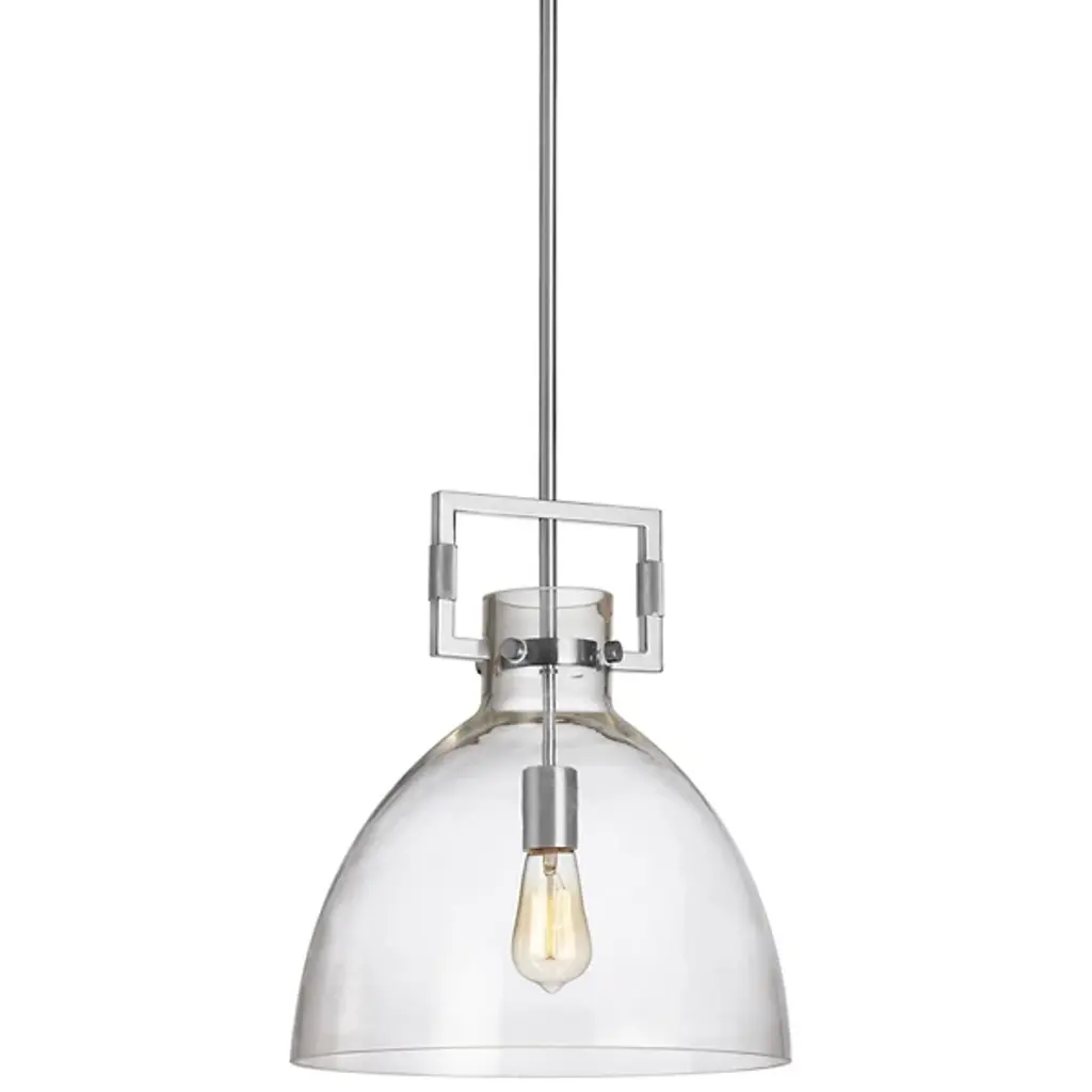 The Liberty Pendant by Dainolite has a simple, clean composition that is elevated thanks to some thoughtful details. Supported by a sleek down rod, a smooth, dome-shaped glass shade surrounds a single, visible light source to lend a bright touch to spaces. The top of the shade is wrapped with a metal band that has minimal hardware details and is also accented with an openly styled, rectangular piece that adds a neat, geometrical touch to this design.