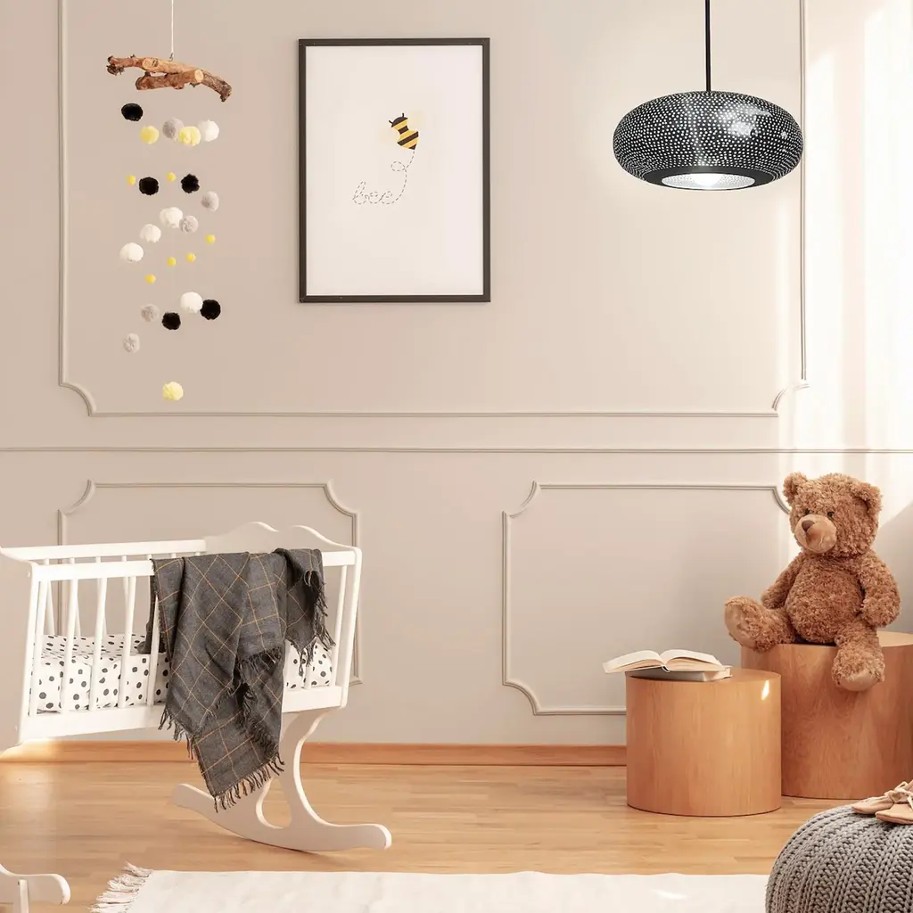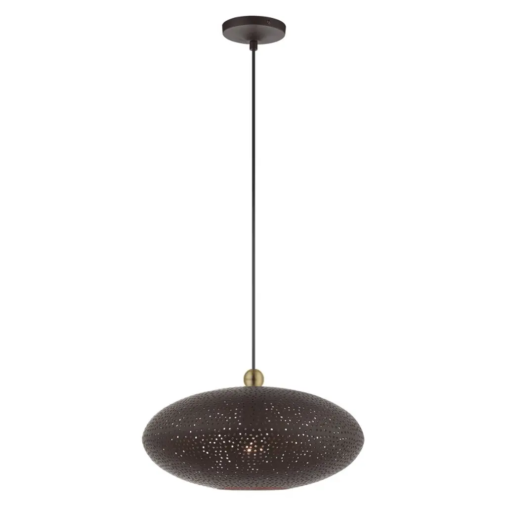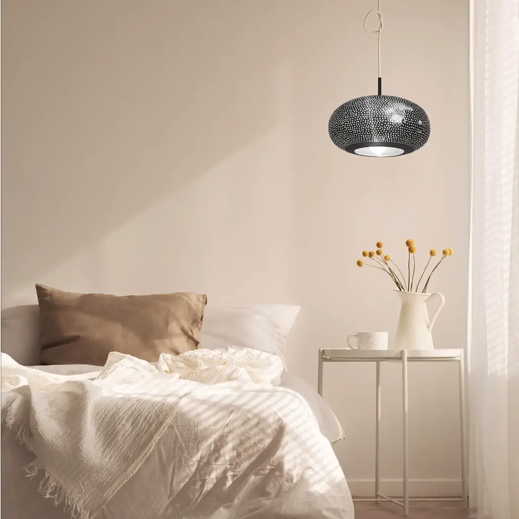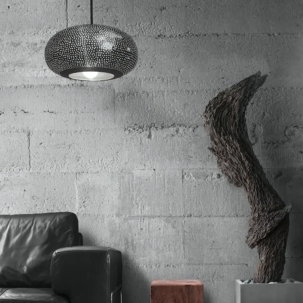 The Lila Black Drop Ceiling Light is a modern designer fixture that is handmade in Morocco by master artisans. The drop ceiling lights have a pierced pattern from which light is cast. The led lighting produces a focused glow from the bottom of the fixtures and fit well in a modern kitchen. Match the metal material with existing kitchen or bedroom finishes to tie together a contemporary home decor look.The light fixture arrives ready to install with a matching ceiling cup and an adjustable cord.