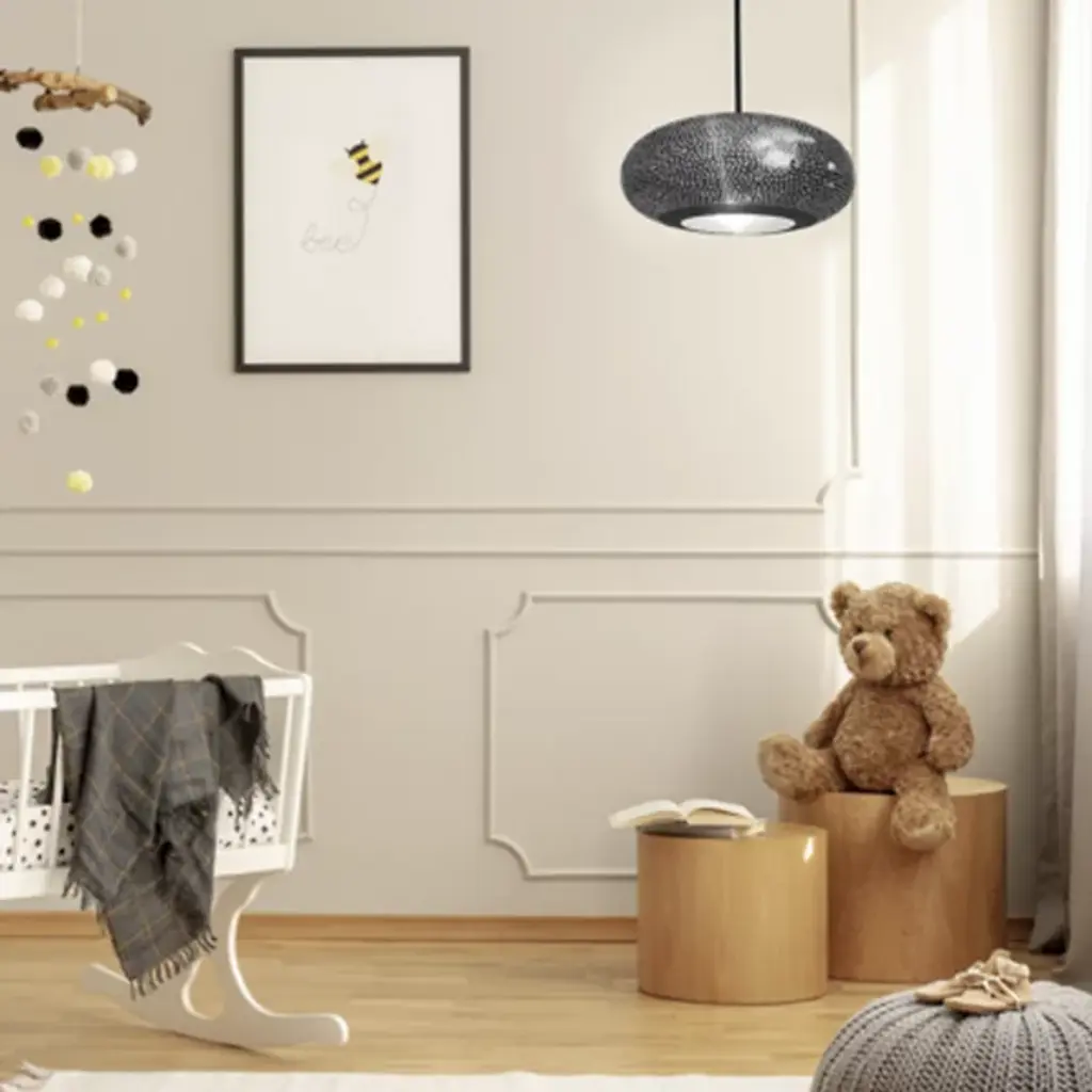 Time-tested craftsmanship revitalized using a contemporary form. The Lila Pendant from Dounia Home enchants in the air as a bevy of hand punctured holes made in the Moroccan tradition cast a magical design across your walls. Dounia Home goes for authentic authenticity in each of their pieces. They fuse the ancient arts of Morocco with today’s simple, refined taste. You get this refined feel from the suspension alone, one underlined by a low-profile canopy and a braided cloth cord. Popping in the air as a globe form, the recycled aluminum shade brings a touch of shine that resonates with or without the lights on. The sleek surface of the metal is textured by Marrakesh artisans using a hand-punctured technique. With the holes wrapping the globe, light exits through them, casting a magical design over nearby walls. The filtered ambient glow pairs with a generous down glow exiting through the circular opening at the base.
