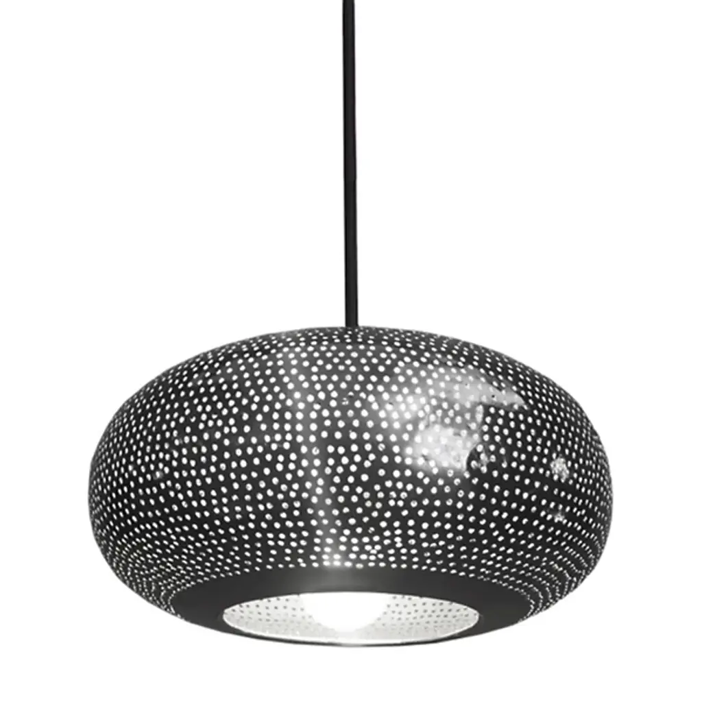 Time-tested craftsmanship revitalized using a contemporary form. The Lila Pendant from Dounia Home enchants in the air as a bevy of hand punctured holes made in the Moroccan tradition cast a magical design across your walls. Dounia Home goes for authentic authenticity in each of their pieces. They fuse the ancient arts of Morocco with today’s simple, refined taste. You get this refined feel from the suspension alone, one underlined by a low-profile canopy and a braided cloth cord. Popping in the air as a globe form, the recycled aluminum shade brings a touch of shine that resonates with or without the lights on. The sleek surface of the metal is textured by Marrakesh artisans using a hand-punctured technique. With the holes wrapping the globe, light exits through them, casting a magical design over nearby walls. The filtered ambient glow pairs with a generous down glow exiting through the circular opening at the base.