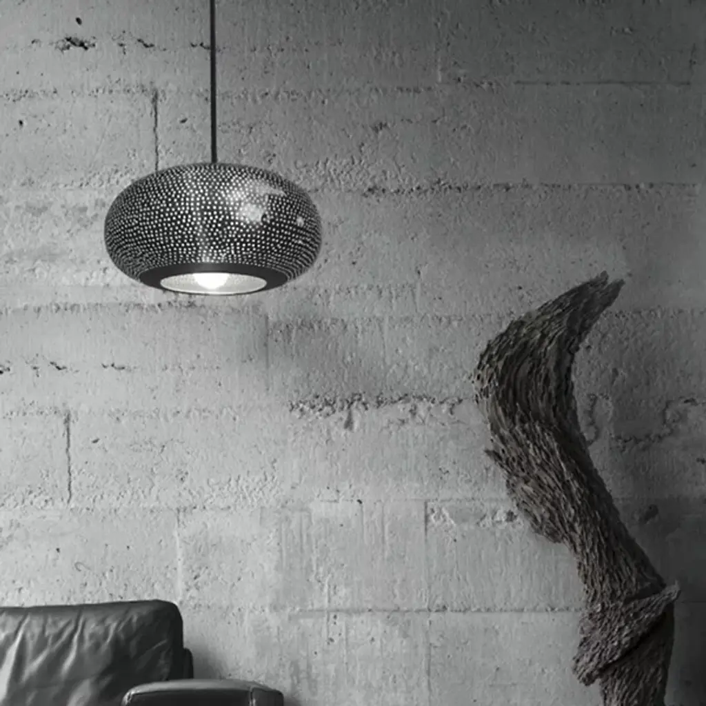 Time-tested craftsmanship revitalized using a contemporary form. The Lila Pendant from Dounia Home enchants in the air as a bevy of hand punctured holes made in the Moroccan tradition cast a magical design across your walls. Dounia Home goes for authentic authenticity in each of their pieces. They fuse the ancient arts of Morocco with today’s simple, refined taste. You get this refined feel from the suspension alone, one underlined by a low-profile canopy and a braided cloth cord. Popping in the air as a globe form, the recycled aluminum shade brings a touch of shine that resonates with or without the lights on. The sleek surface of the metal is textured by Marrakesh artisans using a hand-punctured technique. With the holes wrapping the globe, light exits through them, casting a magical design over nearby walls. The filtered ambient glow pairs with a generous down glow exiting through the circular opening at the base.