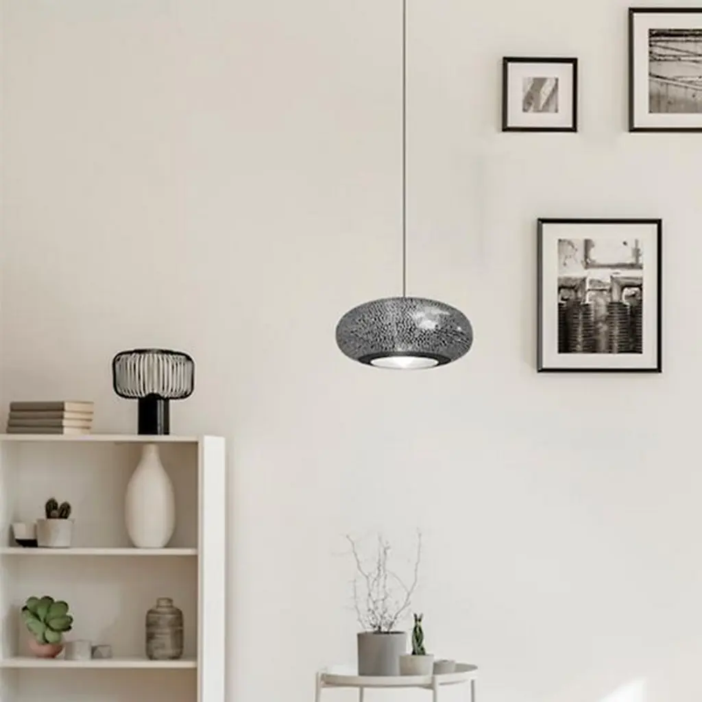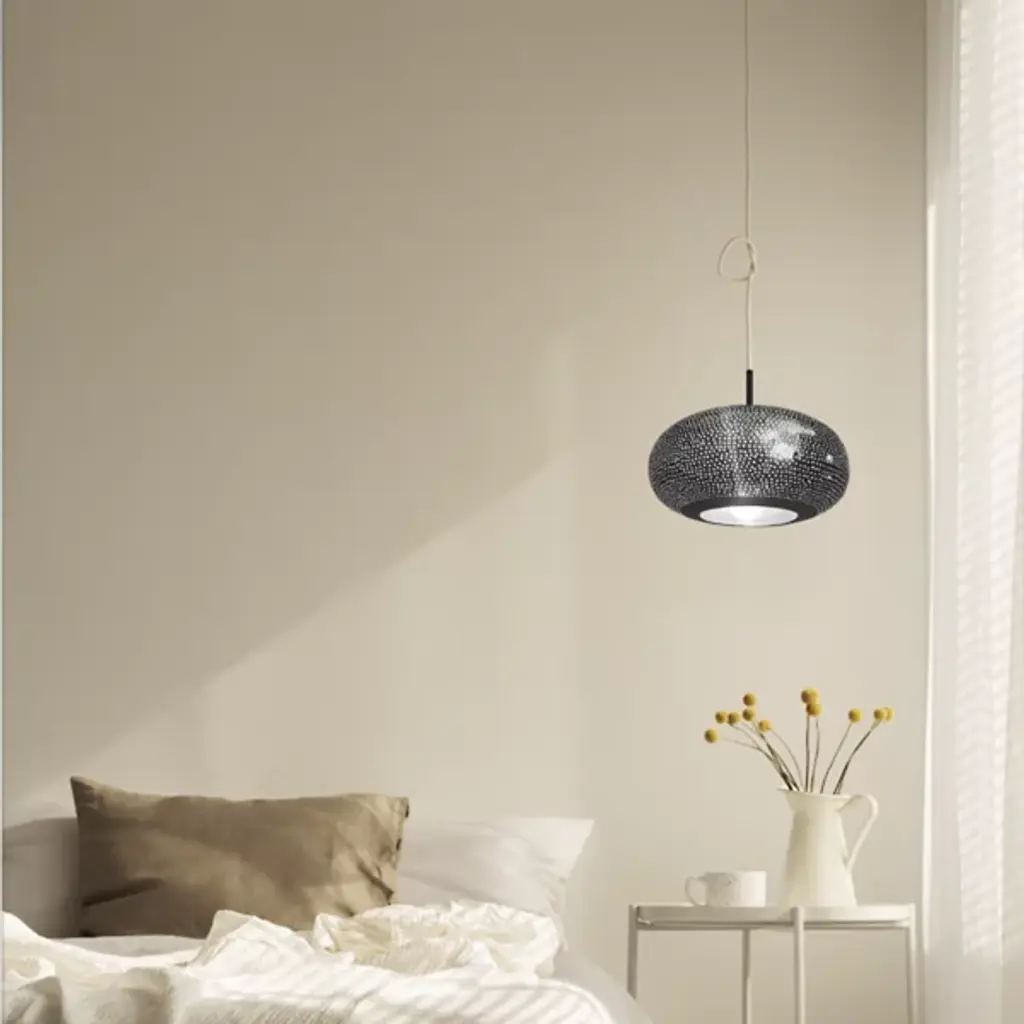 Time-tested craftsmanship revitalized using a contemporary form. The Lila Pendant from Dounia Home enchants in the air as a bevy of hand punctured holes made in the Moroccan tradition cast a magical design across your walls. Dounia Home goes for authentic authenticity in each of their pieces. They fuse the ancient arts of Morocco with today’s simple, refined taste. You get this refined feel from the suspension alone, one underlined by a low-profile canopy and a braided cloth cord. Popping in the air as a globe form, the recycled aluminum shade brings a touch of shine that resonates with or without the lights on. The sleek surface of the metal is textured by Marrakesh artisans using a hand-punctured technique. With the holes wrapping the globe, light exits through them, casting a magical design over nearby walls. The filtered ambient glow pairs with a generous down glow exiting through the circular opening at the base.