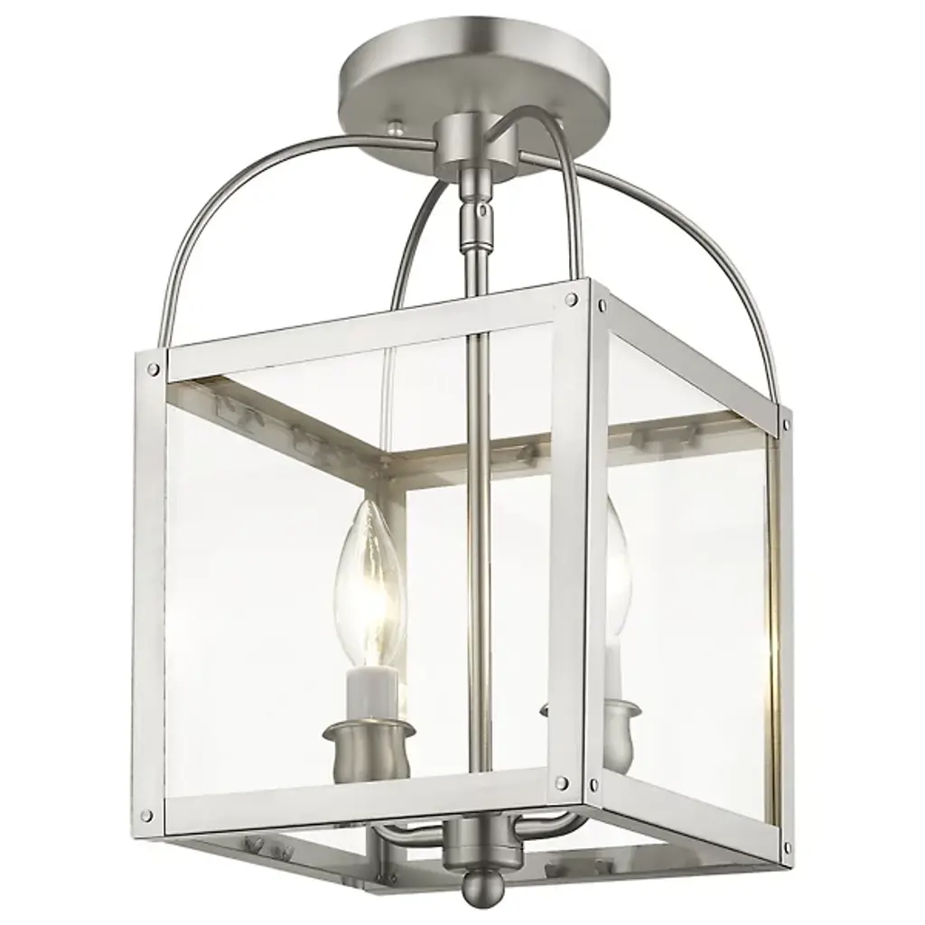 The Lillian 2 Light Flushmount / Mini Pendant by Alder & Ore has a clean composition and transitional feel that is at home in a range of locations. Supported from a round canopy by a single stem that travels throughout this entire design, a pair of candelabras are set within a hand-worked steel frame that houses glass panels. Topped with curved metal rods and accented with a simple, spherical element at its base, the crisp lines and graceful curves found throughout this fixture are dressed up with a handsome finish.