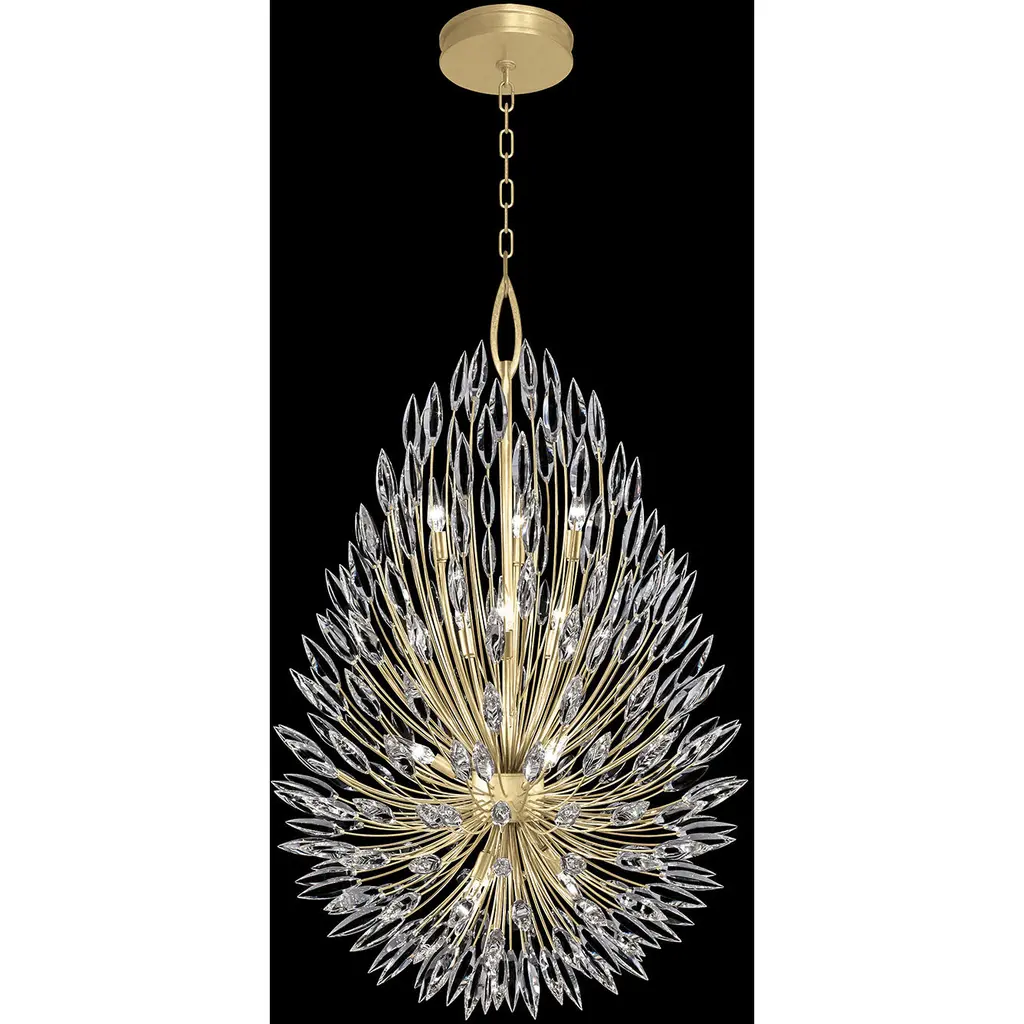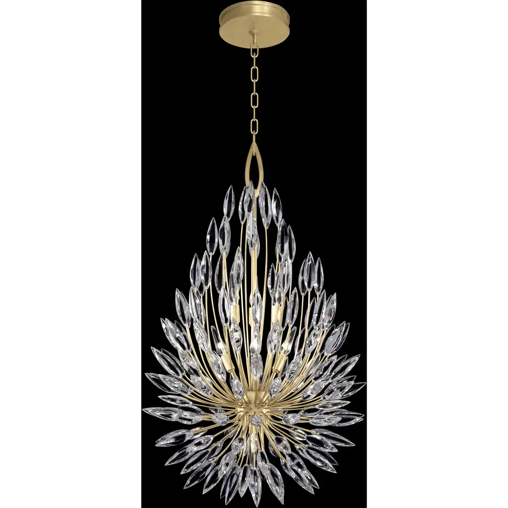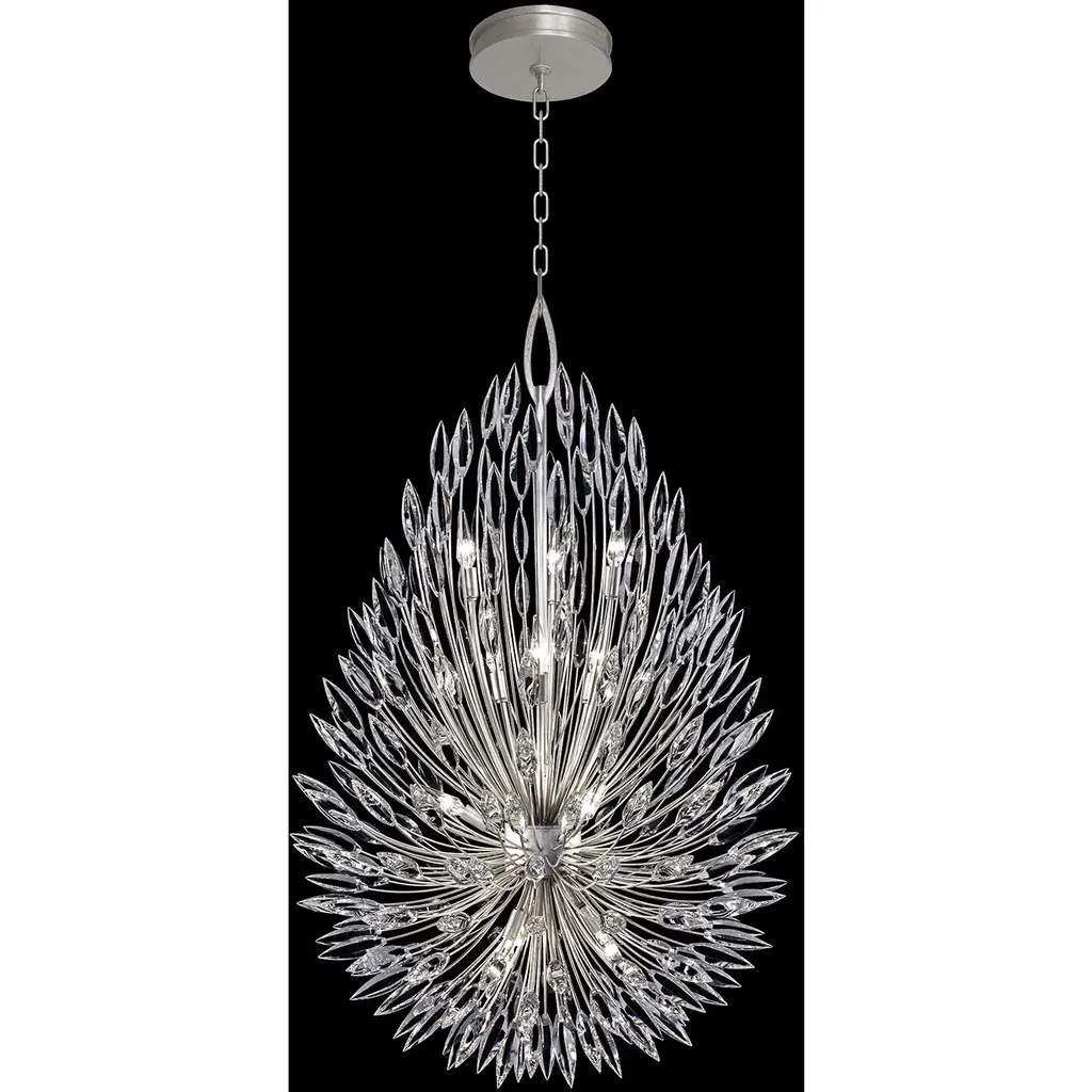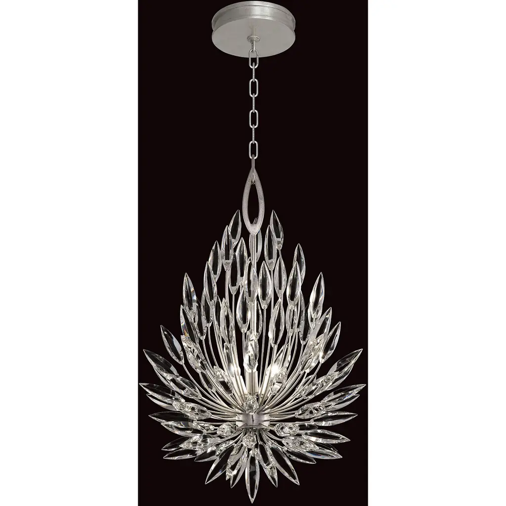 Pendant in silver leaf finish with graceful bouquets of faceted crystal lily buds that create a naturally elegant lighting effect.
