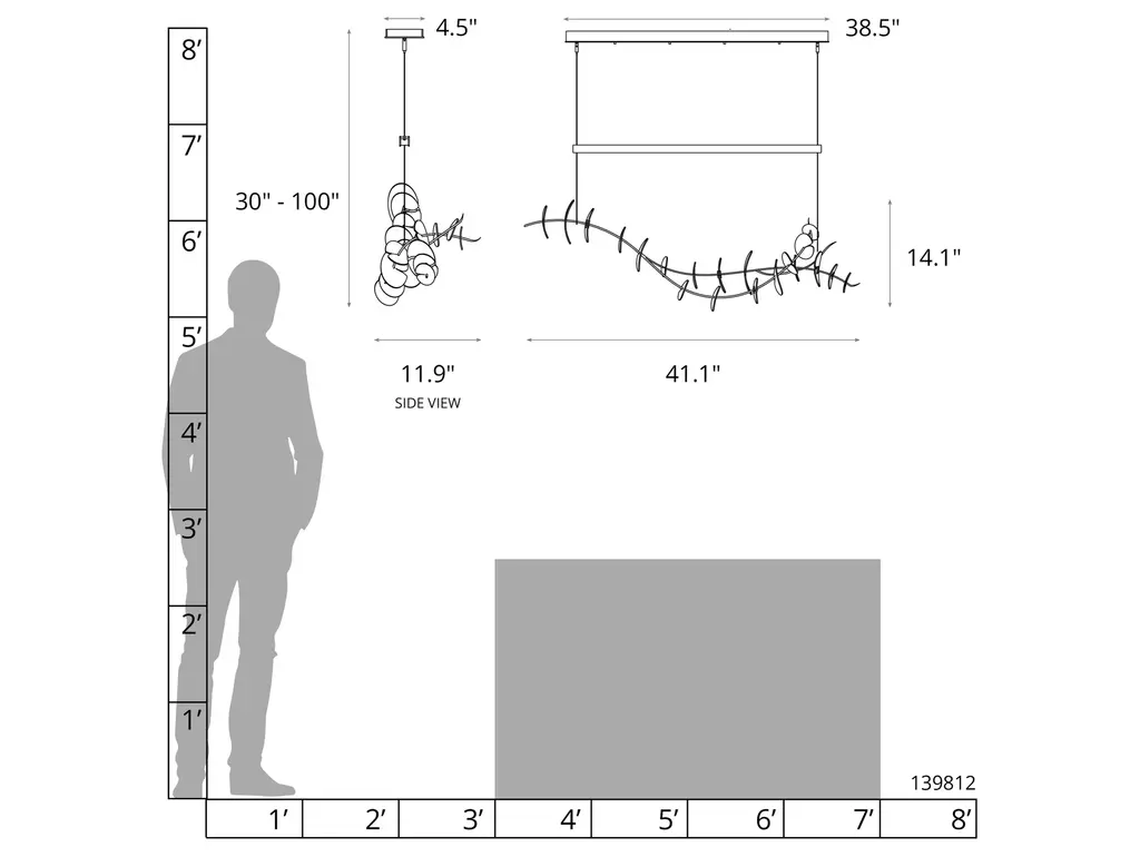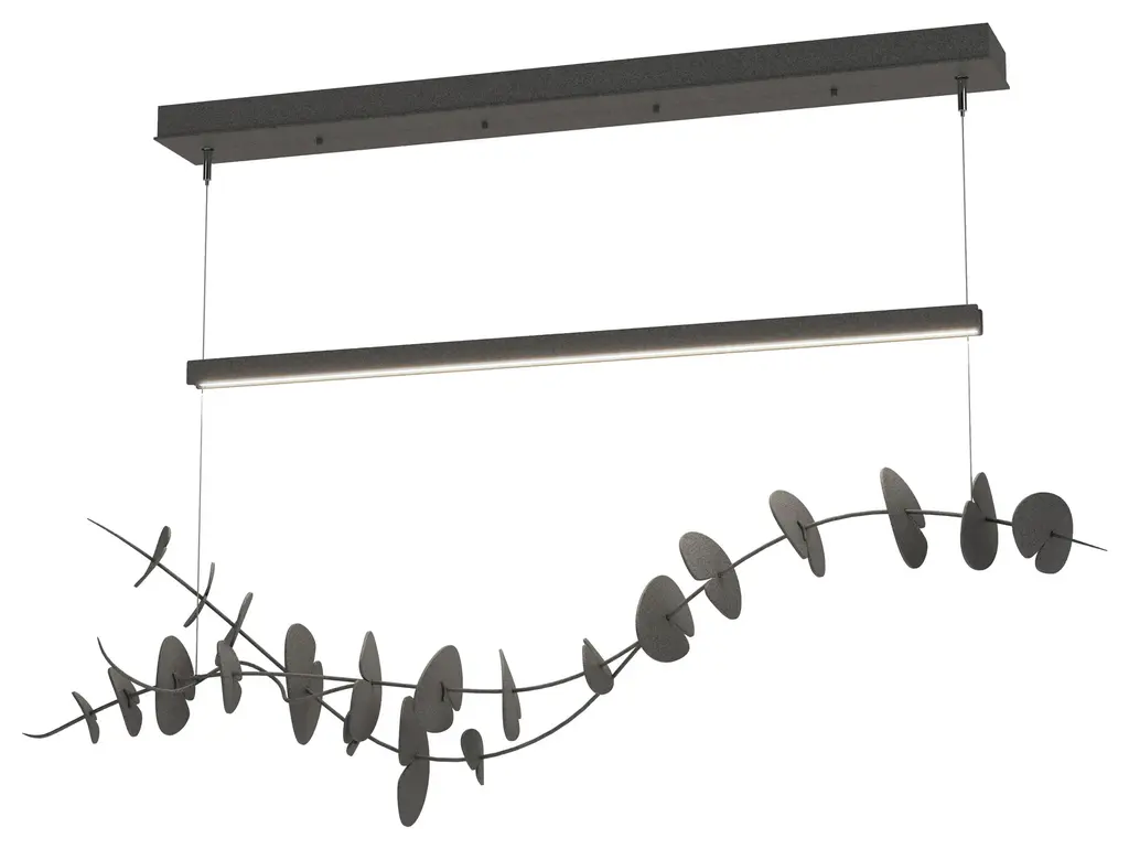 Adjustable cable-hung linear LED pendant. Choose between a steel version with 5 accent "lily pads" or a glass accent option with all textured clear glass lily pads. For the steel version, choose a finish for the canopy, LED light bar and fixture core and Delicate sculptural vines propagate leaves in your choice of steel or glass. The Lily brings bold botanical glamour into any environment.Handcrafted to order by skilled artisans in Vermont, USALifetime Limited Warranty when installed in residential settingSlope ceiling adaptable one way to 45 degreesIncludes adjustable cable and canopy kitLED Lamping DedicatedLED: 20 wattCCT: 3000KCRI: 90Input: 120-277 vACDimming: Line Voltage, ELVDelivered Lumens: 1000LED Source Lumens: 1500IES Files Available: NNot photometric tested, calculated from similar productLocation RatingIndoor DampSafety RatingUL, CUL listedDimensions:Height: 14.10"Length: 41.10"Width: 11.90"Product Weight: 23.40 lbsOverall Height: 30" to 100"Canopy: 4.5" x 38.5"HardwireAll Hubbardton Forge products are hand-crafted to last one at a time in Vermont and backed by a Lifetime Limited Warranty.