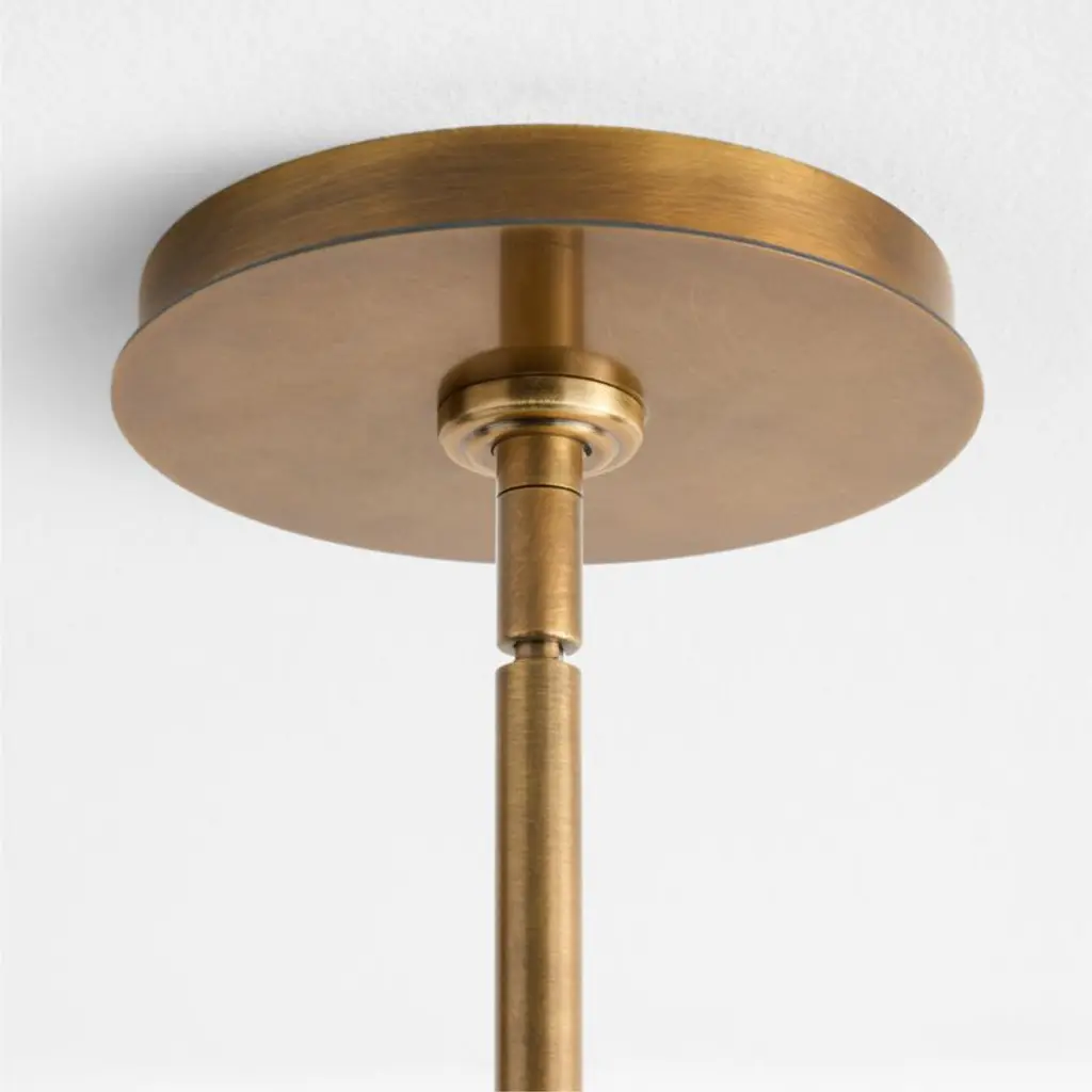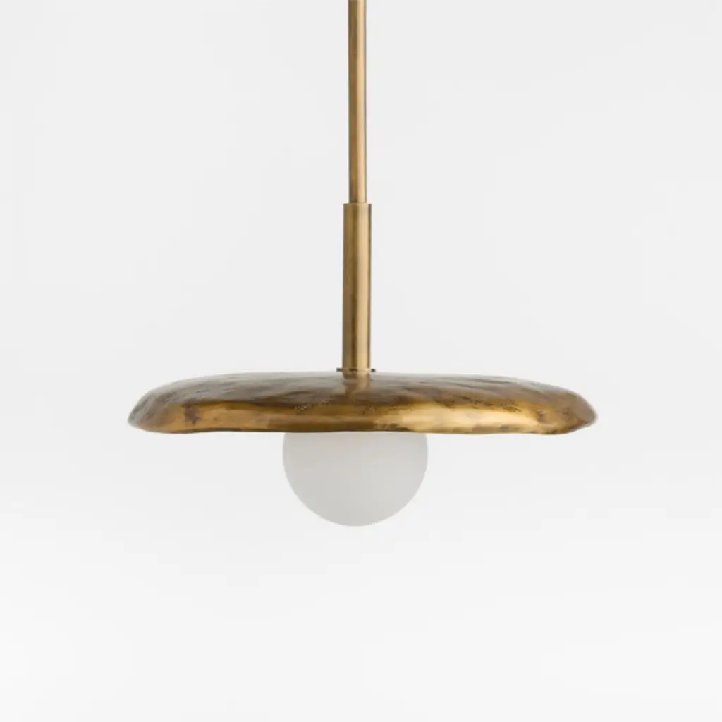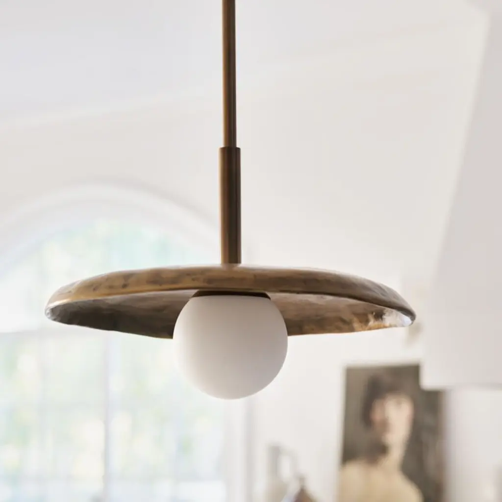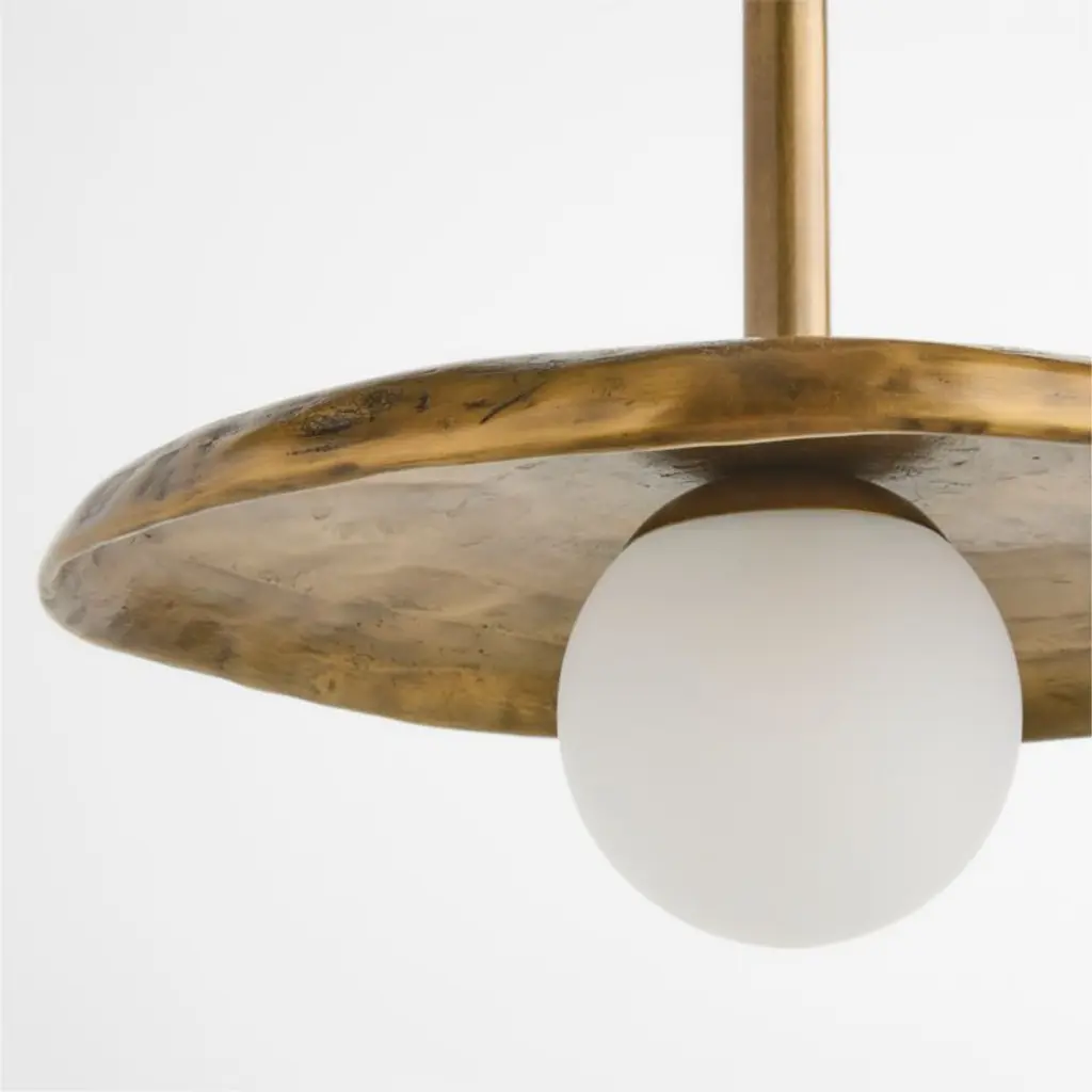 Inspired by lily pads, Brigette Romanek designed this pendant with similar beauty and grace. A hand-sculpted shade supports a white orb, evoking a floating leaf and glowing white flower of the aquatic plant. A warm burnished brass finish unites the chandelier's organically textured shade and crisp, linear rods, while the milk glass globe filters light softly. Stunning above a dining table or kitchen island, Lilypad also looks delightfully at home over a freestanding bathtub.Exclusive collaboration! L.A.-based star designer Brigette Romanek redefines design rules as only she can, with playfully unexpected forms to bring you the fresh look her A-list clients love.