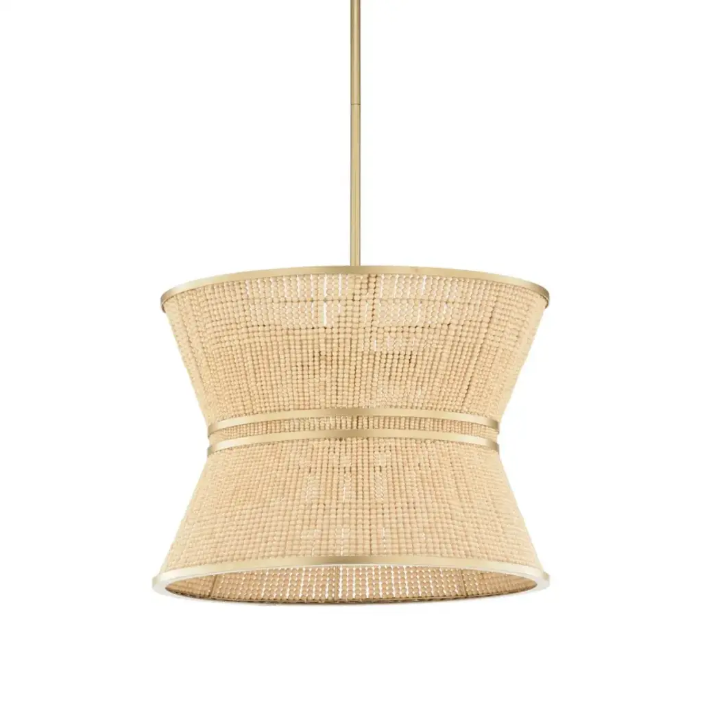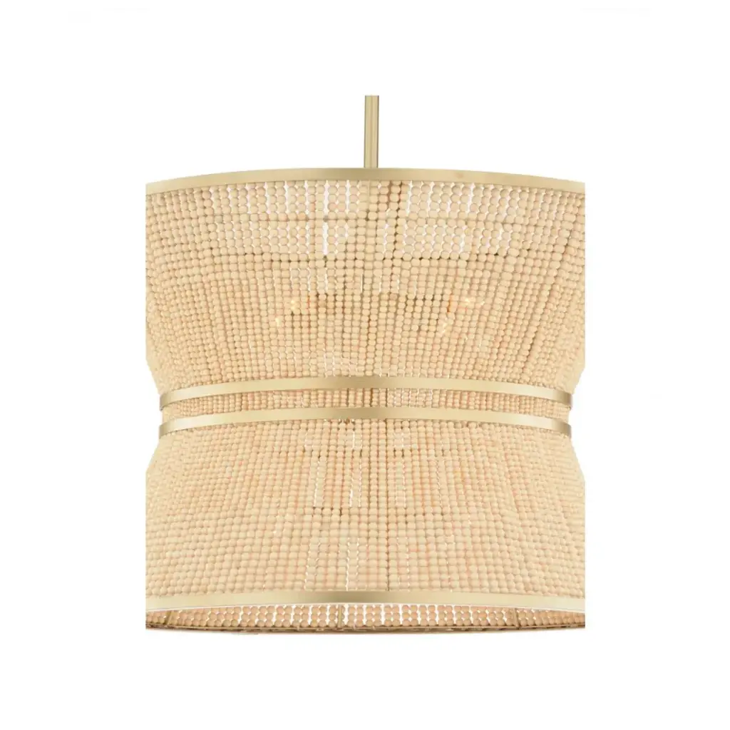 The Lima Pendant brings a glamourous organic appearance for versatile lighting. Made of small beads strung together and sinched in the middle, framed by a satin gold metal banding. Designed by Shayla Copas.