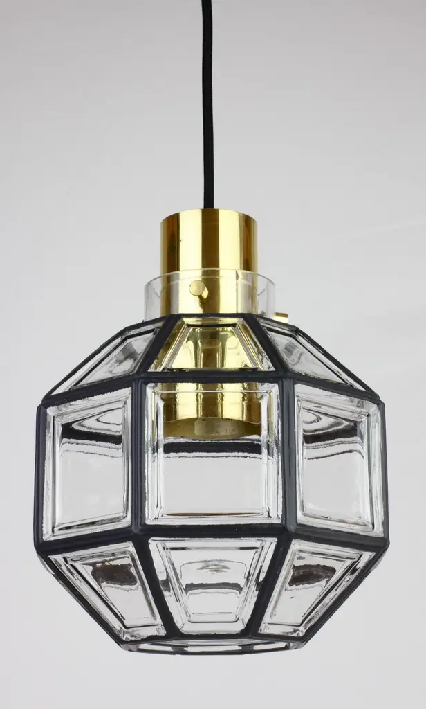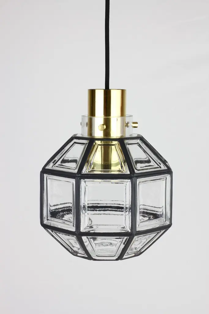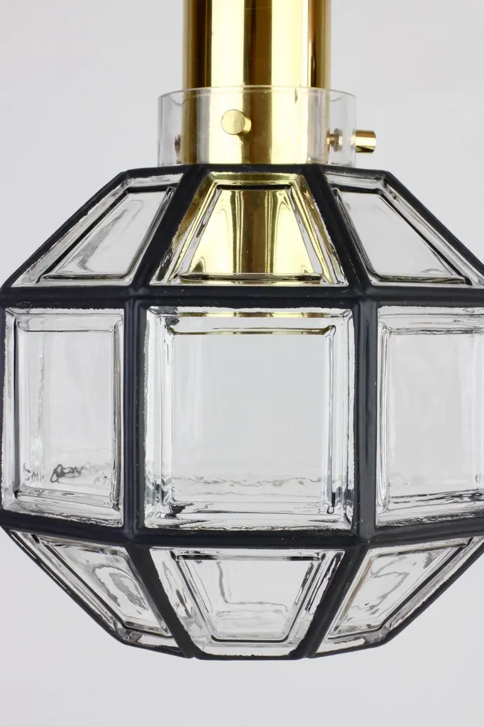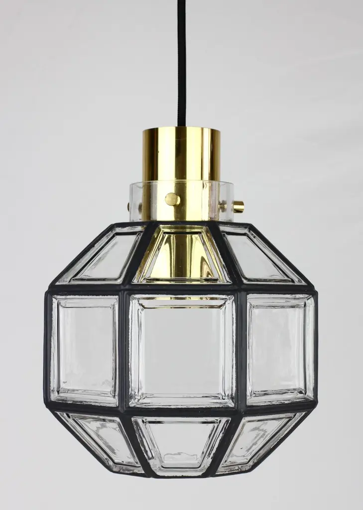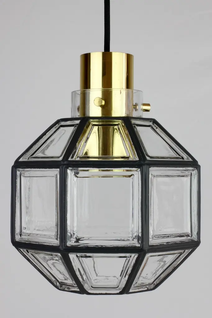 One of a set four beautifully designed and crafted octagonally shaped and multi-faceted clear glass & polished brass Mid-Century pendant light. These large minimalistic, Contemporary Art Deco and Lantern style lights were designed by Hans-Agne Jakobsson and manufactured by Limburg Glashütte, Germany, circa 1960-1969. These are the smaller of two sizes made by Limburg. We also have the larger pendants as well as a full range of Limburg lights from this range / style.Newly rewired. Each lamp requires one standard E27 (E26 for U.S. customers) screw fit lightbulb (75Watt max.) We can supply, free of charge, any length / drop of cable in almost any color / colour.