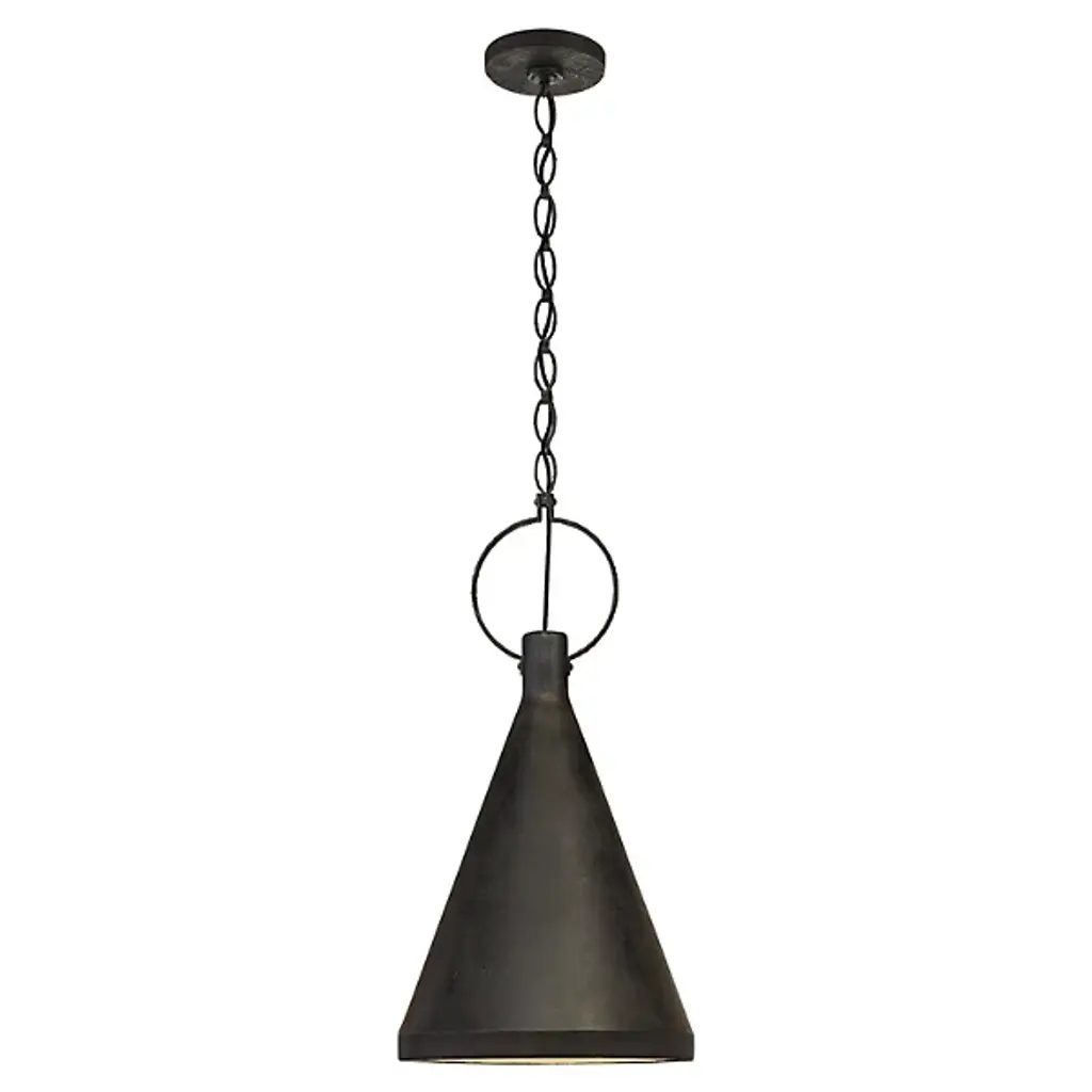 Give your living space a utilitarian design aesthetic with the Limoges Pendant by Visual Comfort. The eye is drawn to the elegant ring that lines a chain of links above the pendant’s metal frame. This chain is secured in the air by a ceiling canopy so that light from the pendant’s halogen bulb can easily disperse in an overhead manner. This fixture’s conical shape and steel frame make it an excellent choice for a dining room light.