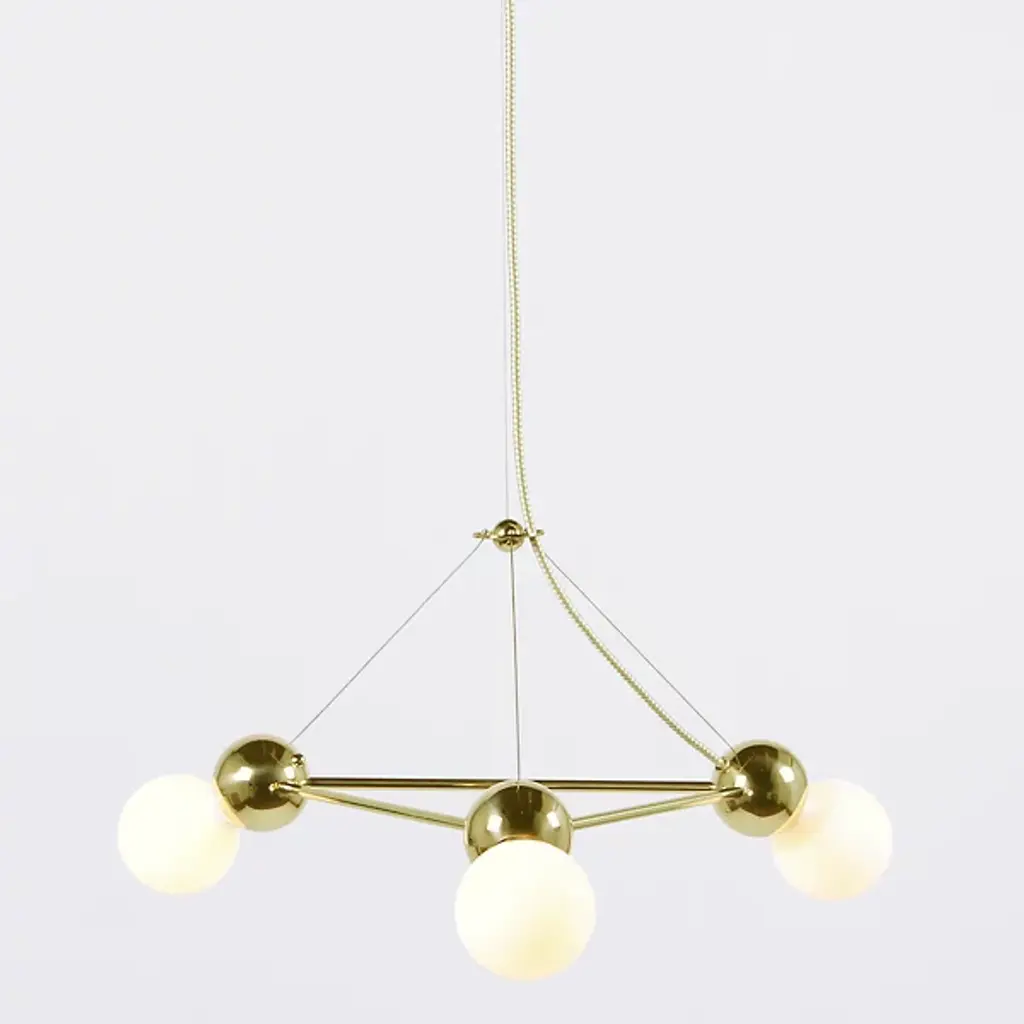 For the abstract lover, this airy geometric form brings a unique element. Part of the Lina collection, the Lina 03 Triangle Pendant by Rosie Li Studio is an all-brass lighting system designed by Rosie Li. Keeping the focus on sculptural lighting, Rosie Li has created a geometric structure punctuated by lights on each corner. Rounded brass joints bind the brass rods in the outline of a triangle and support an exposed light source. Hung from the ceiling using a minimal cable suspension, the chandelier shines with a delicate glow and lends an artistic touch to your living room or bedroom. Made to order and assembled in Brooklyn, NY in Rosie Li's studio, this chandelier is a class apart.