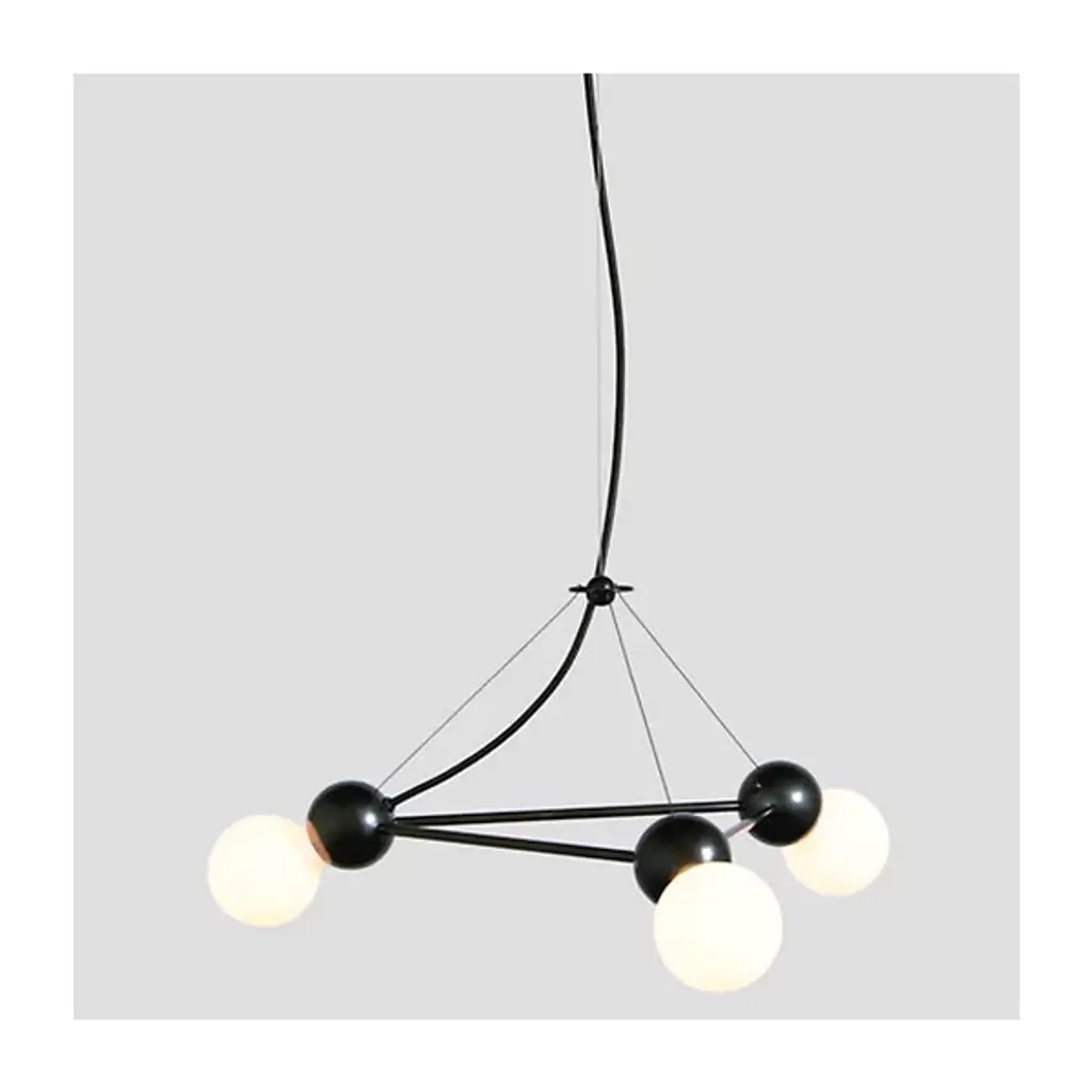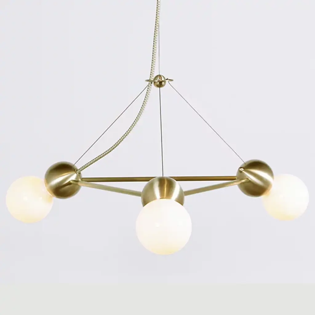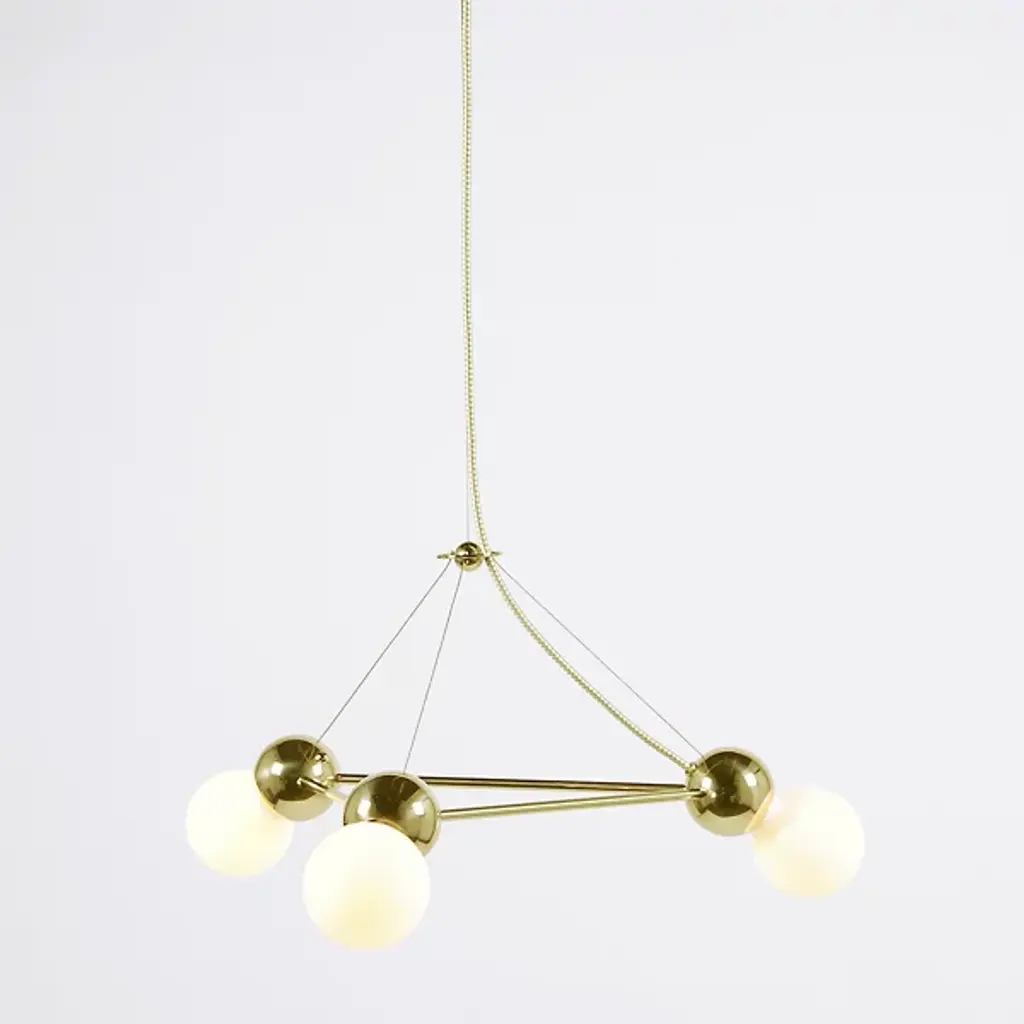For the abstract lover, this airy geometric form brings a unique element. Part of the Lina collection, the Lina 03 Triangle Pendant by Rosie Li Studio is an all-brass lighting system designed by Rosie Li. Keeping the focus on sculptural lighting, Rosie Li has created a geometric structure punctuated by lights on each corner. Rounded brass joints bind the brass rods in the outline of a triangle and support an exposed light source. Hung from the ceiling using a minimal cable suspension, the chandelier shines with a delicate glow and lends an artistic touch to your living room or bedroom. Made to order and assembled in Brooklyn, NY in Rosie Li's studio, this chandelier is a class apart.