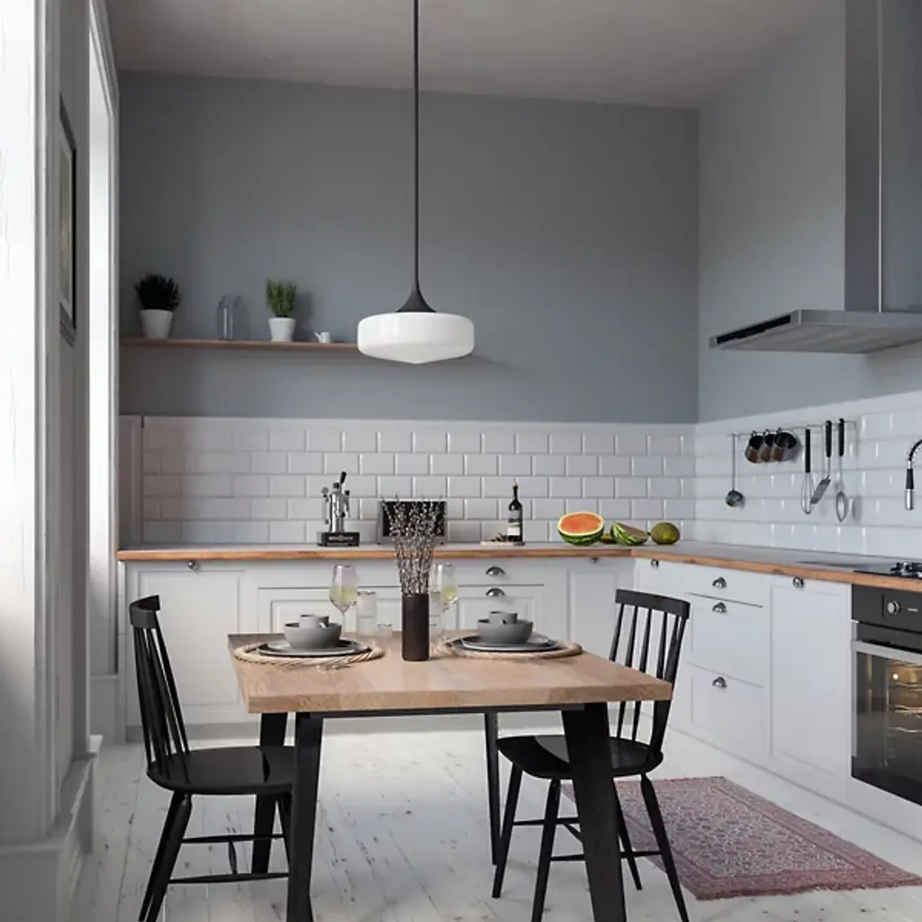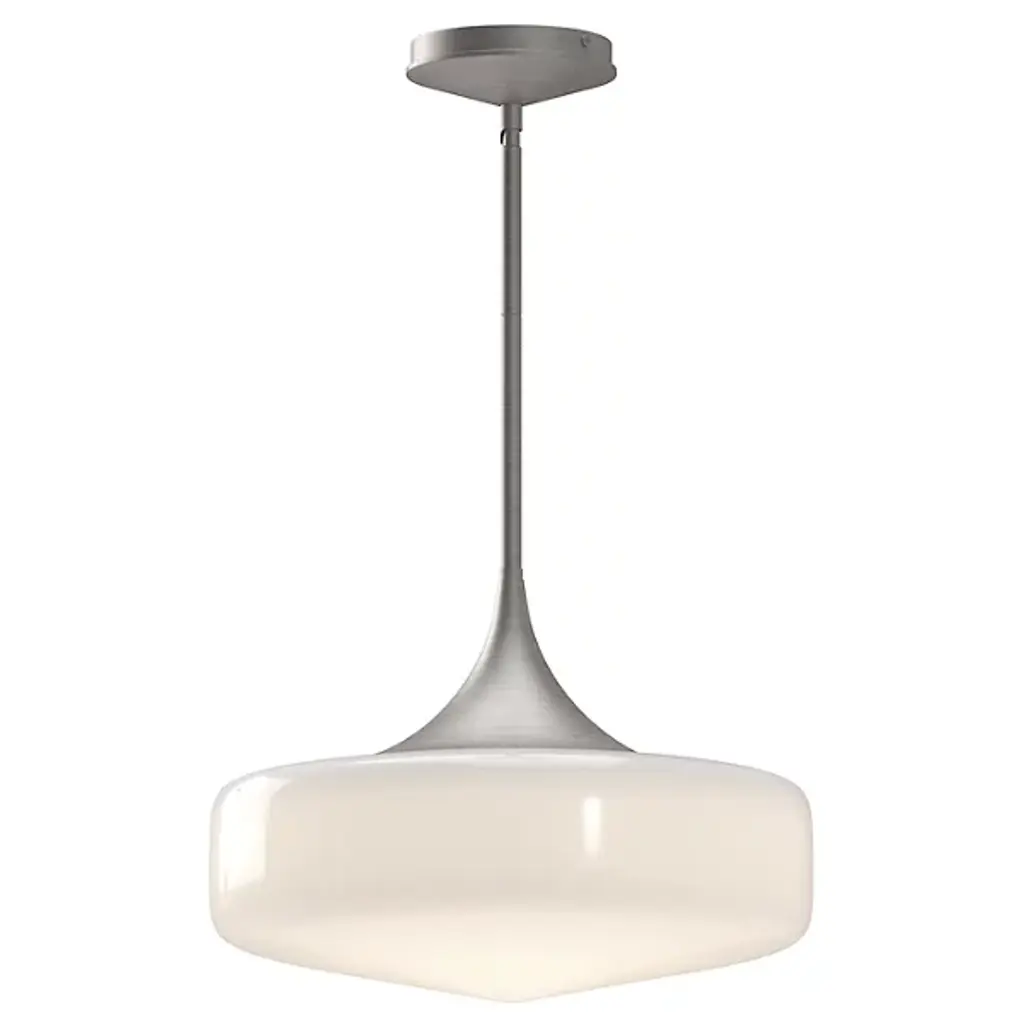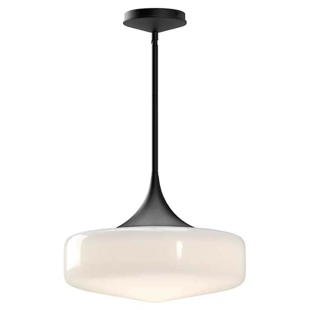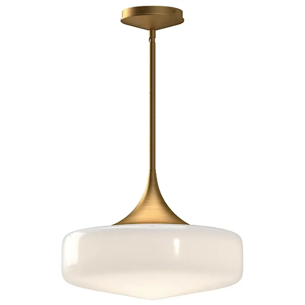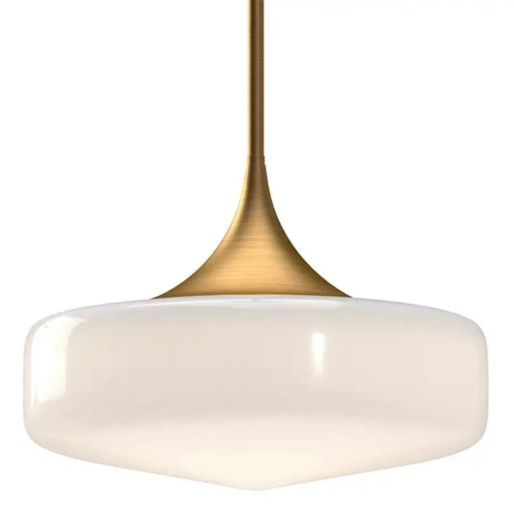 Modern lighting at its artful peak. The Lincoln Drum Pendant from Alora Mood doesn’t have to be turned on to set the aesthetic tone of the room. It enters the space with grace using a slender down rod suspension. The downrod transitions into a curved lamp holder to provide a bold contrasting finish to the glass below. This opal glass shade evokes a schoolhouse design in its deep-dish form and pointed base. The glass surrounds the light to transform bright glare into a uniform wash of ambient down lighting.