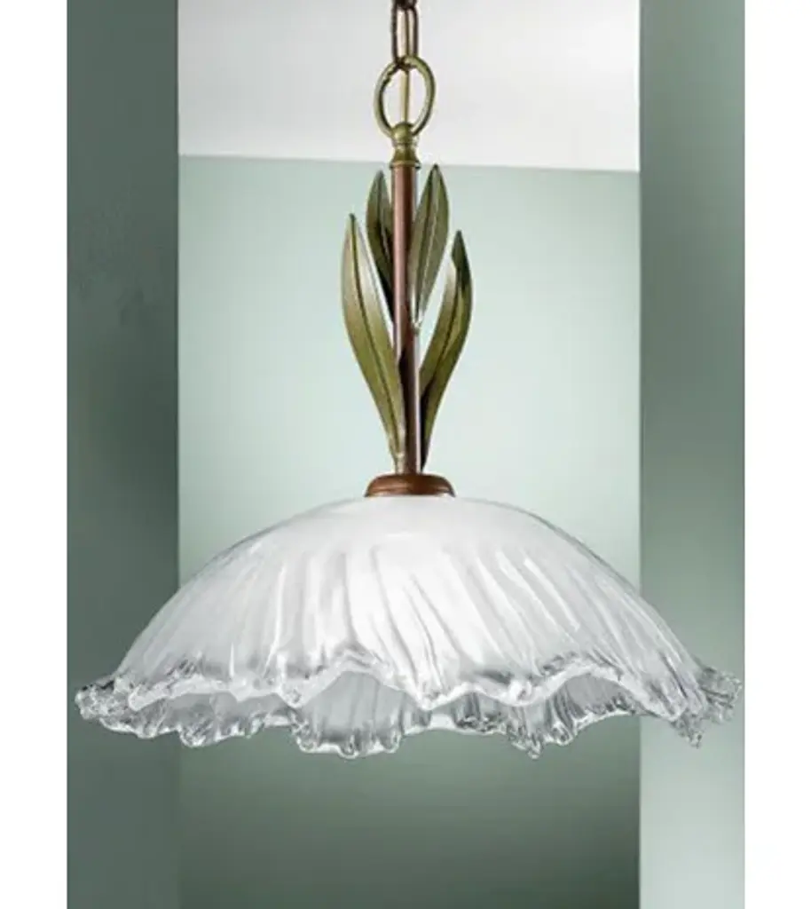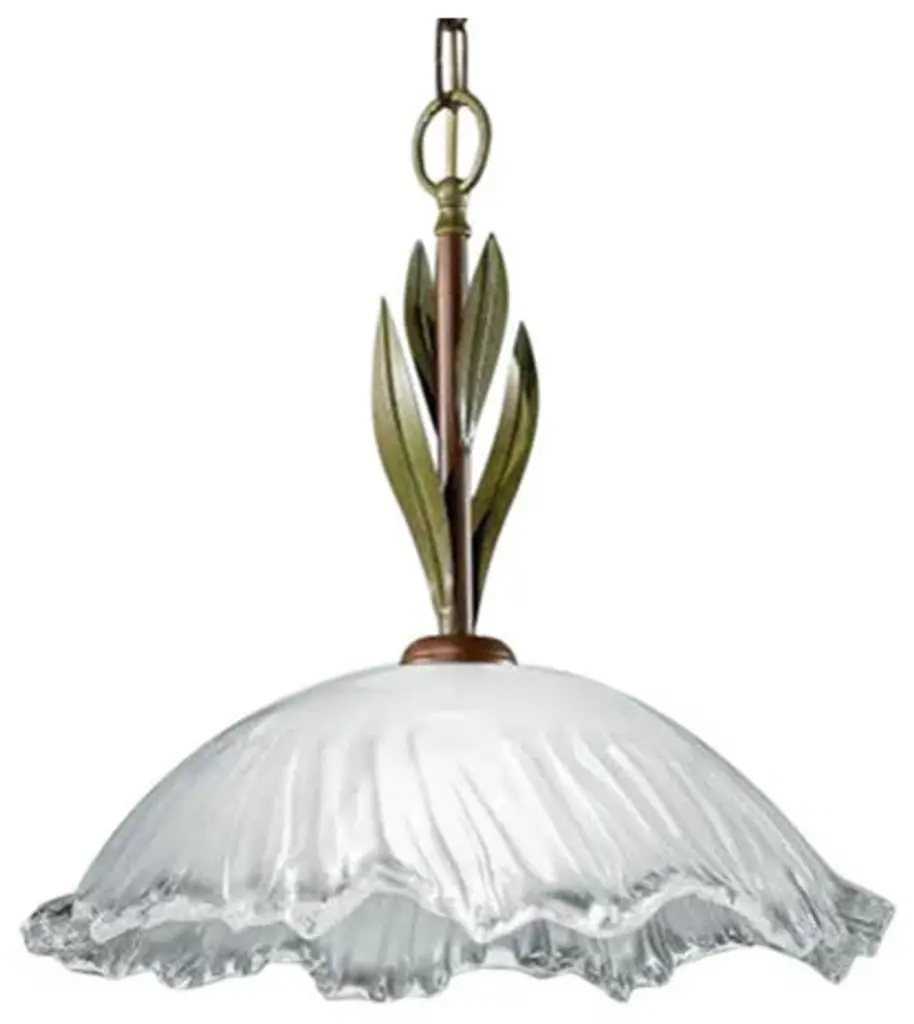 *Please reference last two images for lamp and shade color.This pendant is part of the linda collection which is known for . The 558's . The 558 is well-suited for areas were a large chandelier is overbearing and a ceiling mount does not optimize impact. It works especially well in dining rooms, over kitchens islands, bars, wine cellars/ tasting rooms, and any other space in which a beautiful, subtle touch is needed to brighten up the room, both with light and style. Available metal finishes include rgo and rgv and available shades are 30 and 35.More about the linda collection: the linda collection is a sophisticated collection of lighting that includes chandeliers, pendants, wall mounts, ceiling fixtures, torchieres, and table and floors lamps. This collection represents italian design at its best. Linda Fixtures are hand crafted and hand decorated using venetian glass that is draped and organic in design. This upscale sophisticated design will enhance any room and become a focal point. It truly is a collection that compliments every room of the home. The linda collection is hand-forged by florentine artisans. Available in this collection is three chandeliers, two table lamps, one torchiere, four ceiling mounts, two wall sconces and two pendants. Available finishes include rust with green leaf details (rgv) and rust with gold leaf details (rgo). Venetian glass options include Satin White (30) and Grit Amber (35).Bulb Type: E26No. of Bulbs: 1Watts: 100WGlass: Grit Amber