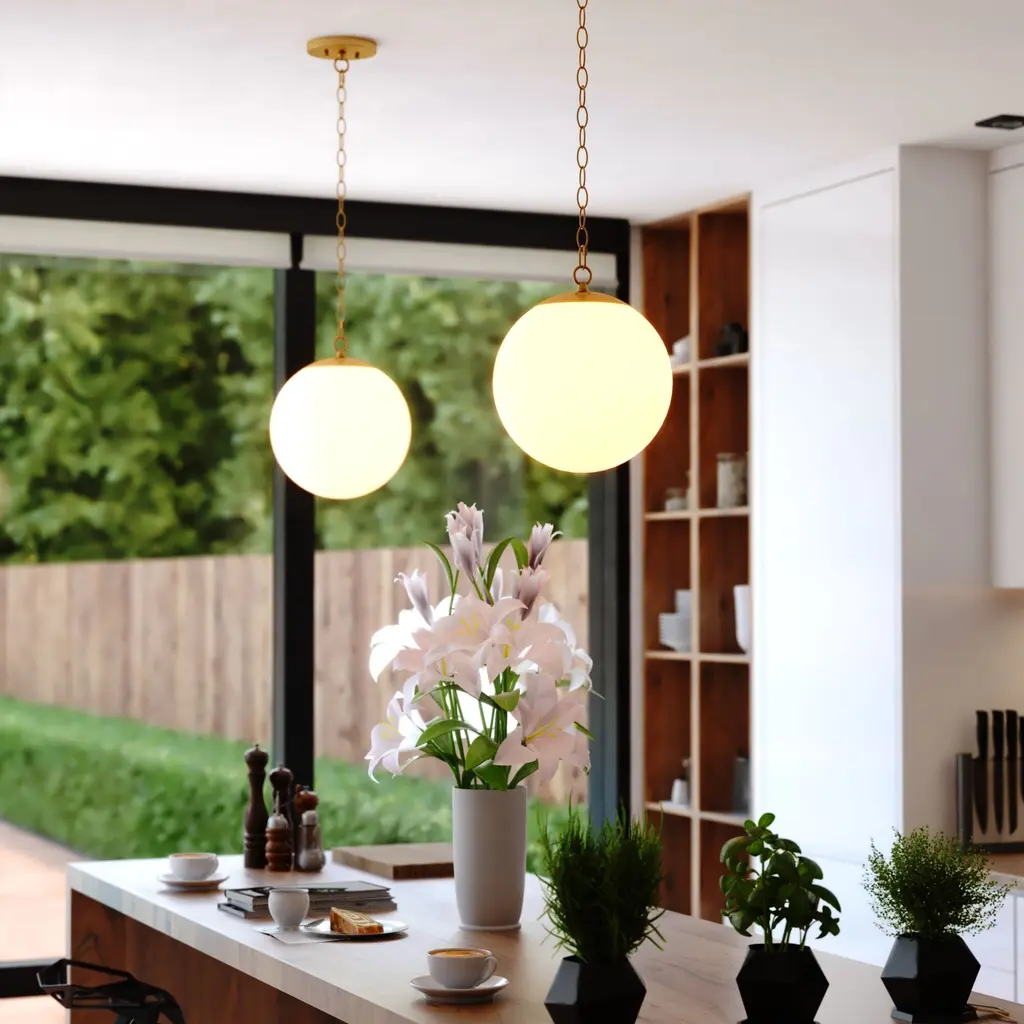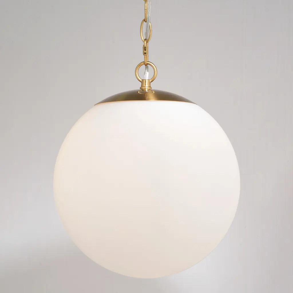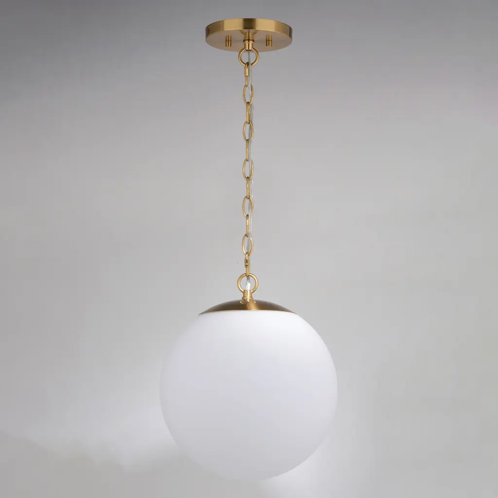 The Linden 12-in. globe pendant seamlessly marries mid-century modern allure with contemporary sophistication, boasting a stunning composition of milk white glass and muted brass finish. It effortlessly complements today's hottest decor trends and serves as a captivating centerpiece that casts an inviting glow in your foyer, kitchen, or bedroom.