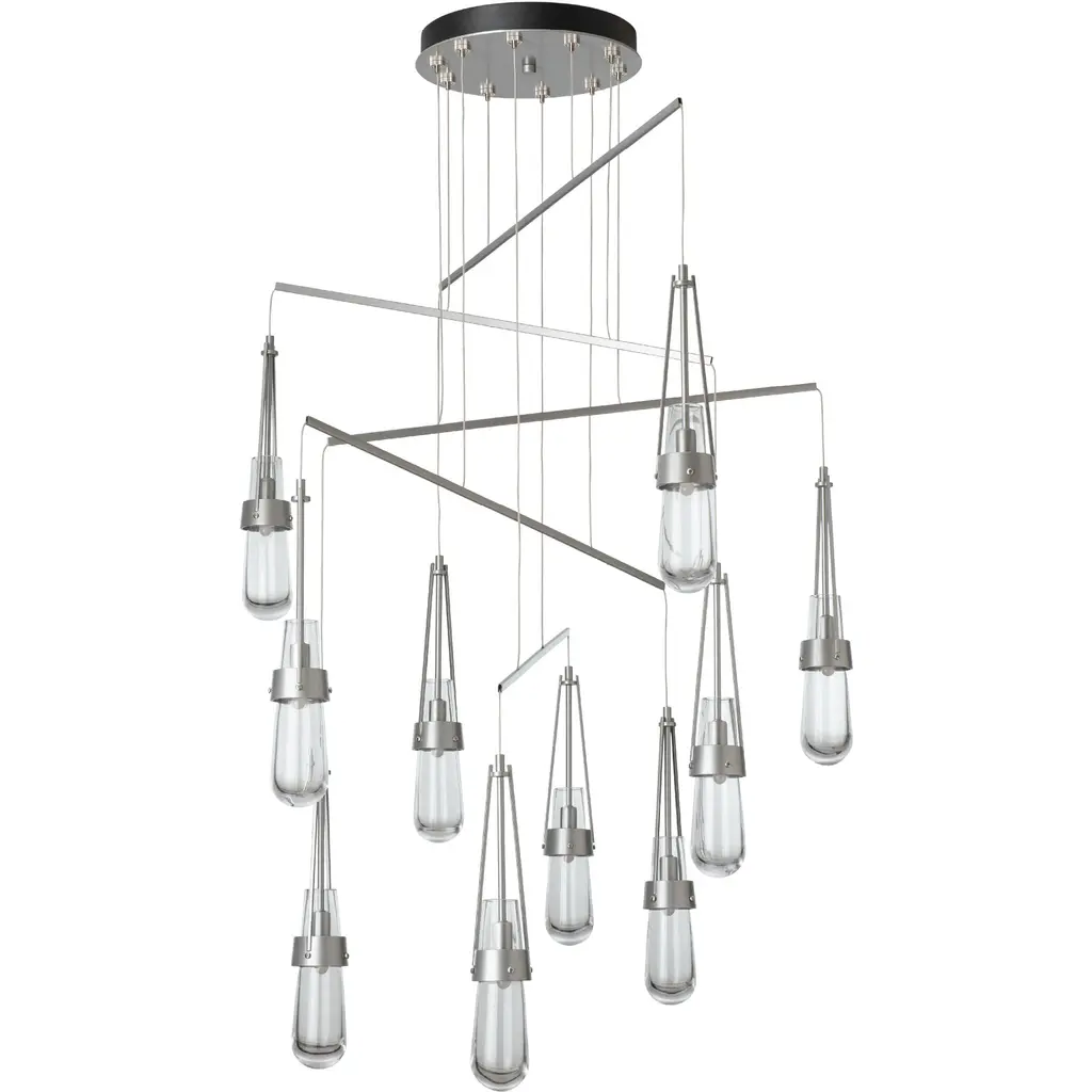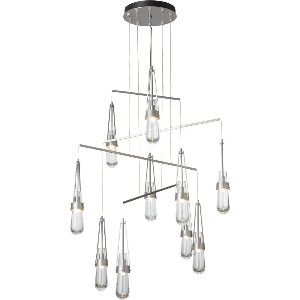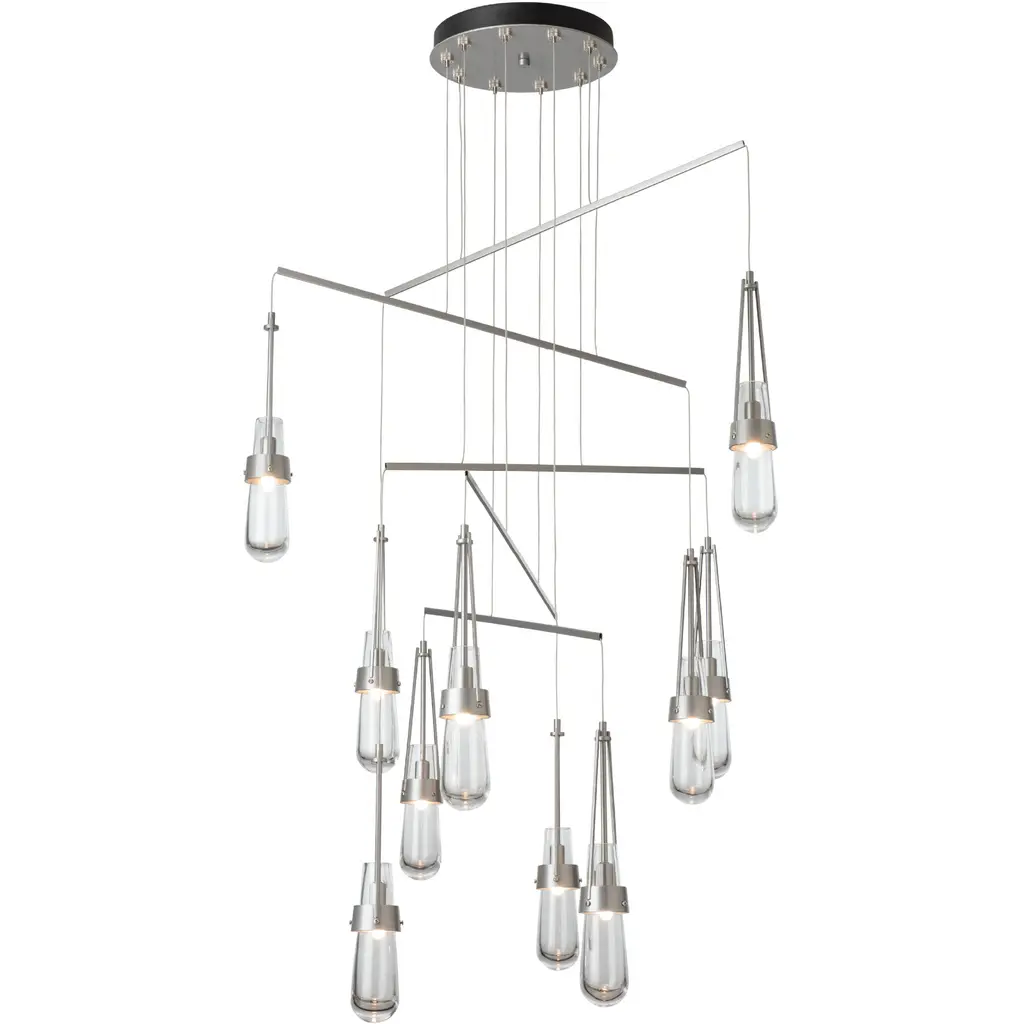 Love our Link Pendant but don't have the ceiling available to accommodate a larger canopy Looking for the Link to occupy a larger area Here is the solution. A mobile version, minimizing the canopy while providing a wider expanse gives the Link breadth with delicate metal tubes that guide the cables in a highly-adjustable balance of light. Ten thick, clear glass vessels are the trademark of this Link pendant.