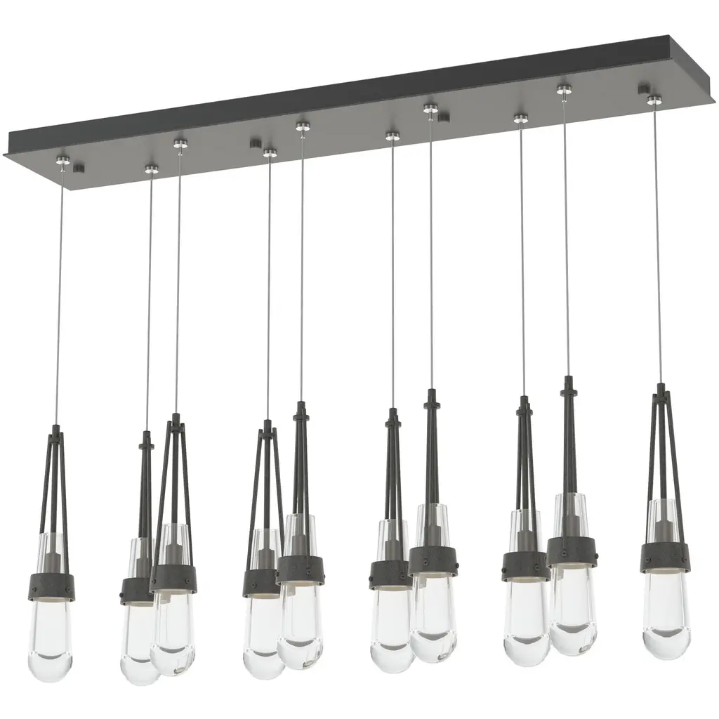 This linear Link multi-port fixture provides key options for customization—2 rows of clear glass may be aligned or staggered at the desired lengths from its rectangular canopy. Steel cuffs, handmade by Vermont artisans, embrace the clear glass of this Link 10-Light ceiling fixture. Metalwork is available in all standard finishes.