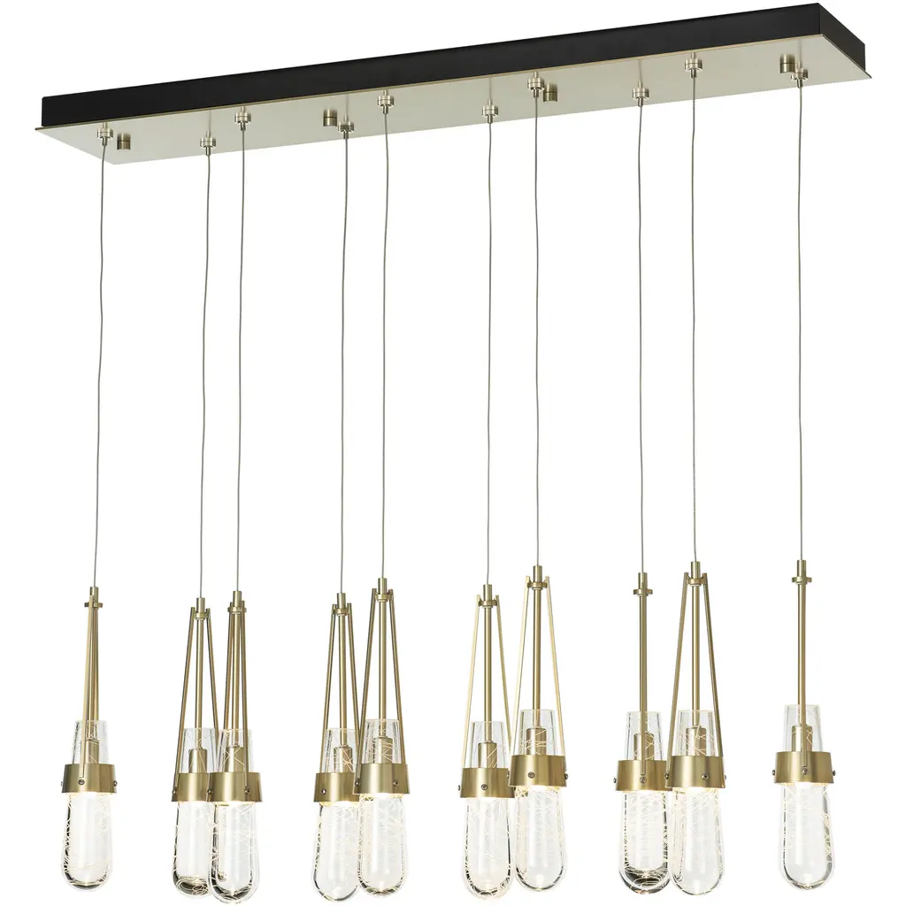 This linear Link multi-port fixture provides great customization options—the two rows of Link blown glass may be staggered or even, at a desired length from its rectangular canopy. Steel cuffs, handmade by Vermont artisans, embrace the glass of this Link 10-Light ceiling fixture. Handmade by local Vermont masters glass artisans, this Link's glass is offered in a choice of clear white threaded or clear bubble. Metalwork is available in all standard finishes.