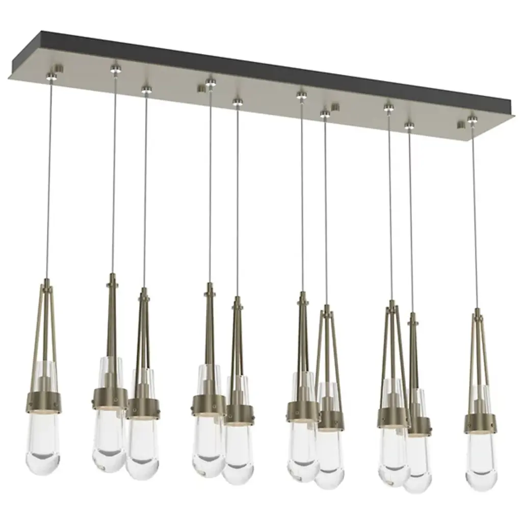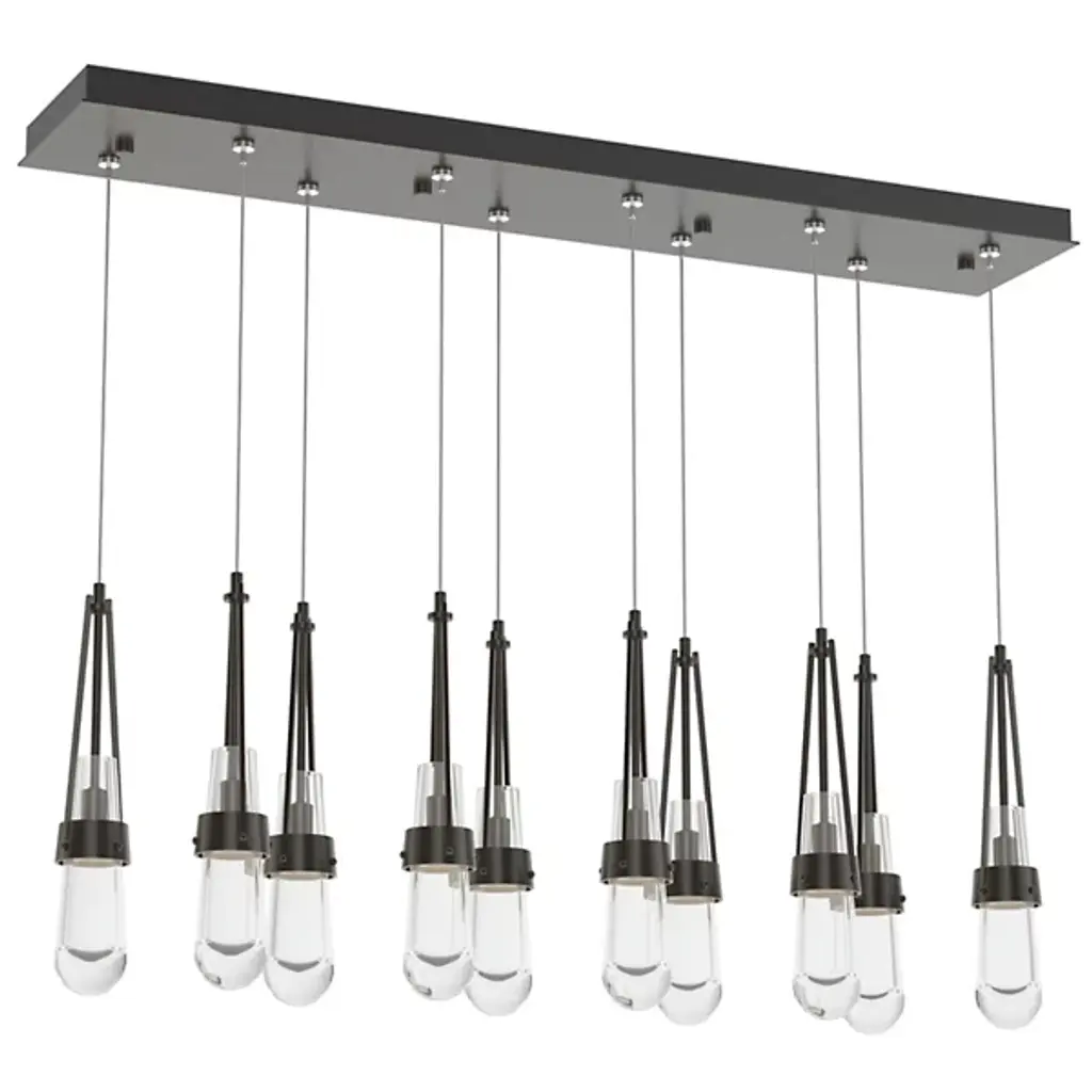 Just the sparkling baubles you need to illuminate a truly fashionable home. The Link 10-Light Clear Glass Rectangular Multi-Light Pendant by Hubbardton Forge is crafted as finely as any piece of actual jewelry. It features exquisite teardrop-shaped glass shades held within artisan-crafted steel cuffs. Ten of these drops share a single rectangular canopy; hang them all at the same level or at staggered heights to create a personalized and truly precious centerpiece in a dining room or other large living space.