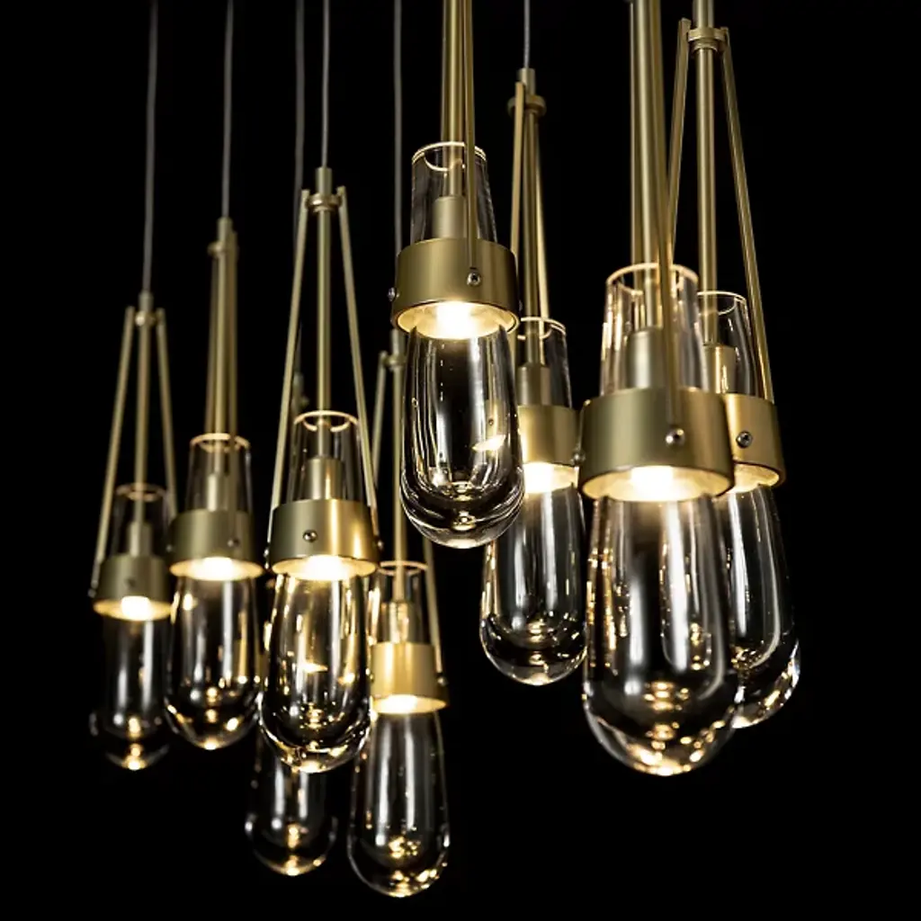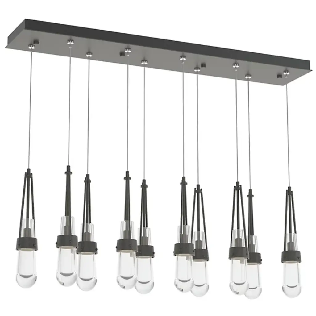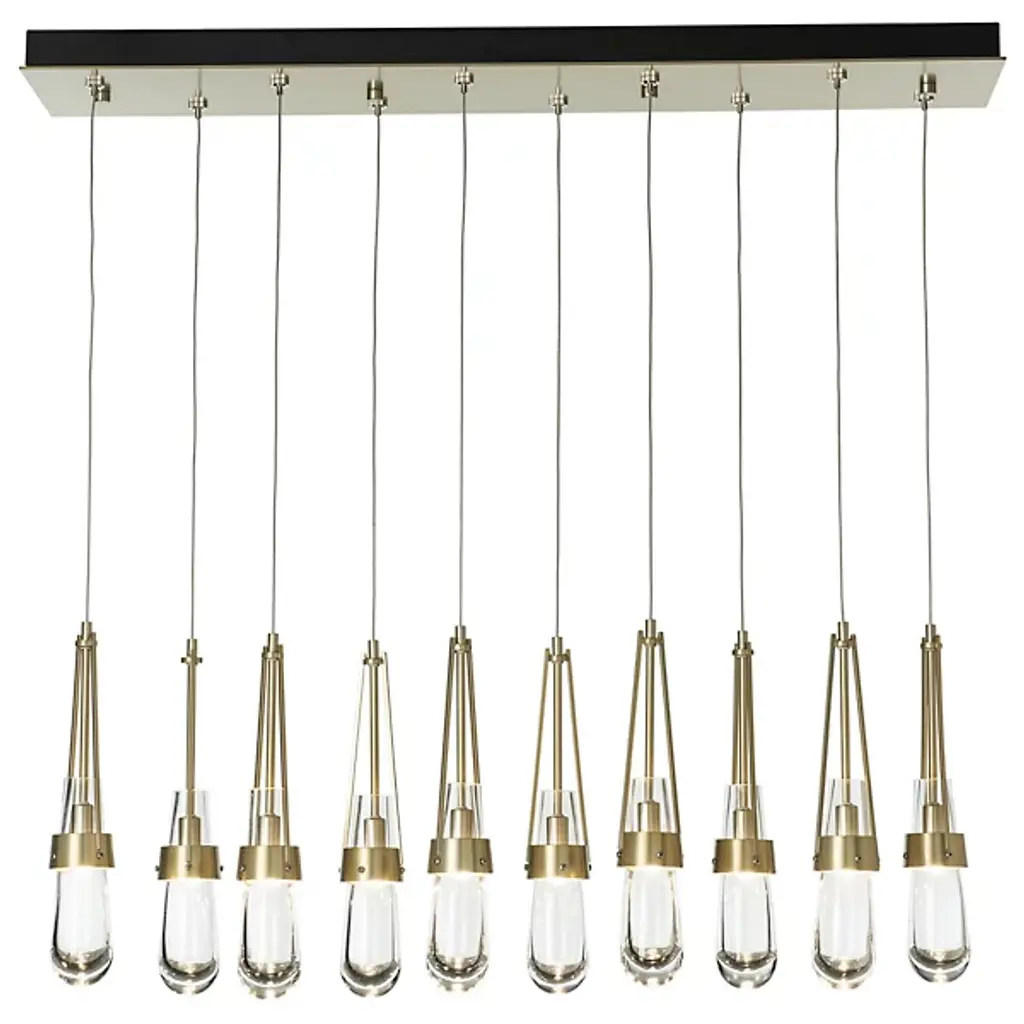Just the sparkling baubles you need to illuminate a truly fashionable home. The Link 10-Light Clear Glass Rectangular Multi-Light Pendant by Hubbardton Forge is crafted as finely as any piece of actual jewelry. It features exquisite teardrop-shaped glass shades held within artisan-crafted steel cuffs. Ten of these drops share a single rectangular canopy; hang them all at the same level or at staggered heights to create a personalized and truly precious centerpiece in a dining room or other large living space.