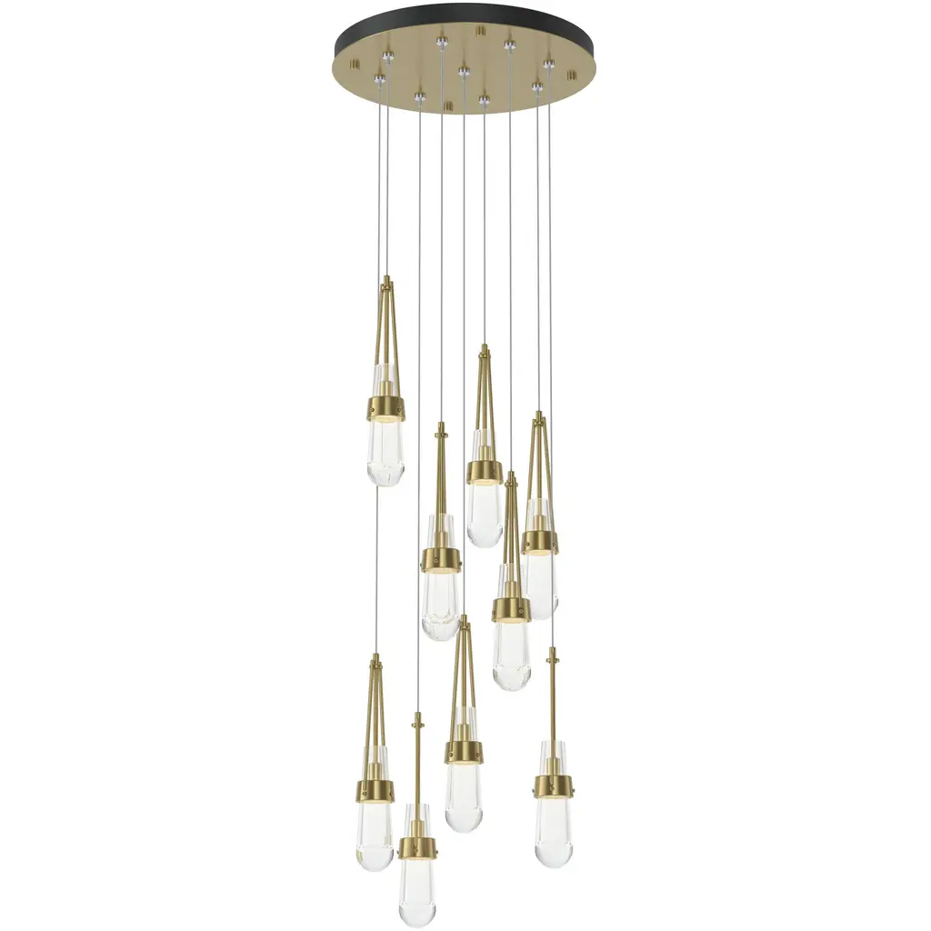 The popular Link Collection expands to include new multi-port fixtures. The Link 9-Light fixture features a round canopy from which nine pieces of clear glass are in staggered suspension. A focal piece for any space, the Link cascades downward from its canopy. Metalwork is available in all standard finishes.