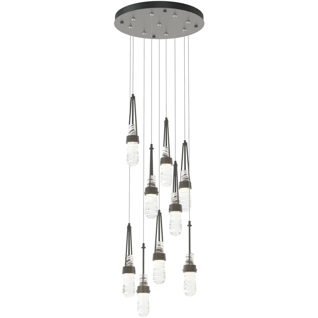 The ever-popular Link Collection expands to include new multi-port fixtures. The Link 9-Light is a multi-port round canopy from which nine pieces of blown glass are in staggered suspension, creating a focal piece for any space. Handmade by local Vermont masters of the art of glassblowing, glass is offered in a choice of clear white threaded or clear bubble. Metalwork is available in all standard finishes.