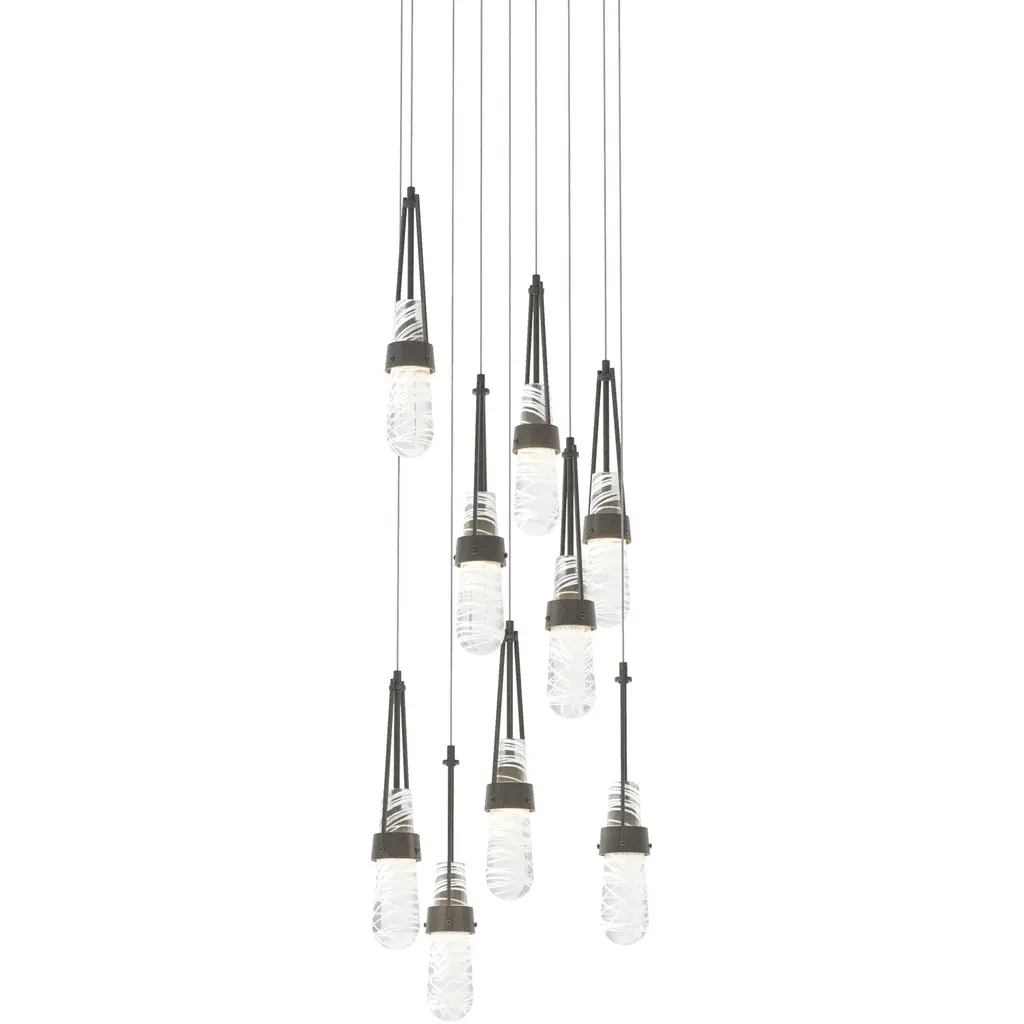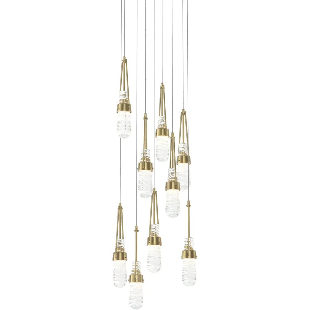 The ever-popular Link Collection expands to include new multi-port fixtures. The Link 9-Light is a multi-port round canopy from which nine pieces of blown glass are in staggered suspension, creating a focal piece for any space. Handmade by local Vermont masters of the art of glassblowing, glass is offered in a choice of clear white threaded or clear bubble. Metalwork is available in all standard finishes.