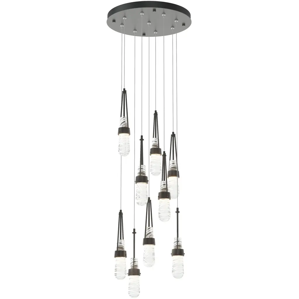The ever-popular Link Collection expands to include new multi-port fixtures. The Link 9-Light is a multi-port round canopy from which nine pieces of blown glass are in staggered suspension, creating a focal piece for any space. Handmade by local Vermont masters of the art of glassblowing, glass is offered in a choice of clear white threaded or clear bubble. Metalwork is available in all standard finishes.