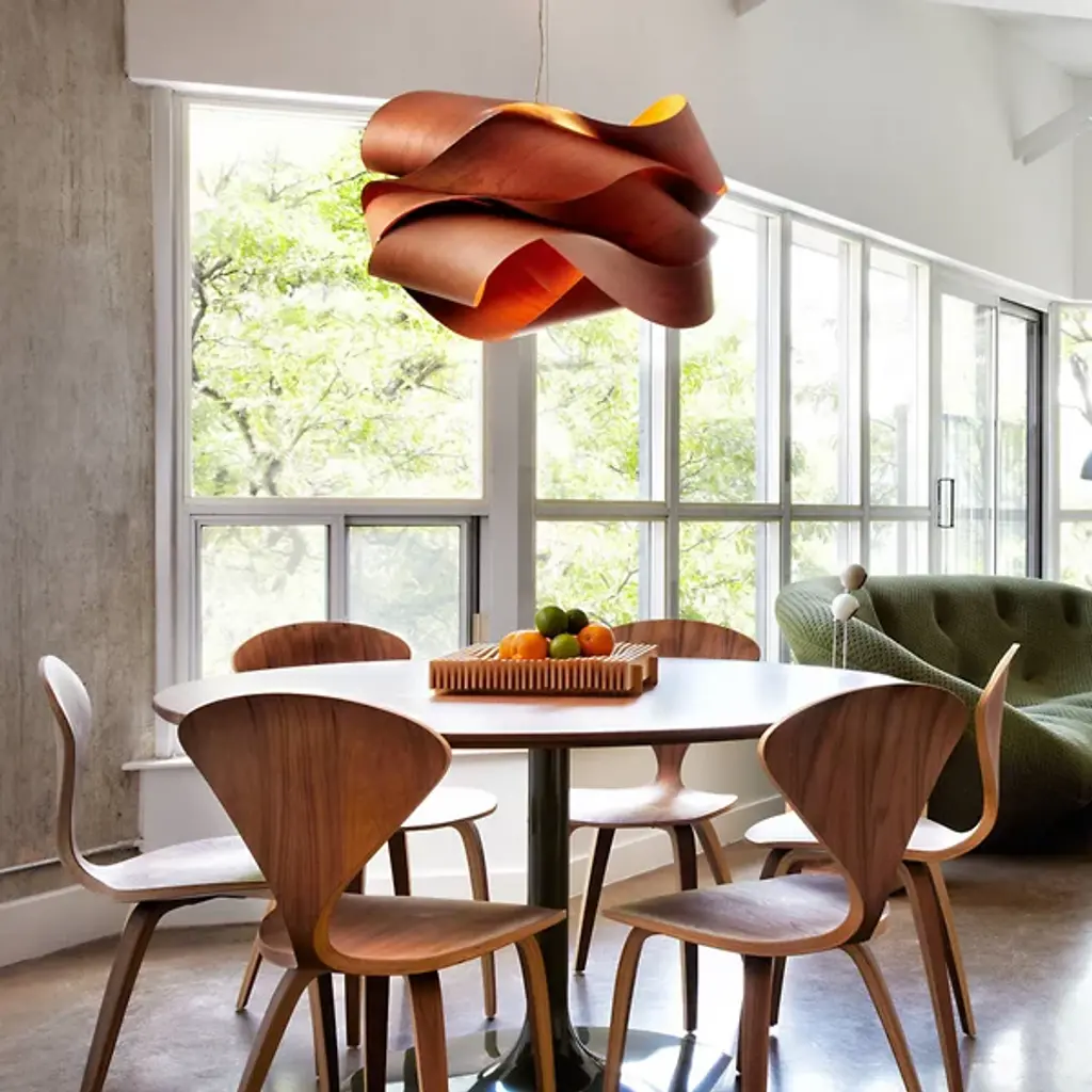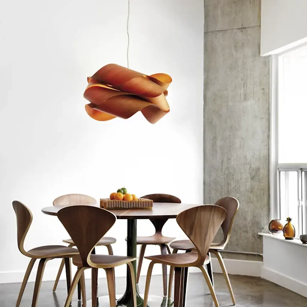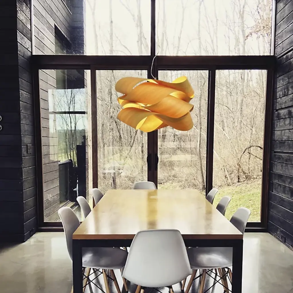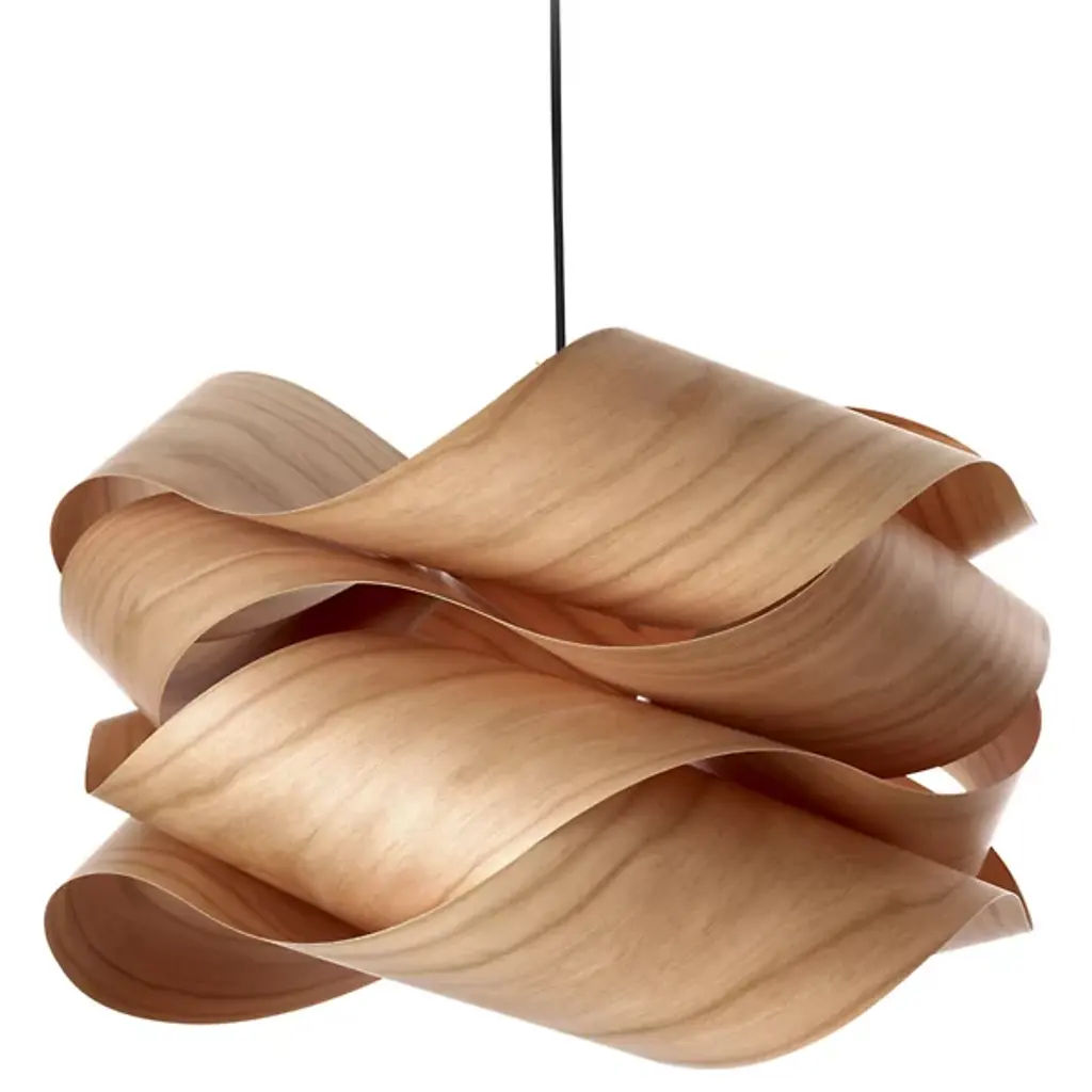 The Link Pendant from LZF represents designer Ray Power's exploration of repetition and geometric rhythm through the use of wood veneer. Power's design layers long strips of Timberlite veneer into flowing, interlocking curves that fold across the shade's surface. The pattern creates visual depth as light filters through varying densities of material, producing graduated tones from warm amber to deep shadow. This handcrafted piece earned the Good Design Award in 2008, highlighting Power's approach to pushing veneer construction into sculptural territory.