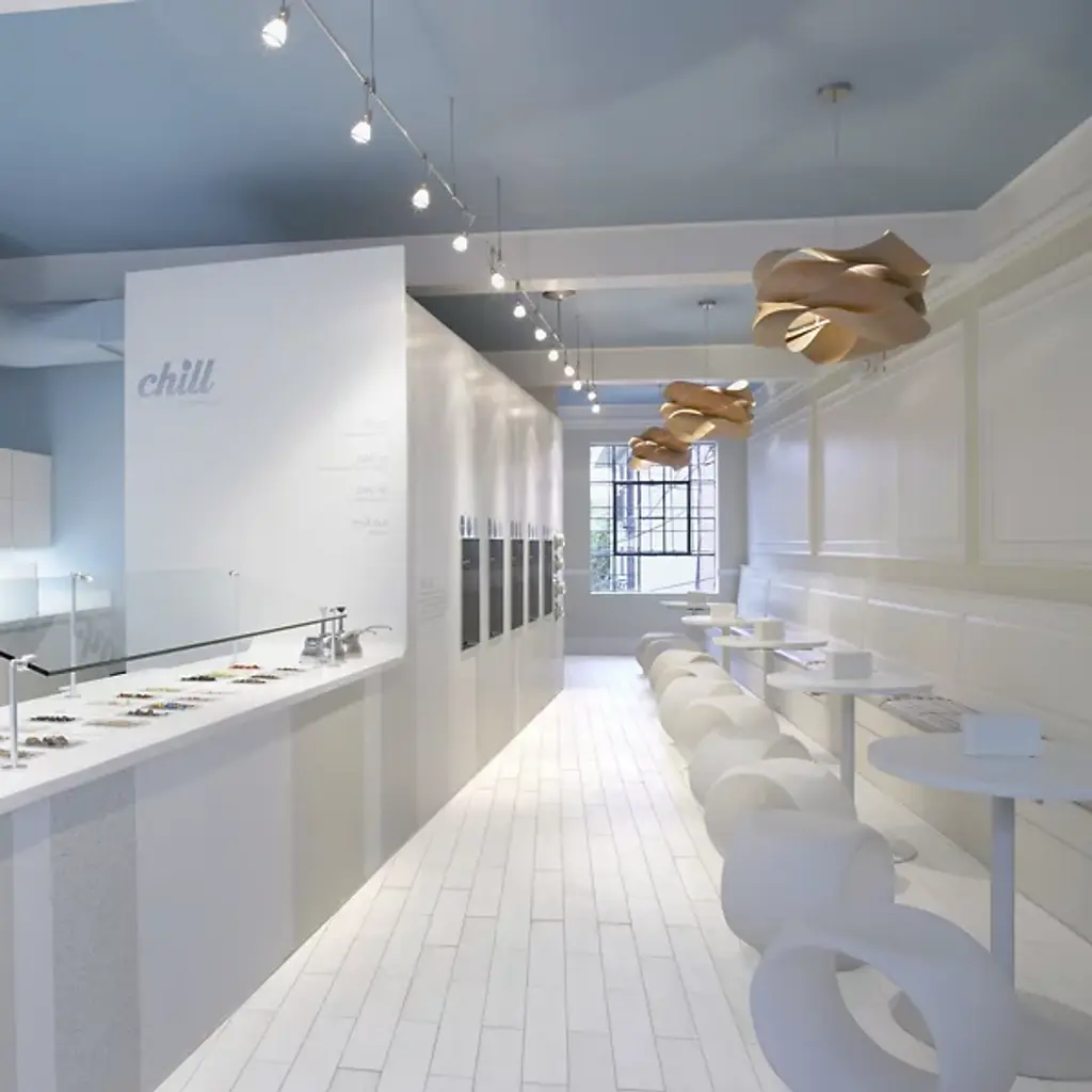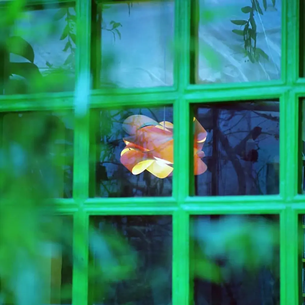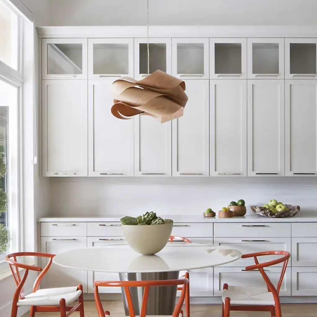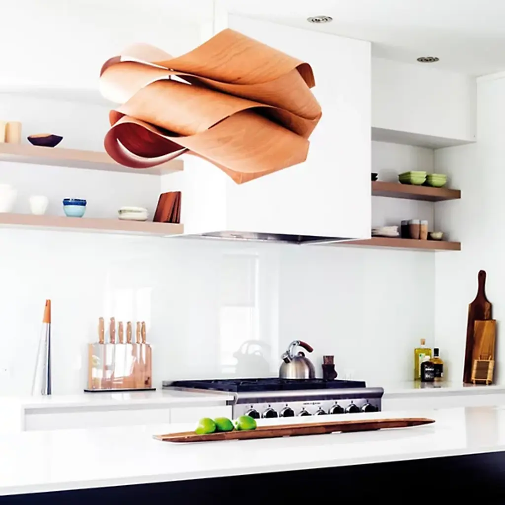 The Link Pendant from LZF represents designer Ray Power's exploration of repetition and geometric rhythm through the use of wood veneer. Power's design layers long strips of Timberlite veneer into flowing, interlocking curves that fold across the shade's surface. The pattern creates visual depth as light filters through varying densities of material, producing graduated tones from warm amber to deep shadow. This handcrafted piece earned the Good Design Award in 2008, highlighting Power's approach to pushing veneer construction into sculptural territory.