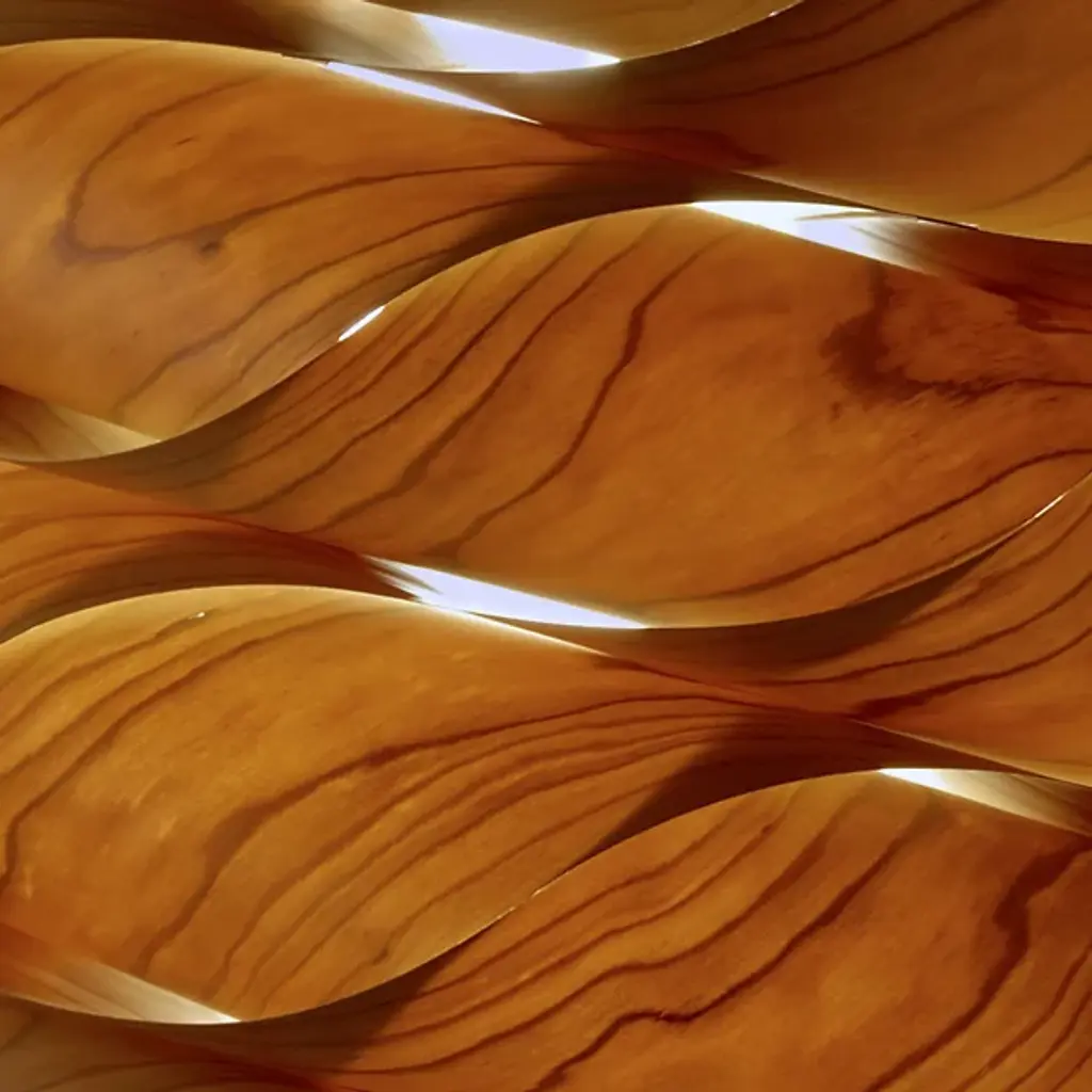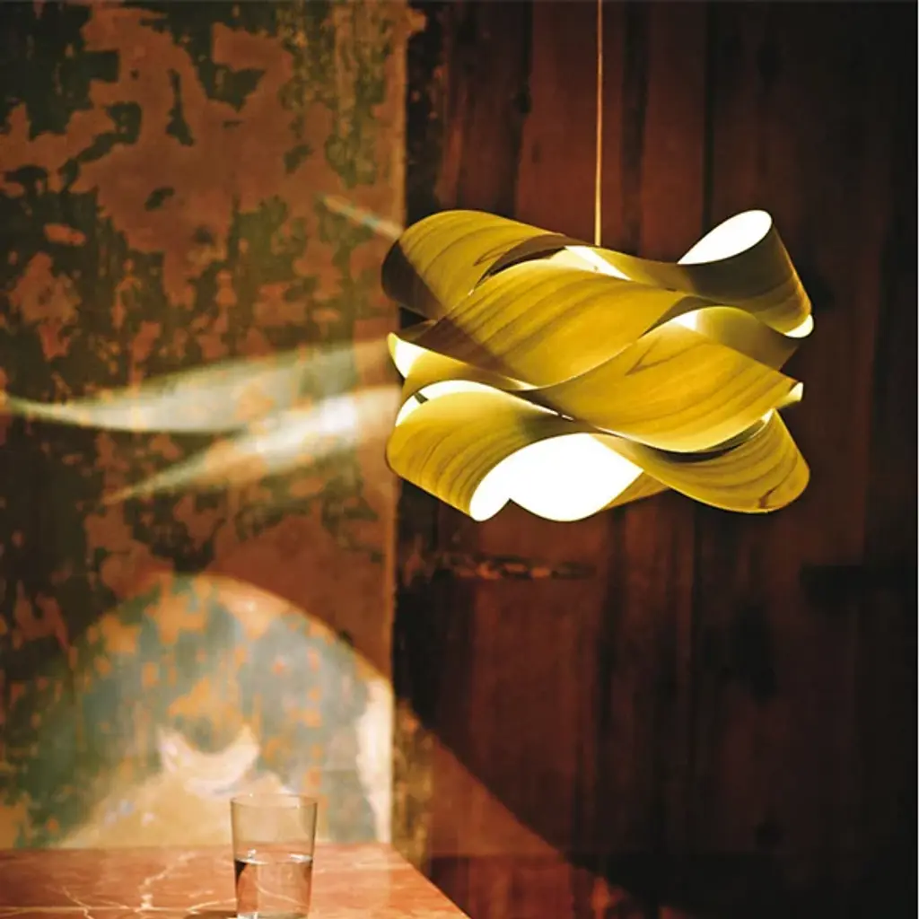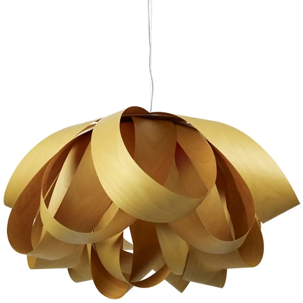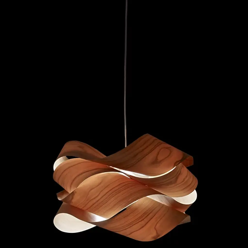 The Link Pendant from LZF represents designer Ray Power's exploration of repetition and geometric rhythm through the use of wood veneer. Power's design layers long strips of Timberlite veneer into flowing, interlocking curves that fold across the shade's surface. The pattern creates visual depth as light filters through varying densities of material, producing graduated tones from warm amber to deep shadow. This handcrafted piece earned the Good Design Award in 2008, highlighting Power's approach to pushing veneer construction into sculptural territory.