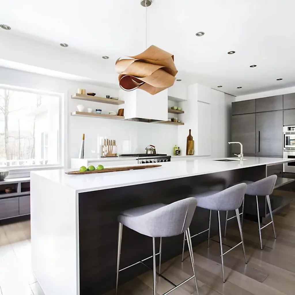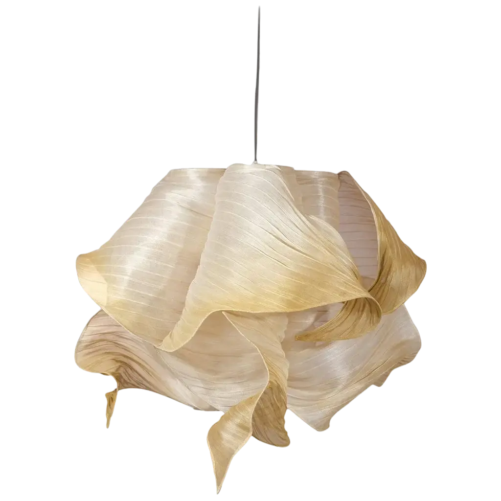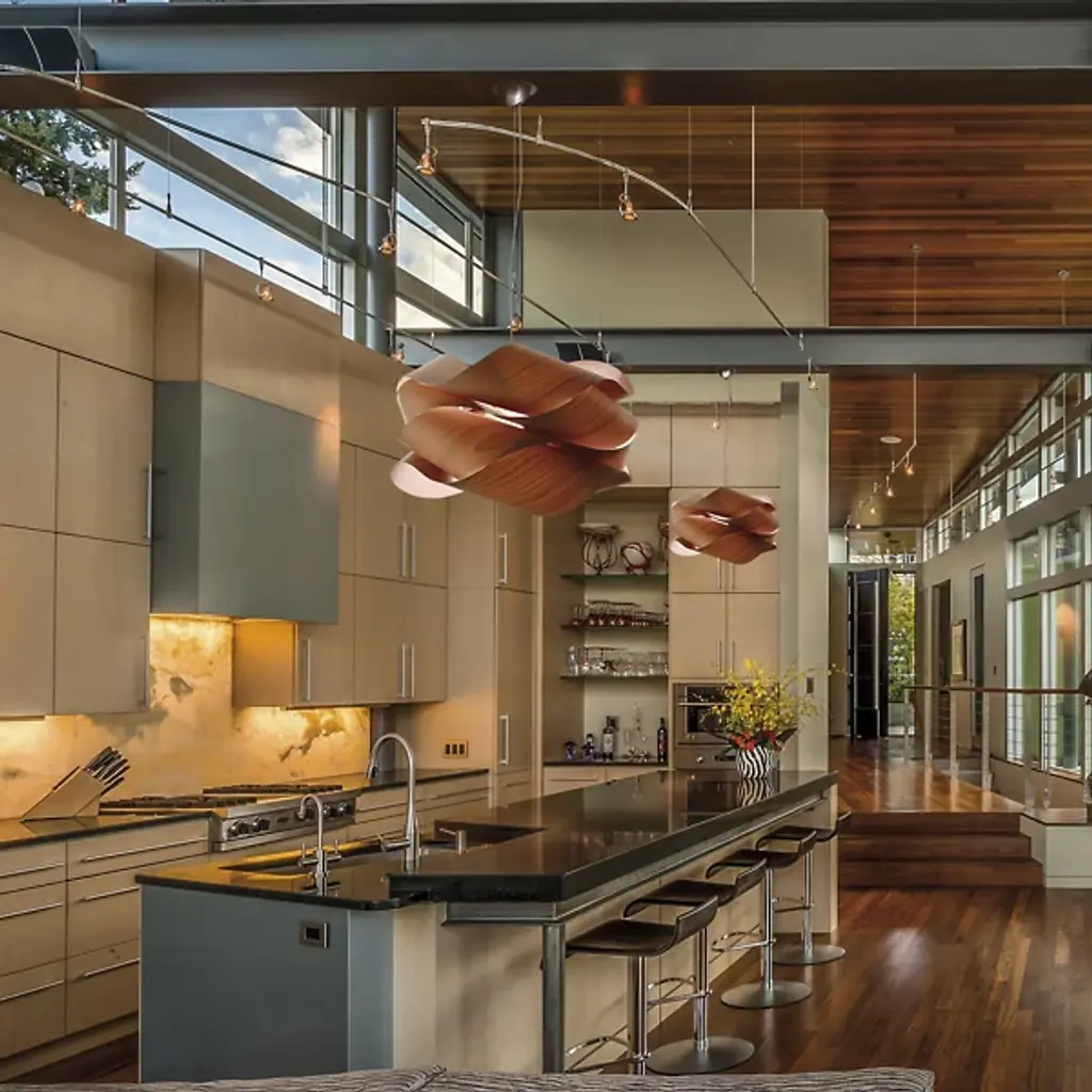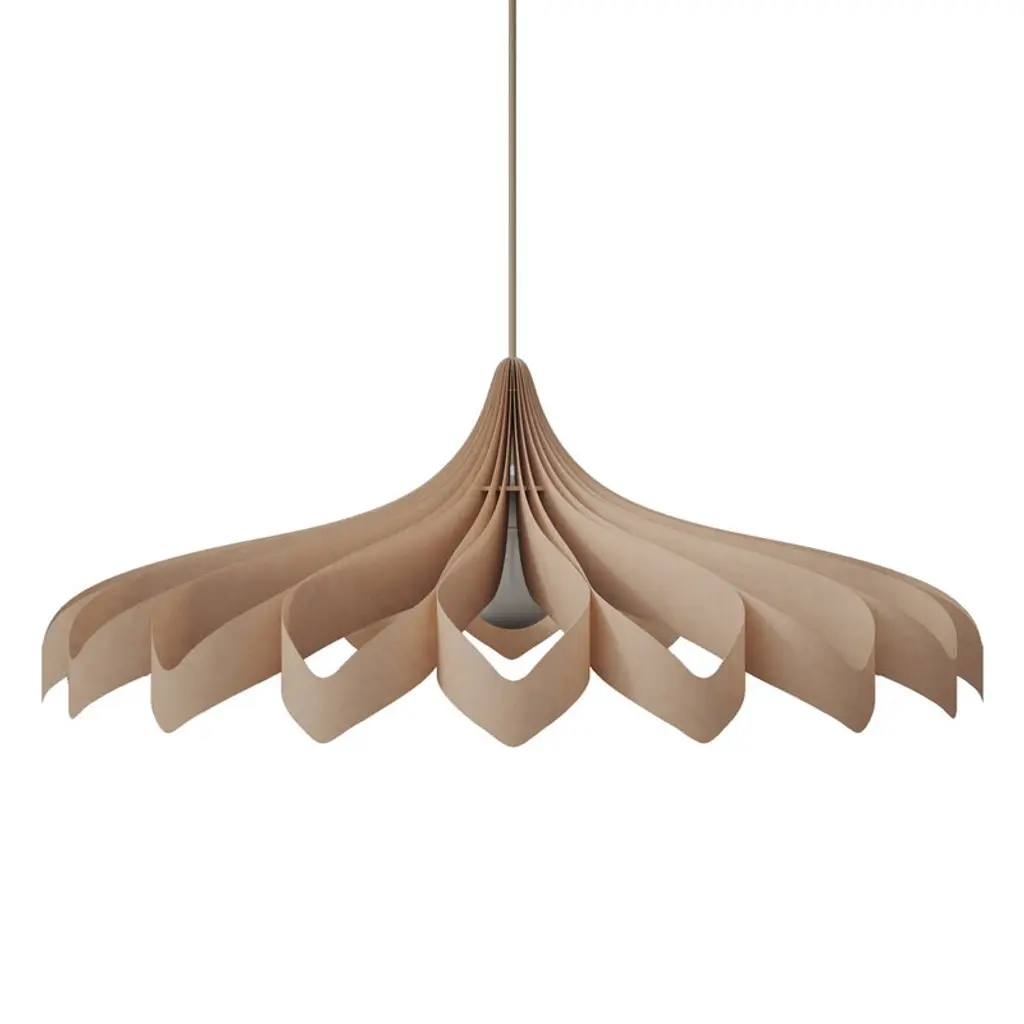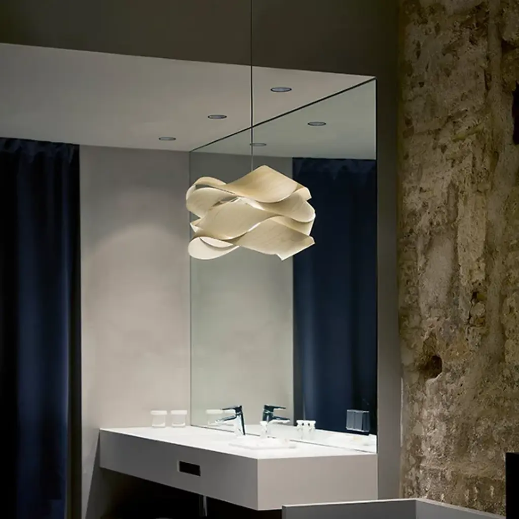 The Link Pendant from LZF represents designer Ray Power's exploration of repetition and geometric rhythm through the use of wood veneer. Power's design layers long strips of Timberlite veneer into flowing, interlocking curves that fold across the shade's surface. The pattern creates visual depth as light filters through varying densities of material, producing graduated tones from warm amber to deep shadow. This handcrafted piece earned the Good Design Award in 2008, highlighting Power's approach to pushing veneer construction into sculptural territory.