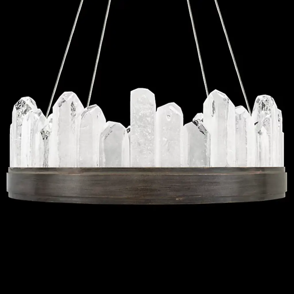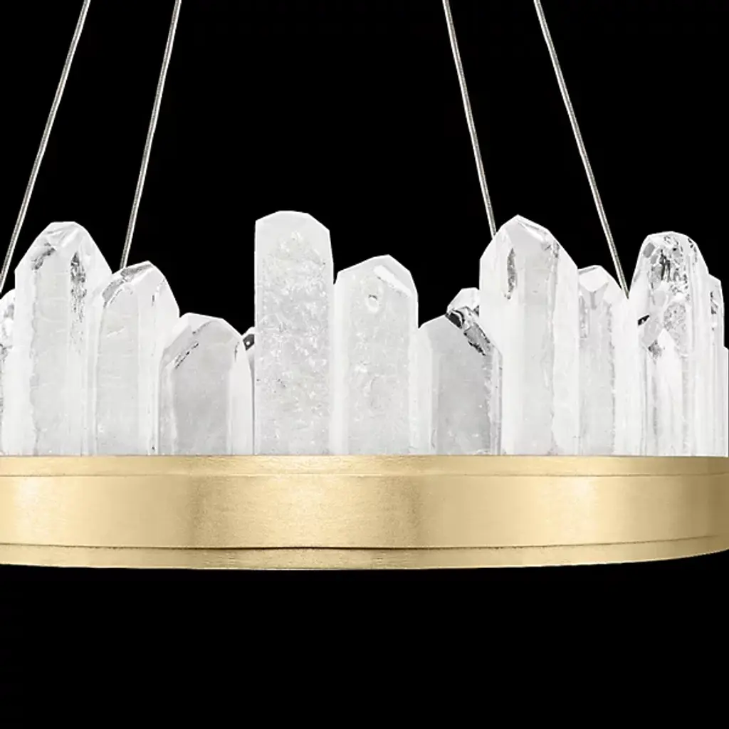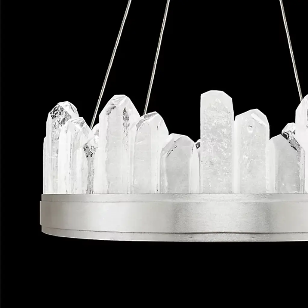 Displaying the beauty of natural stone and skill of master craftsmanship, the Lior Short Glass Pendant by Fine Art Lamps gives the home an enchanting accent. Glass spires are cut into crystal rock formations and set side by side at uneven heights for a striking silhouette. A smooth metal band anchors the glass and offers a sleek contrast to the raw nature of the faceted pieces. Integrated LED lights emit a warm and steady glow to illuminate the glass and bathe the room in a welcoming light.
