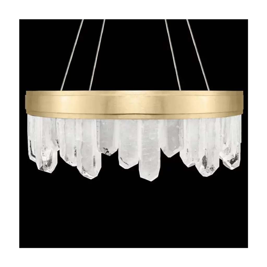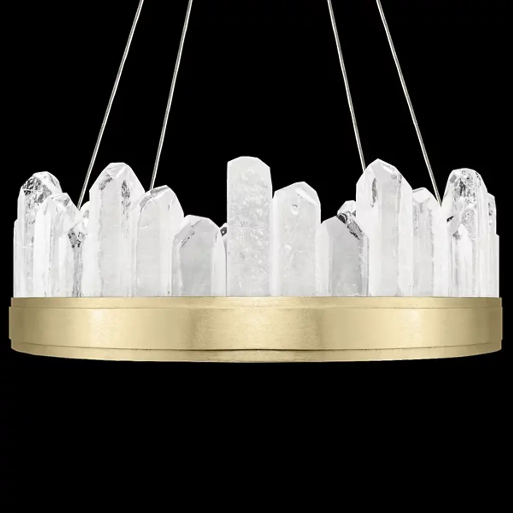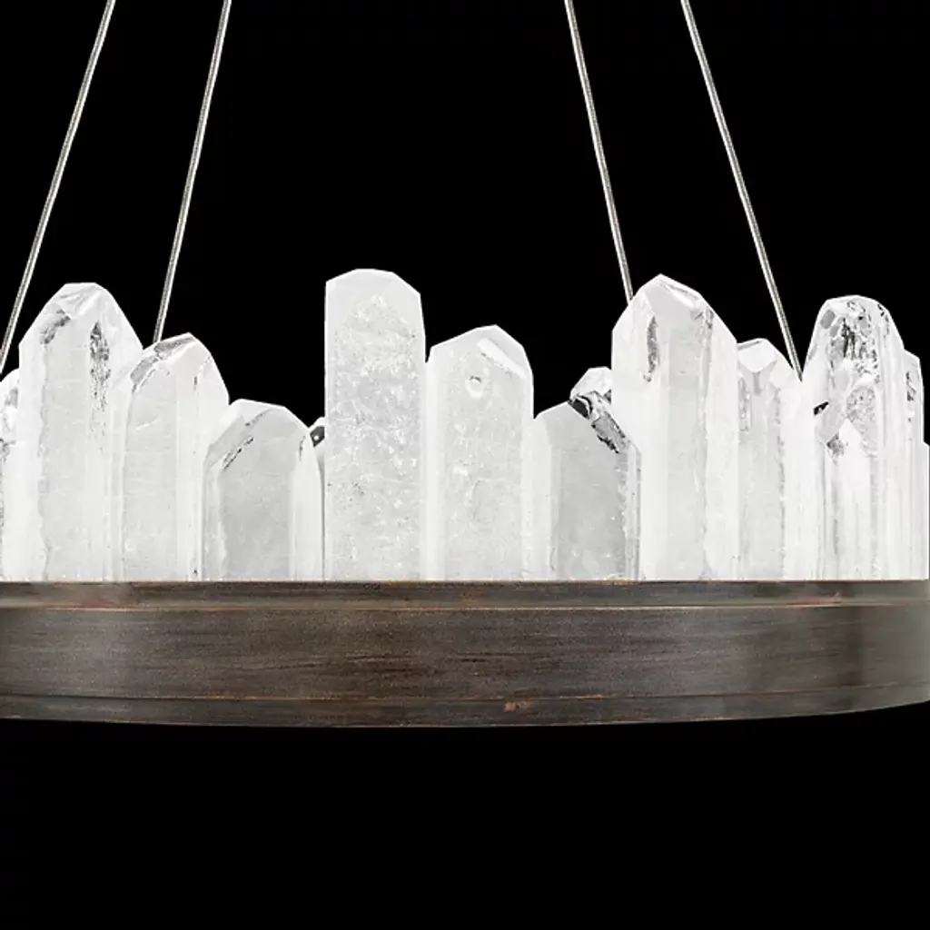 Displaying the beauty of natural stone and skill of master craftsmanship, the Lior Short Glass Pendant by Fine Art Lamps gives the home an enchanting accent. Glass spires are cut into crystal rock formations and set side by side at uneven heights for a striking silhouette. A smooth metal band anchors the glass and offers a sleek contrast to the raw nature of the faceted pieces. Integrated LED lights emit a warm and steady glow to illuminate the glass and bathe the room in a welcoming light.