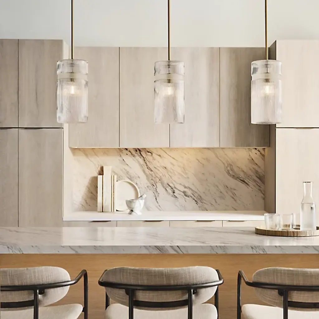 The Liouet Pendant from Visual Comfort Studio offers a study in glass textures and light manipulation. Crafted with ribbed glass that filters illumination into intricate patterns, this fixture brings a sense of movement and life to kitchens and dining areas. Drew & Jonathan Scott added some thoughtful metal details that break up its glass profile, creating a subtle design element. When lit, the pendant casts useful downward light exactly where you need it most for meal prep or dinner conversations. There's something distinctly Art Deco in this suspension’s inspiration, yet it feels completely at home in today's interiors.