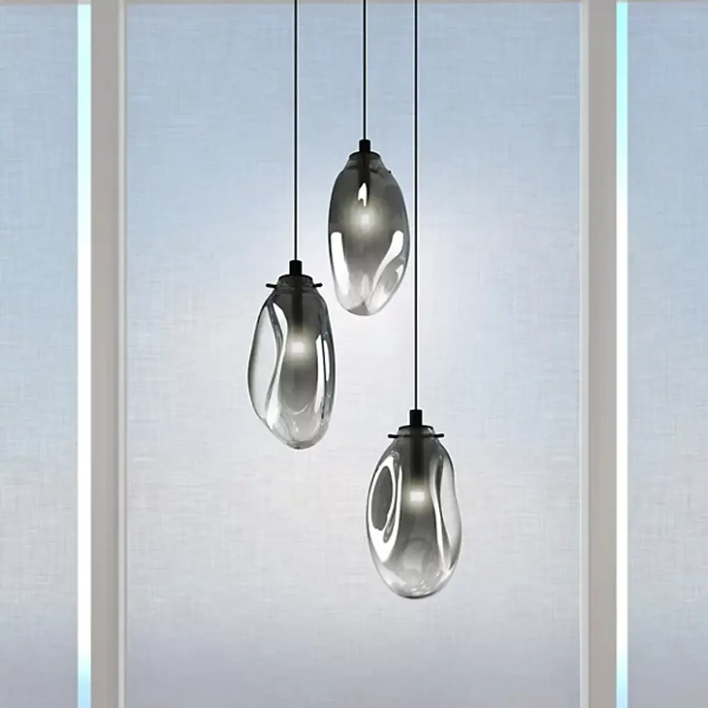 The SONNEMAN Lighting Liquid 3-Light Round Multi-Light Pendant puts an artisan spin on contemporary lighting. The glass form is an amorphous sculpture that has the softened look of melting glass. The visual weight of the piece is balanced with thin suspension cables, as well as minimal hardware. Each glass form contains an LED bulb, providing a single point source of light within the contoured volume.