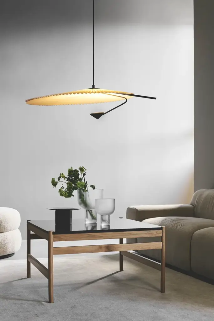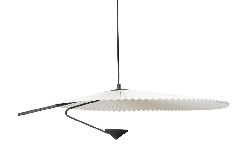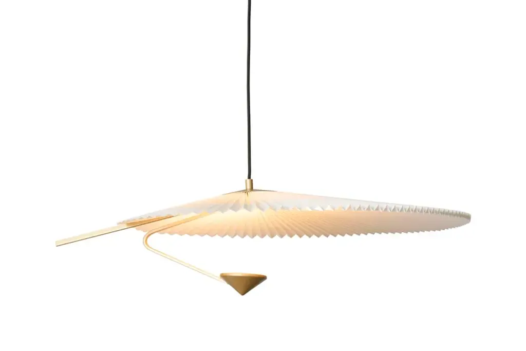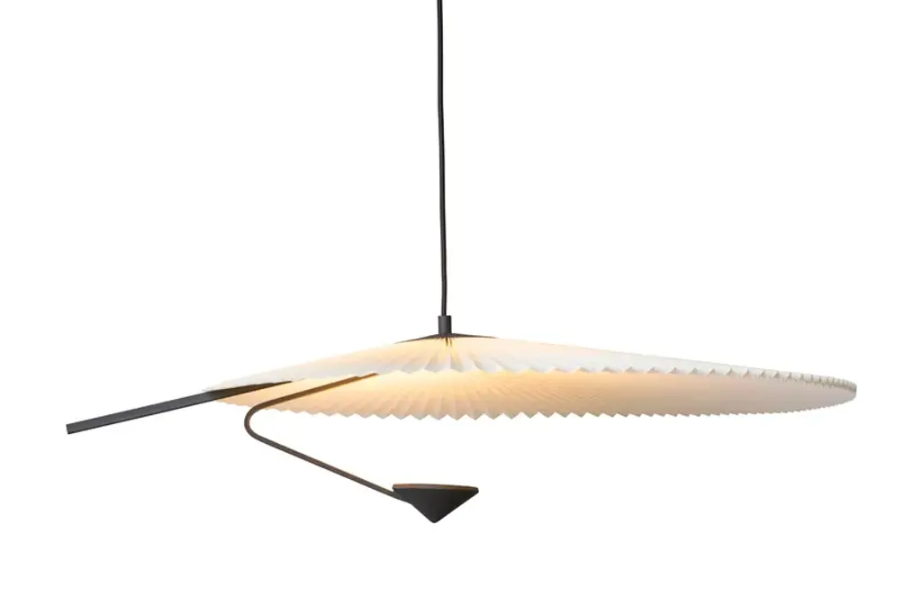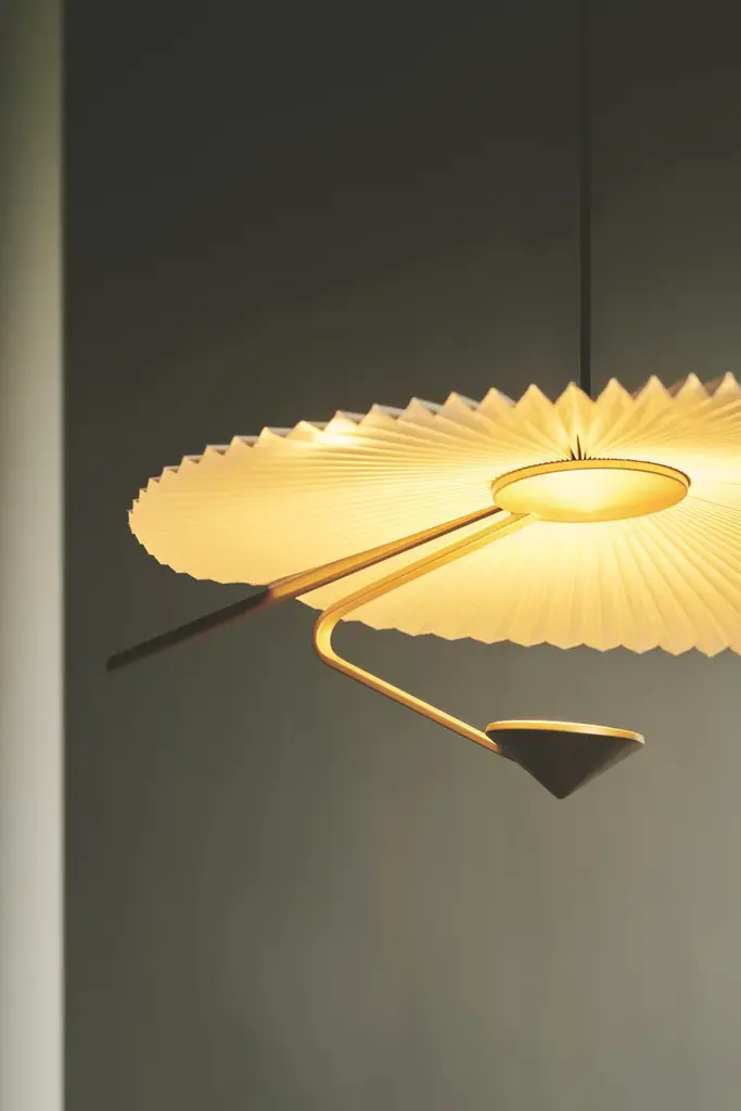Liris is a pendant lamp. It comes with the latest LED technology. The pendant is dimmable and comes with a canopy in the same colour as the lamp as well as a having a 3 meter textile cable. The Pendant has a unique look and expression. The light source cascades the light up to the lamp shade that cascades the light further out in the room primarily beneath but also a little upwards through the lamp shade. The lamp shade is Ø70cm and are made of a cotton laminated PVC material. The white PVC surface underneath cascades the light very well, while the white cotton surface on touch gives the lamp a more exclusive look. The Liris collection represents the culmination of an intensive design process, research, and craftsmanship, embodying Gejst Design’s DNA of functionality and aesthetic expertise. Created with precision and care, Liris is poised to establish itself at a high level in decorative lighting solutions. Design duo Thalea Schmalenberg and Kasper Fris Egelund found inspiration in the elegance of the traditional paper fan. Their fascination with its simple and poetic expression, as well as its materials and interactive properties, sparked the creation of their design concept: Liris. Beginning with a table lamp, the concept evolved into a comprehensive collection featuring pendant, floor, wall, and table lamps. The aim was to blend the playful, handcrafted essence of a fan with a modern industrial foundation. By enhancing light quality through the integration of a small elevated LED light source, they transformed the folded fan into both a lampshade and a reflector. When positioned against a wall, the lamp emits a soft, evenly dispersed ambient glow. The fusion of Liris’ timeless craftsmanship with modern technology resulted in a collection that resonates with both craftsmanship, tradition, and modern aesthetics.
