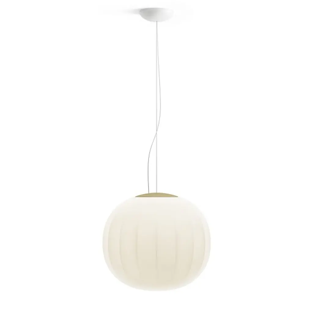 The Lita Medium Pendant from Luceplan showcases a strong material presence, merging traditional craftsmanship with contemporary technical innovation. Its opaline-blown glass diffuser, adorned with delicate vertical cusps that gently fade at the edges, offers a soft, textured surface. This timeless design captivates with its harmonious blend of visual and tactile appeal. The pendant's elegant brass finish adds a refined touch, making it a distinctive and sophisticated addition to any interior space.