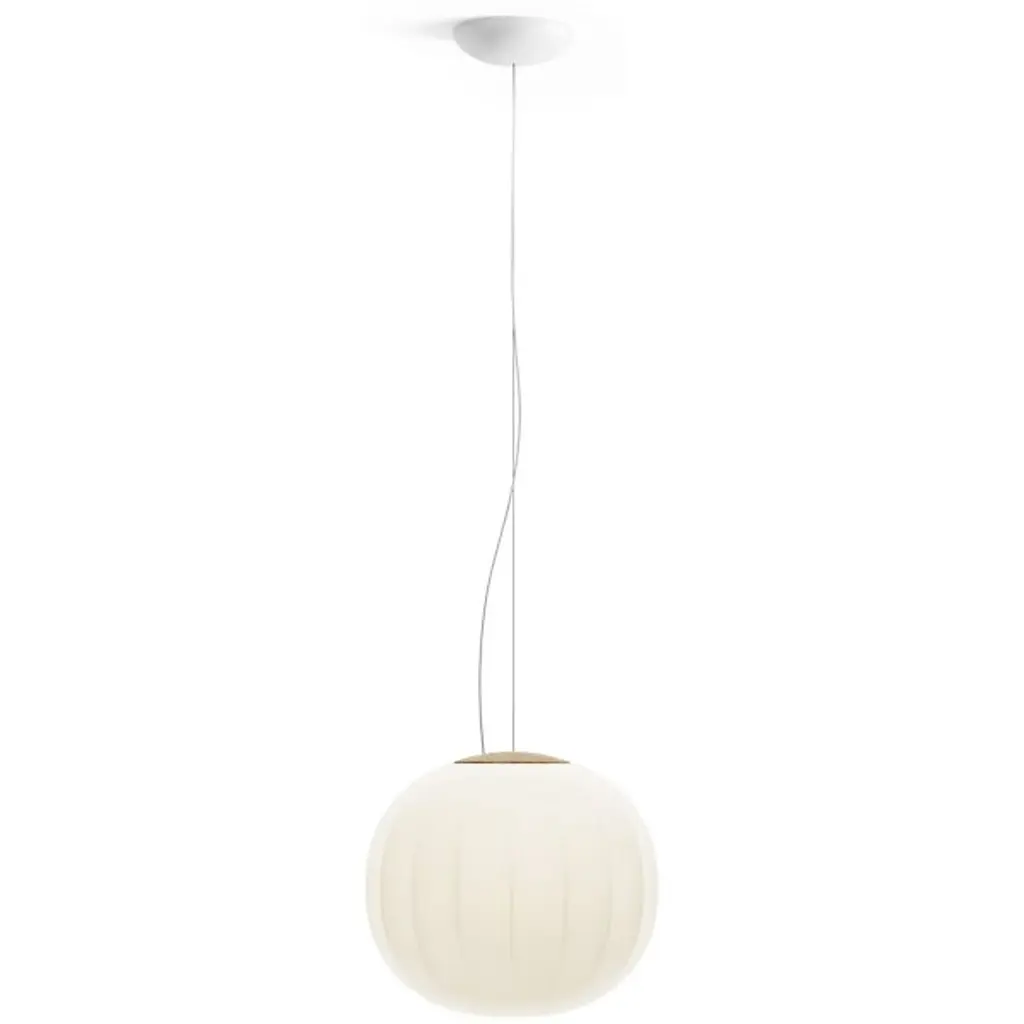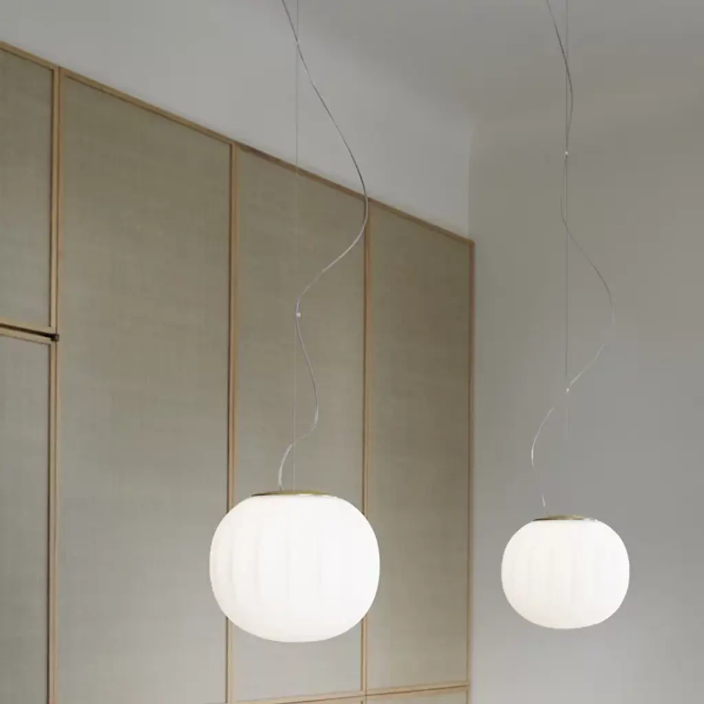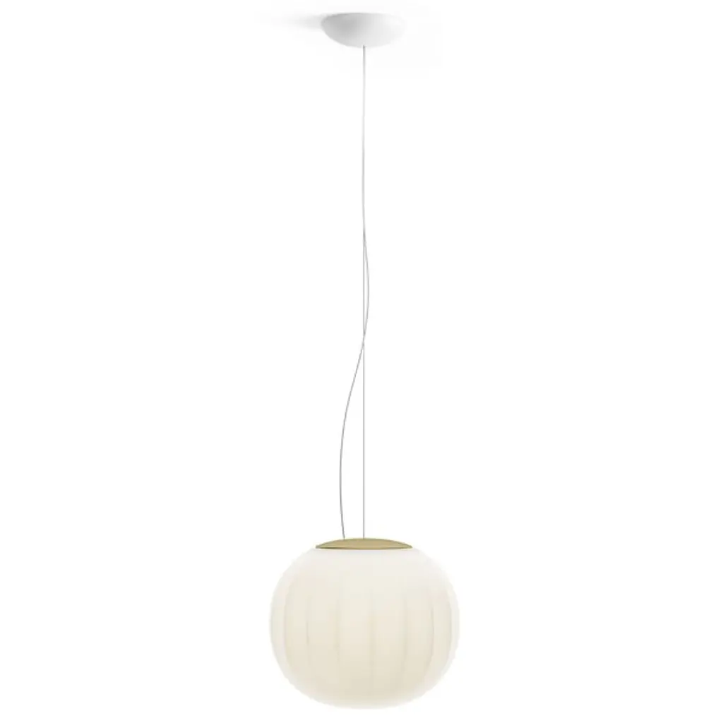 The Lita Mini Pendant from Luceplan features a strong material character that blends traditional craftsmanship with modern technical research. It has an opaline-blown glass diffuser with subtle vertical cusps that fade at the edges, creating a soft, textured surface. This timeless piece is designed to captivate with its combination of visual and tactile appeal. The elegant brass finish adds a refined touch, making it a distinctive and sophisticated addition to any space.