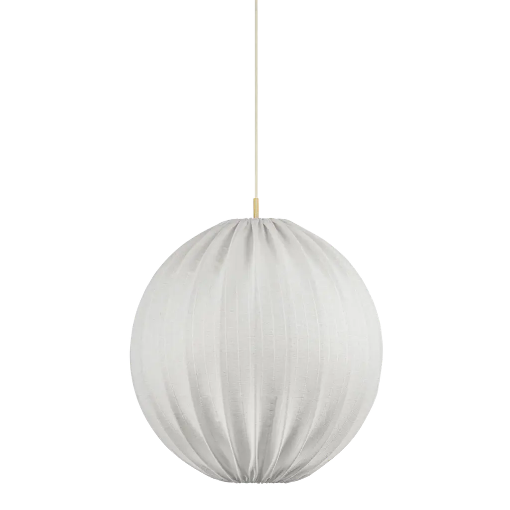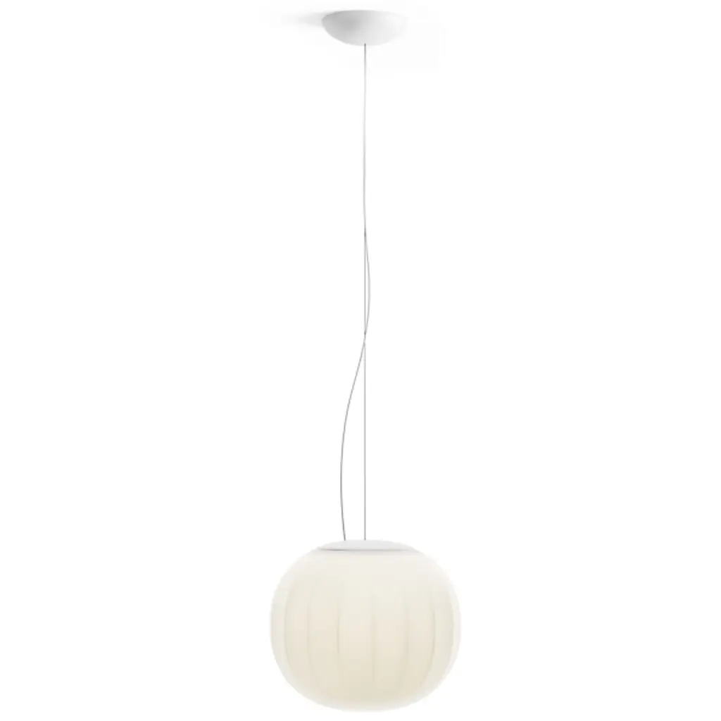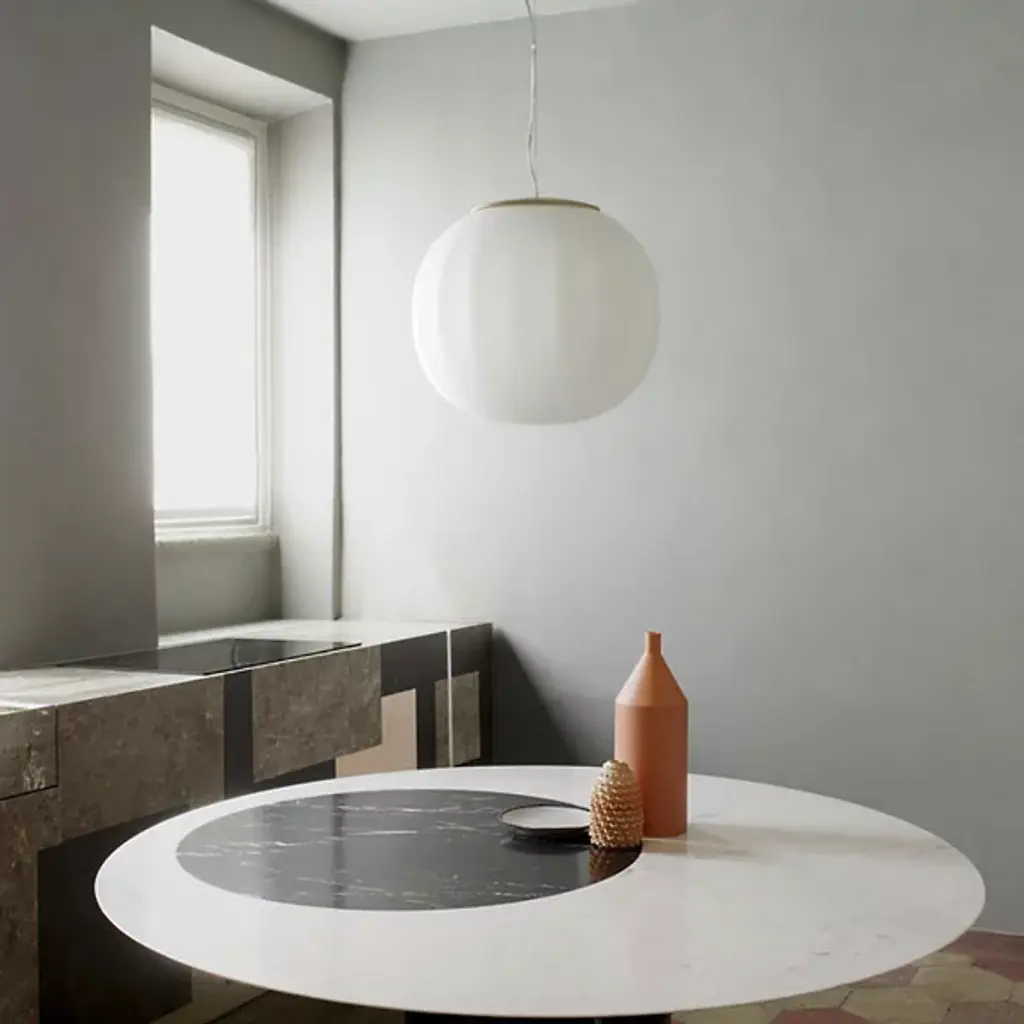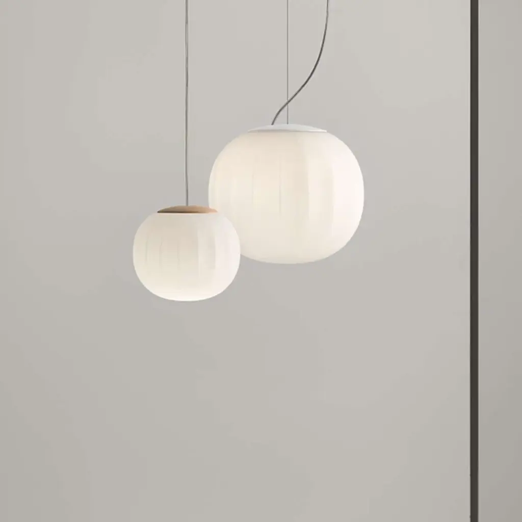 The Lita Mini Pendant from Luceplan features a strong material character that blends traditional craftsmanship with modern technical research. It has an opaline-blown glass diffuser with subtle vertical cusps that fade at the edges, creating a soft, textured surface. This timeless piece is designed to captivate with its combination of visual and tactile appeal. The elegant brass finish adds a refined touch, making it a distinctive and sophisticated addition to any space.