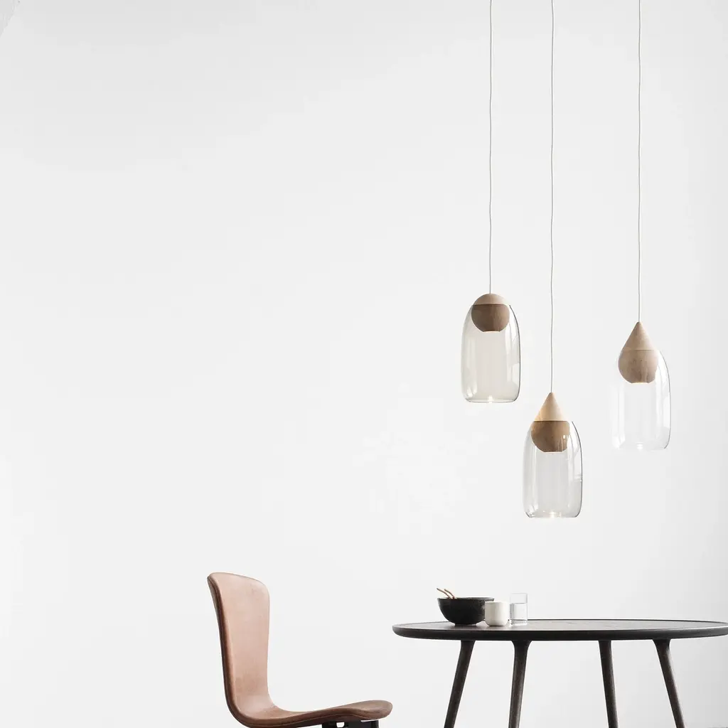 For her Liuku pendant, Finnish designer Maija Puoskari tops her wooden ball light with a magical colored shade in mouth-blown glass. With a long-life, energy-saving LED built in, the base component is made of FSC-certified linden wood. Liuku’s shade is available in clear glass or in beautiful tones of either smoke or gradient violet.