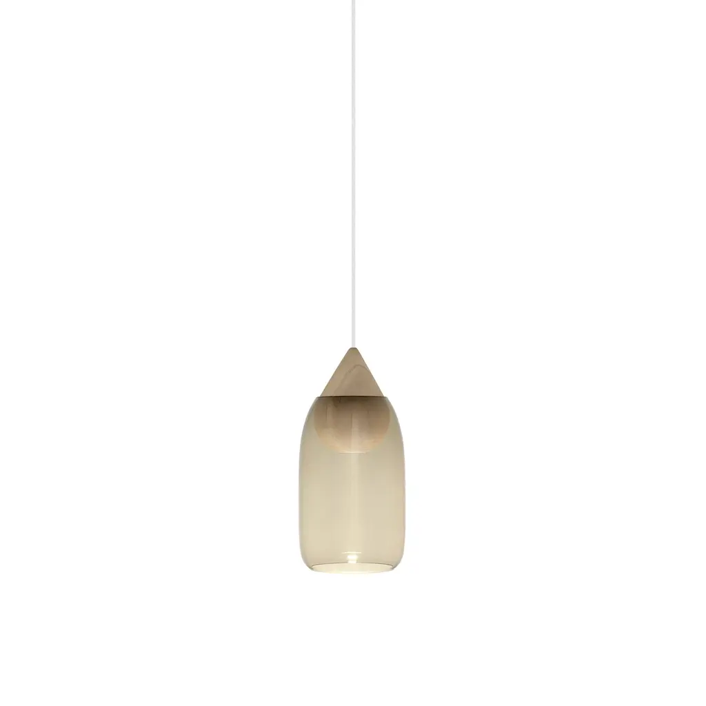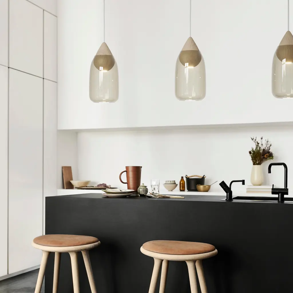 Liuku is a contemporary pendant light that reflects Finnish designer Maija Puoskari's ongoing fascination with nature. Originally trained as a florist, Maija abstracts a flower shape with her combination of a wooden drop fixture with a mouth-blown glass shade. The sustainably produced, FDC-certified alder wood component hides a long-life LED light source while the Liuku shade is available in either clear glass or striking tones of smoke or gradient violet. For additional versatility, the wooden fixture can be used on its own, as a single pendant or in clusters, for both residential and commercial spaces.